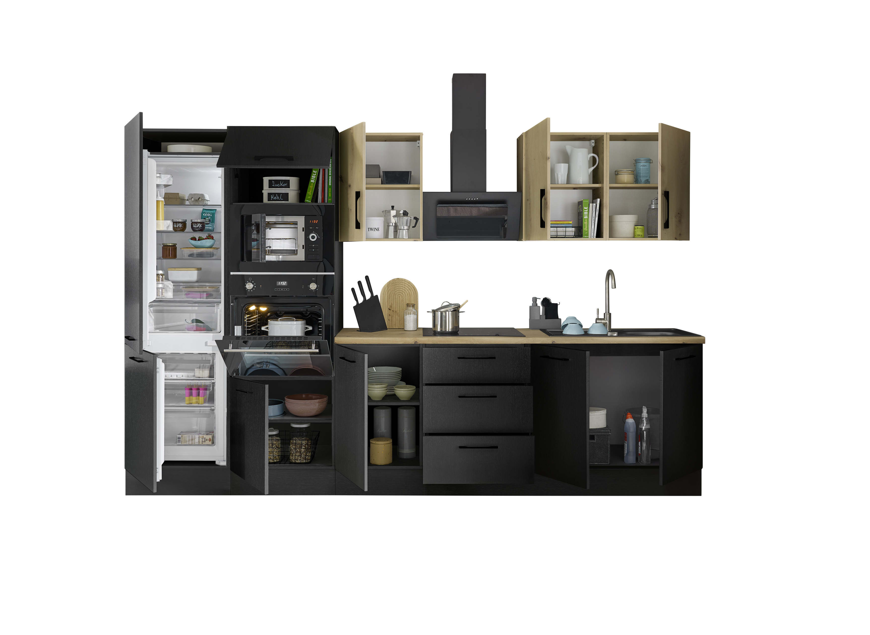 Front und Korpus: schwarz matt woodprint kombiniert mit Spanplatte Artisan Eiche Holznachbildung melaminbeschichtet