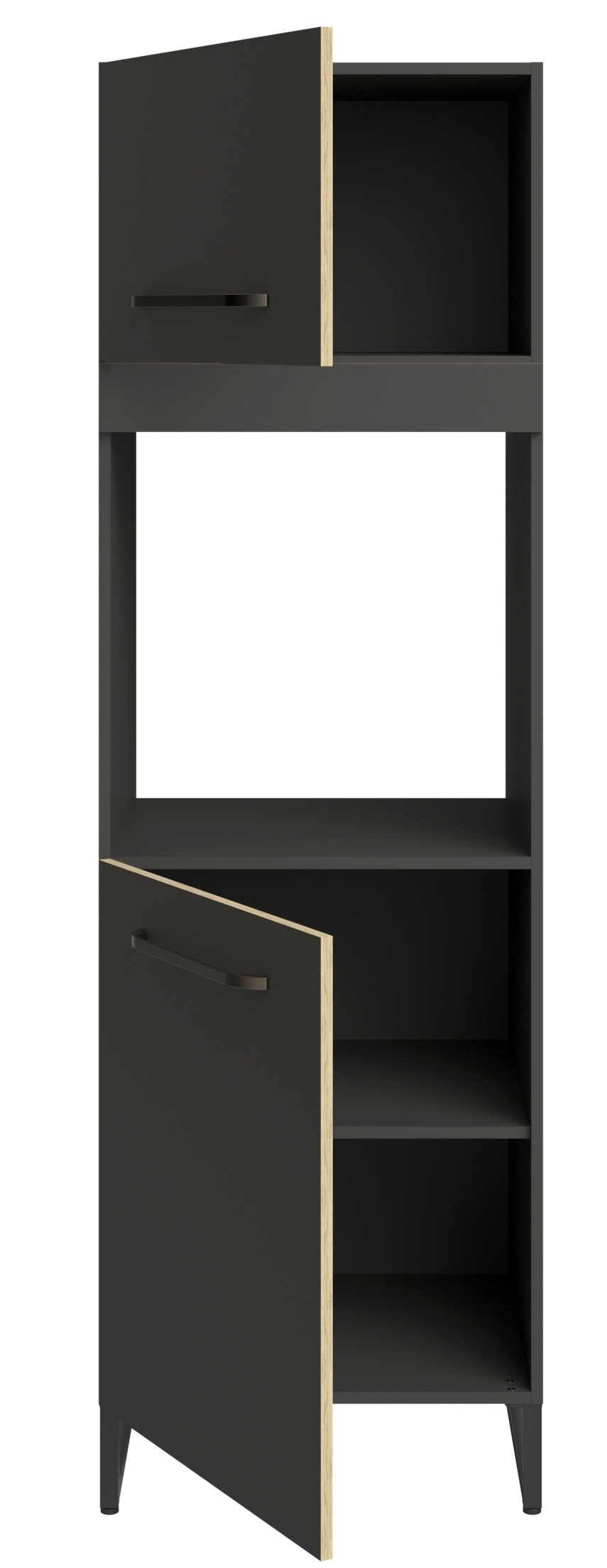 1 Hochschrank mit oben 1 Tür (dahinter 1 Fach), mittig 1 Backofenfach, unten 1 Tür (dahinter 2 Fächer)