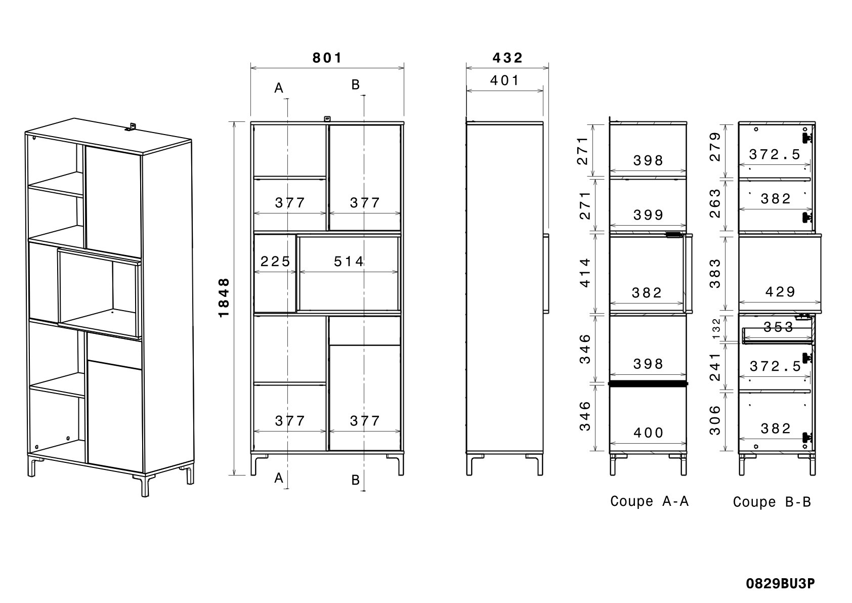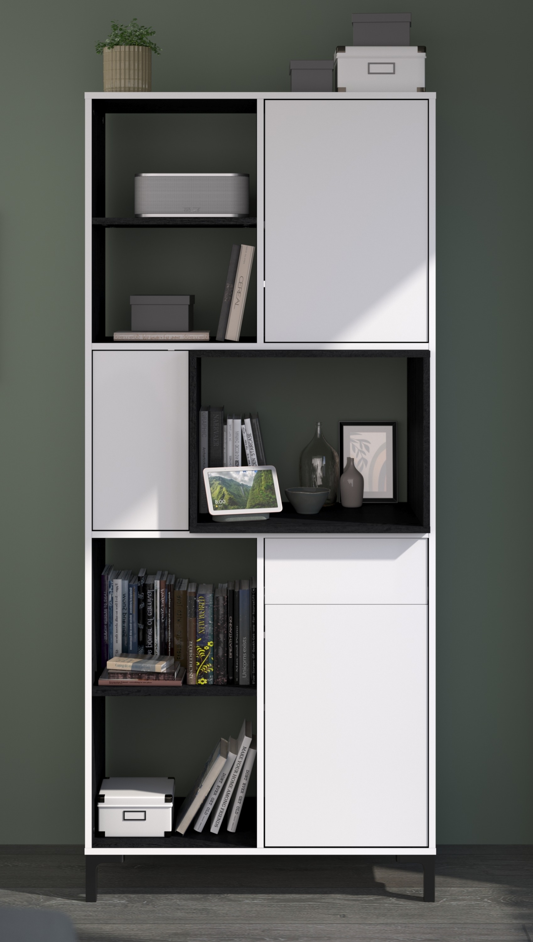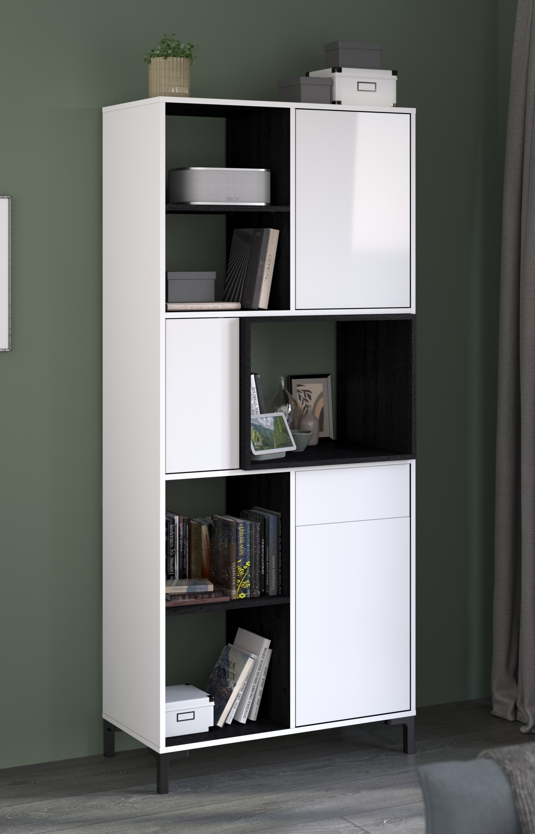 unten: 2 Fächer, 1 Schubkasten, 1 Tür (dahinter 2 Fächer)