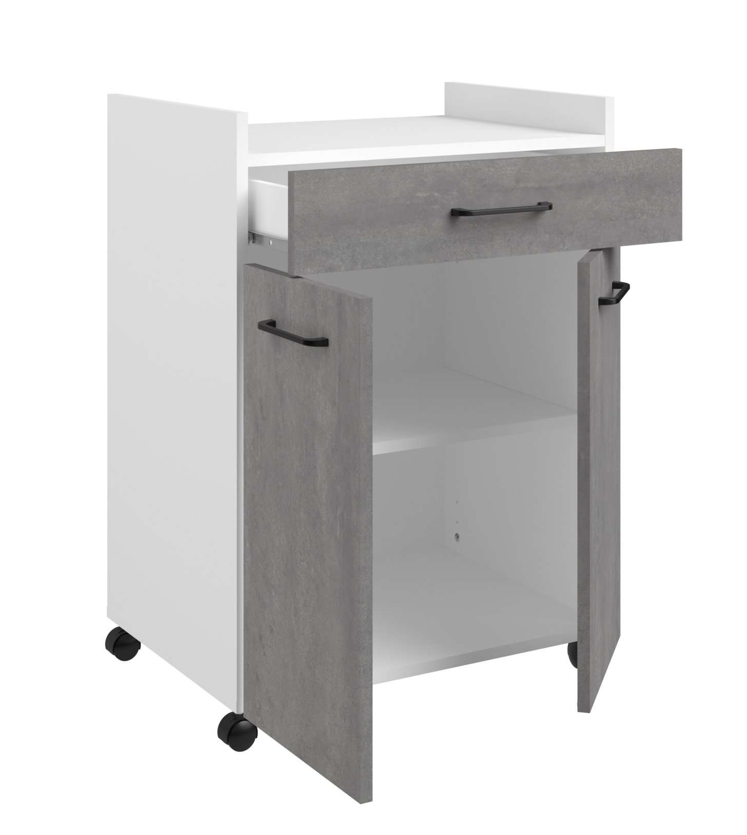 unten links: 1 Schubkasten, darunter 2 Türen, dahinter 2 Fächer