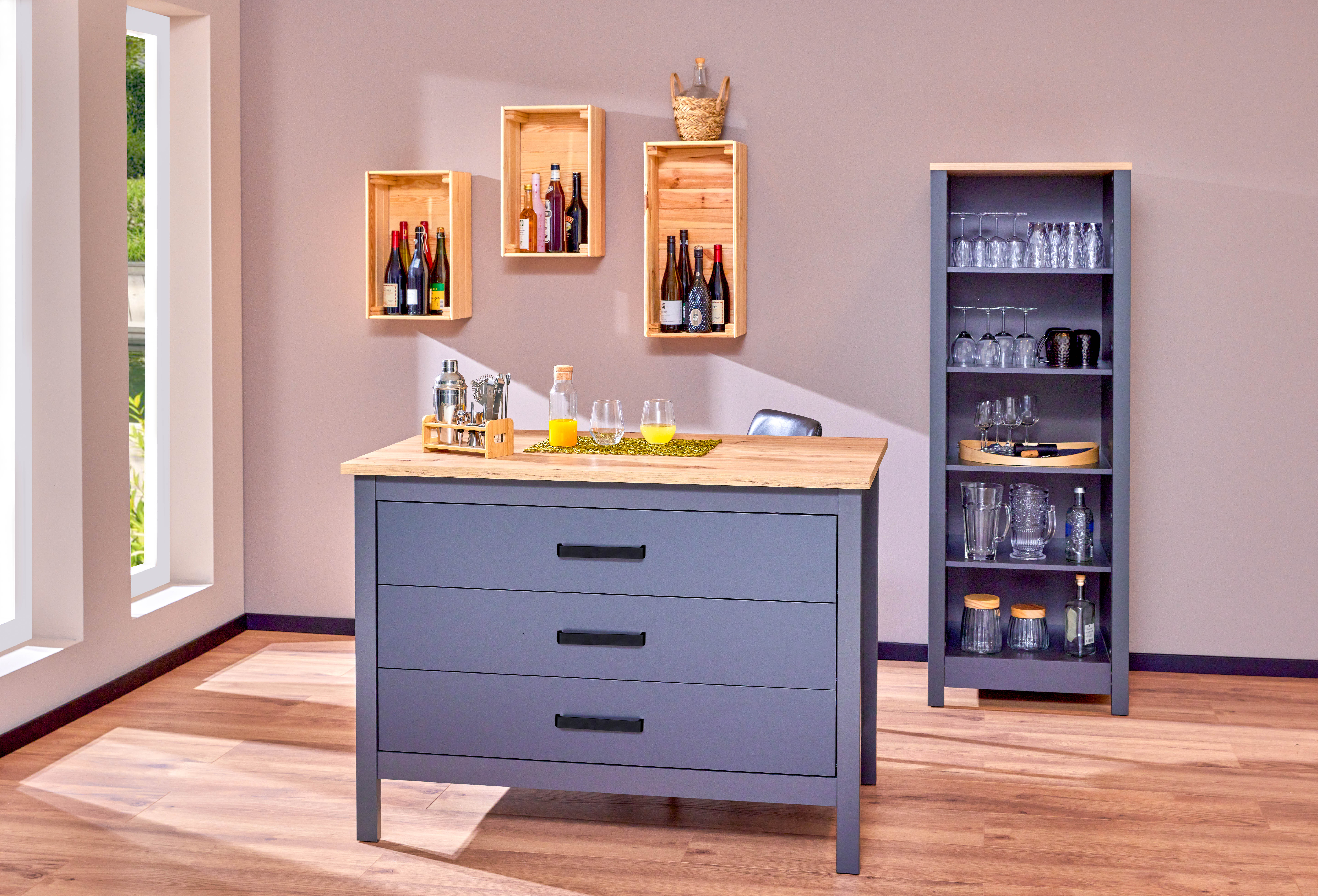 Die Höhe von 91,5 cm ist perfekt, um zwei hohe Hocker auf einer Seite zu platzieren und dort bequem zu essen. Auf der anderen Seite können Sie Ihre Küchenutensilien und Geschirr dank der drei geräumigen Schubladen stets griffbereit aufbewahren.