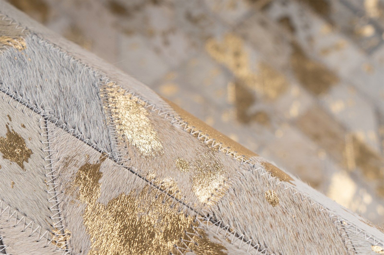 Der hochwertig verarbeitete Teppich ist in jeweils drei verschiedenen Farben und Größen erhältlich und fällt durch sein besonderes Design und die natürlichen Materialien auf. Die metallischen Effekte machen den ansprechenden Kurzflorteppich aus Rindleder zu einem Blickfang in jedem Zimmer.