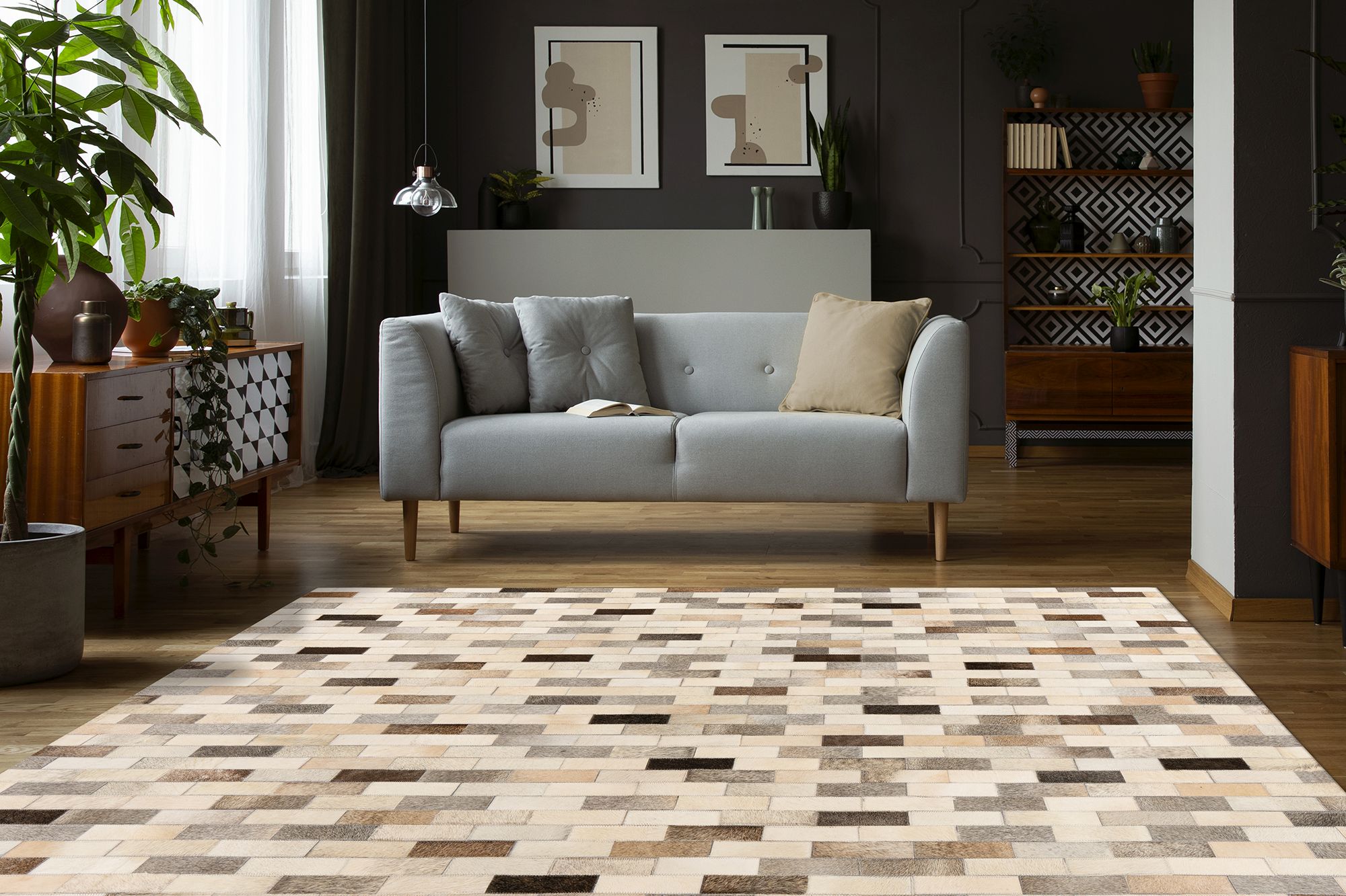 Der hochwertig verarbeitete Teppich ist in jeweils drei verschiedenen Farben und Größen erhältlich und fällt durch sein besonderes Design und die natürlichen Materialien auf. Die metallischen Effekte machen den ansprechenden Kurzflorteppich aus Rindleder zu einem Blickfang in jedem Zimmer.