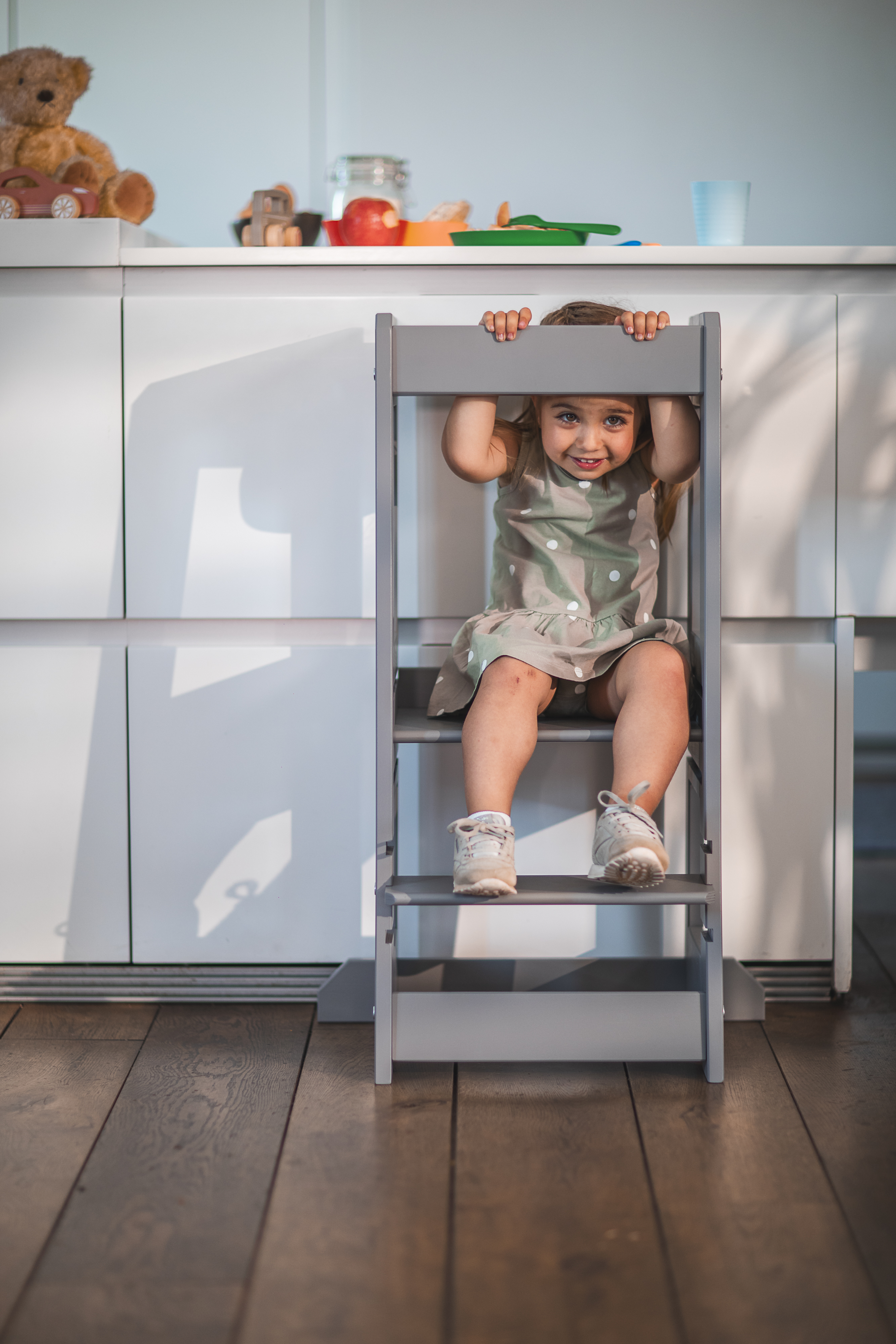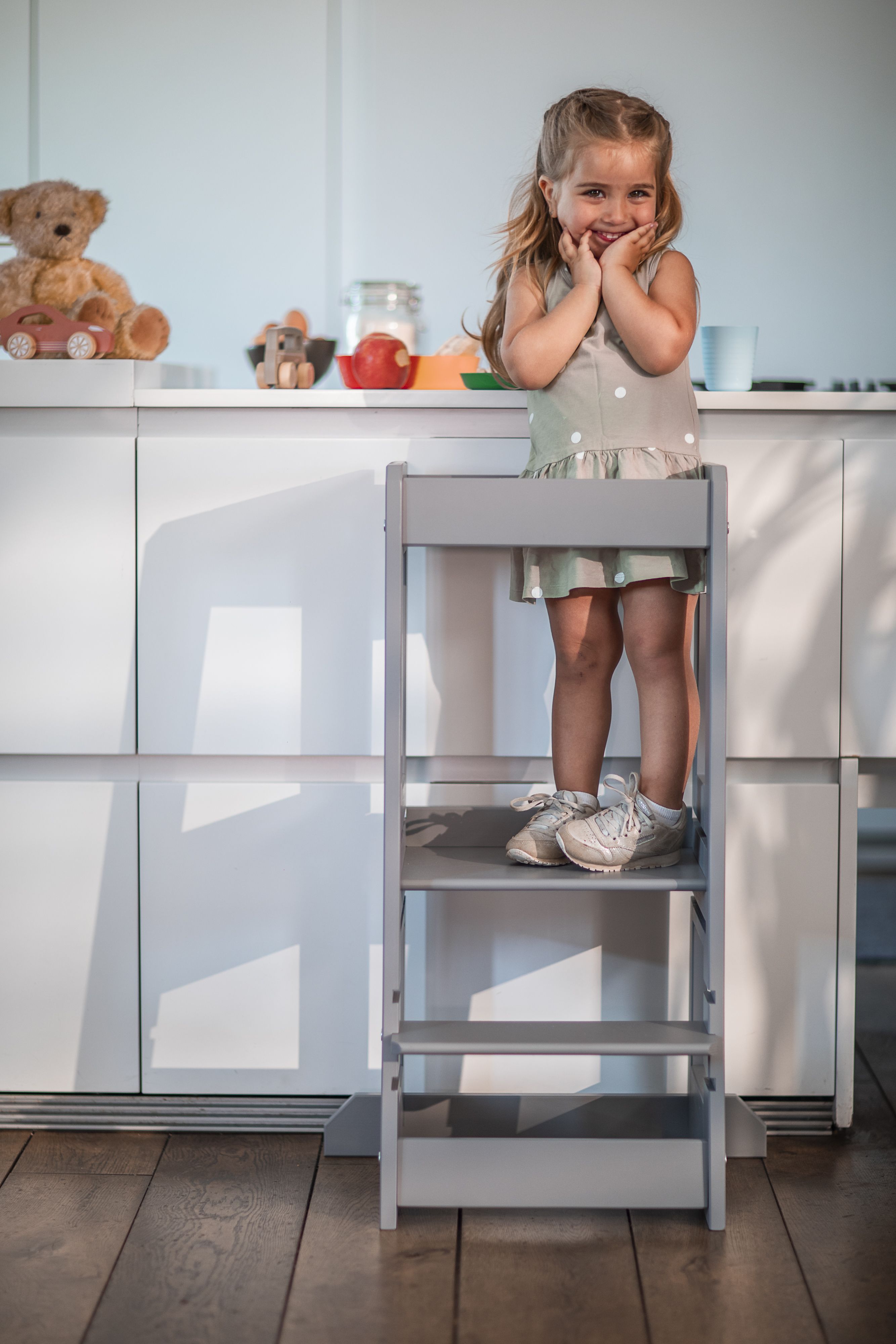 mitwachsend - schon die Kleinsten können auf Augenhöhe mit an der Küchenarbeitsplatte stehen und beim Kochen helfen.