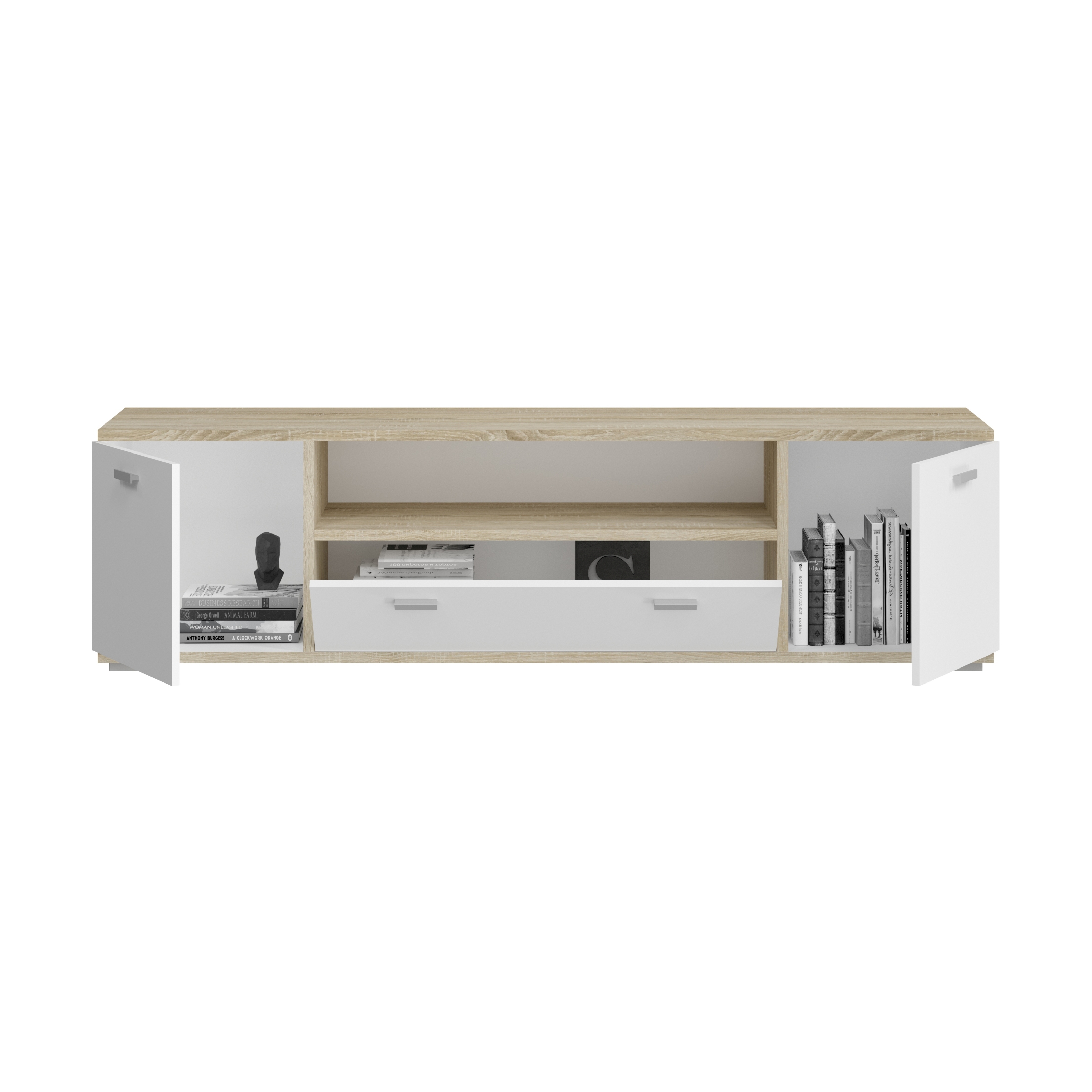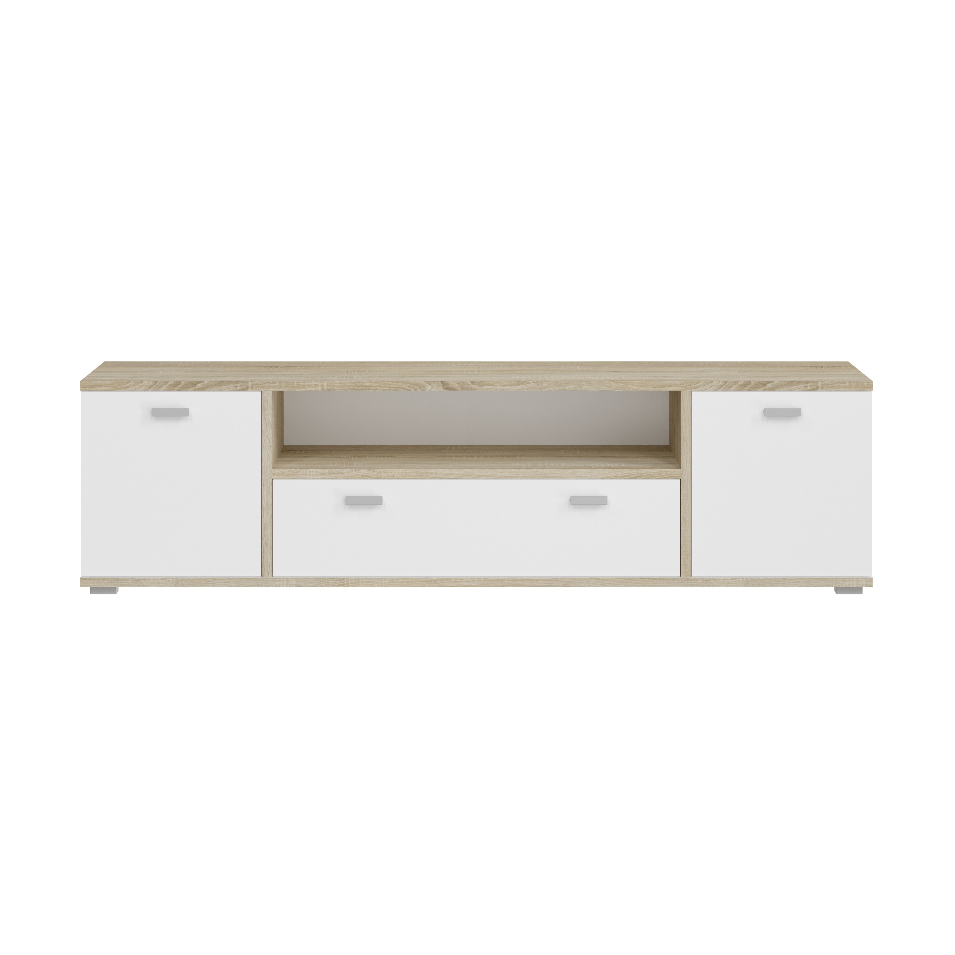 - Design/Stil: Modernes Lowboard mit einem ansprechenden Kontrast zwischen weiß und Sonoma Eiche hell , das einen zeitgemäßen und vielseitigen Look für das Wohnzimmer bietet.