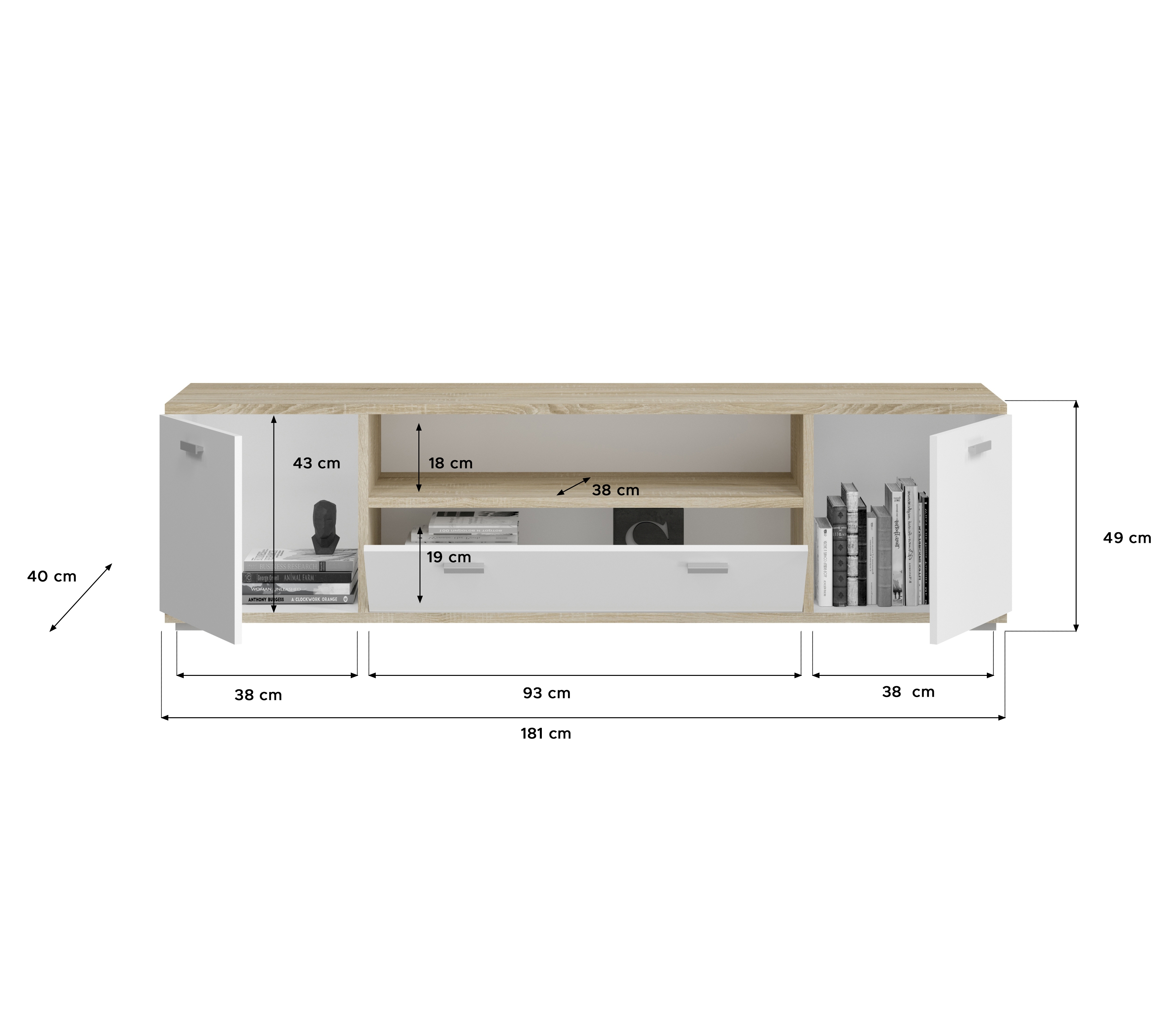 Erleben Sie raffinierte Eleganz mit unserem Lowboard, das die zeitlose Schönheit von strahlendem Weiß Nachbildung mit der Wärme von Sonoma Eiche hell Nachbildung vereint. Mit großzügigen Abmessungen von 181x49x40 cm bietet es nicht nur ausreichend Platz für Ihre Multimedia-Geräte, sondern setzt auch stilvolle Akzente in Ihrem Wohnbereich. Tauchen Sie ein in eine Welt des modernen Designs und schaffen Sie einen ansprechenden Mittelpunkt für Ihr Zuhause.