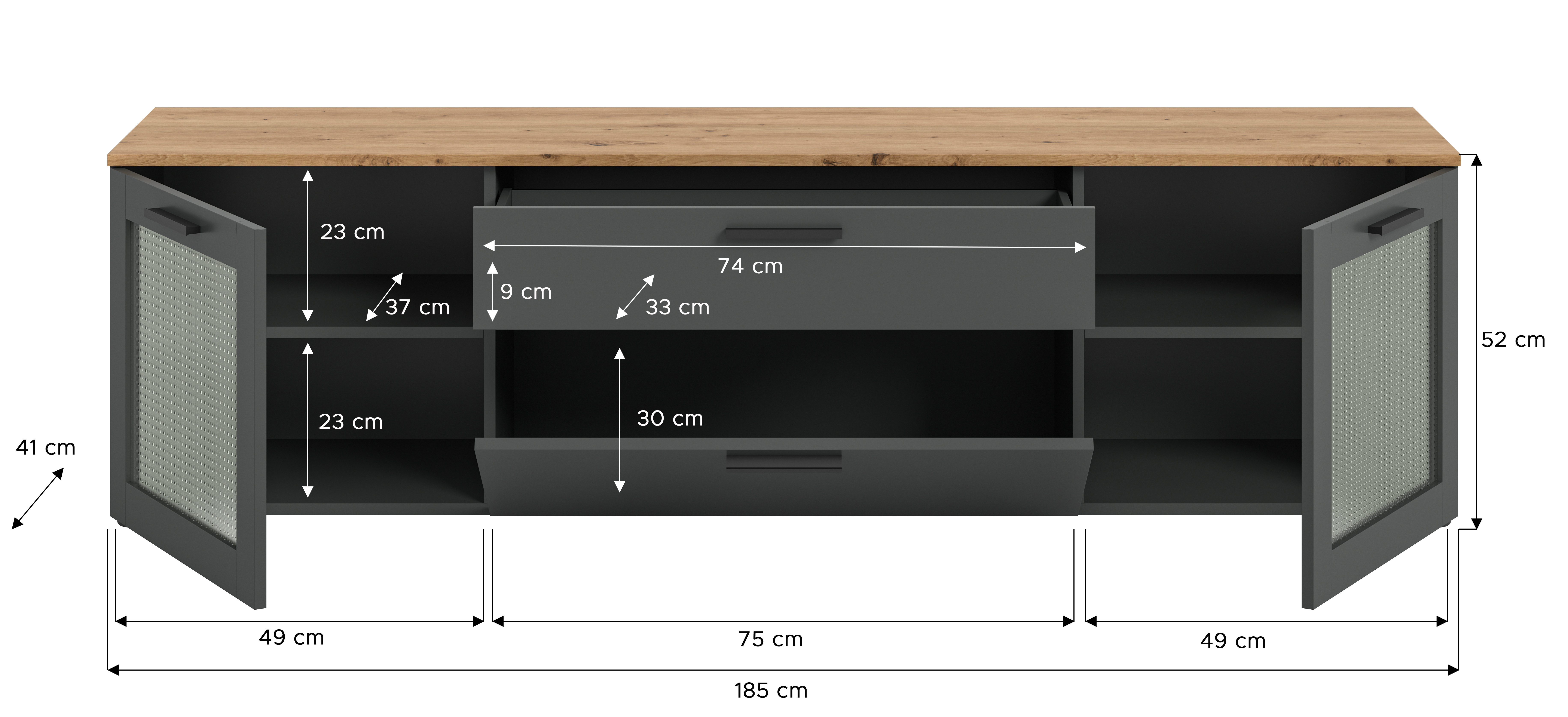 - Funktionalität: Mit großzügigem Stauraum hinter Türen, einer Klappe und einem Schubkasten bietet das Lowboard ausreichend Platz zur Aufbewahrung von verschiedenen Gegenständen wie Kleidung, Büchern, Dokumenten oder anderen persönlichen Utensilien.