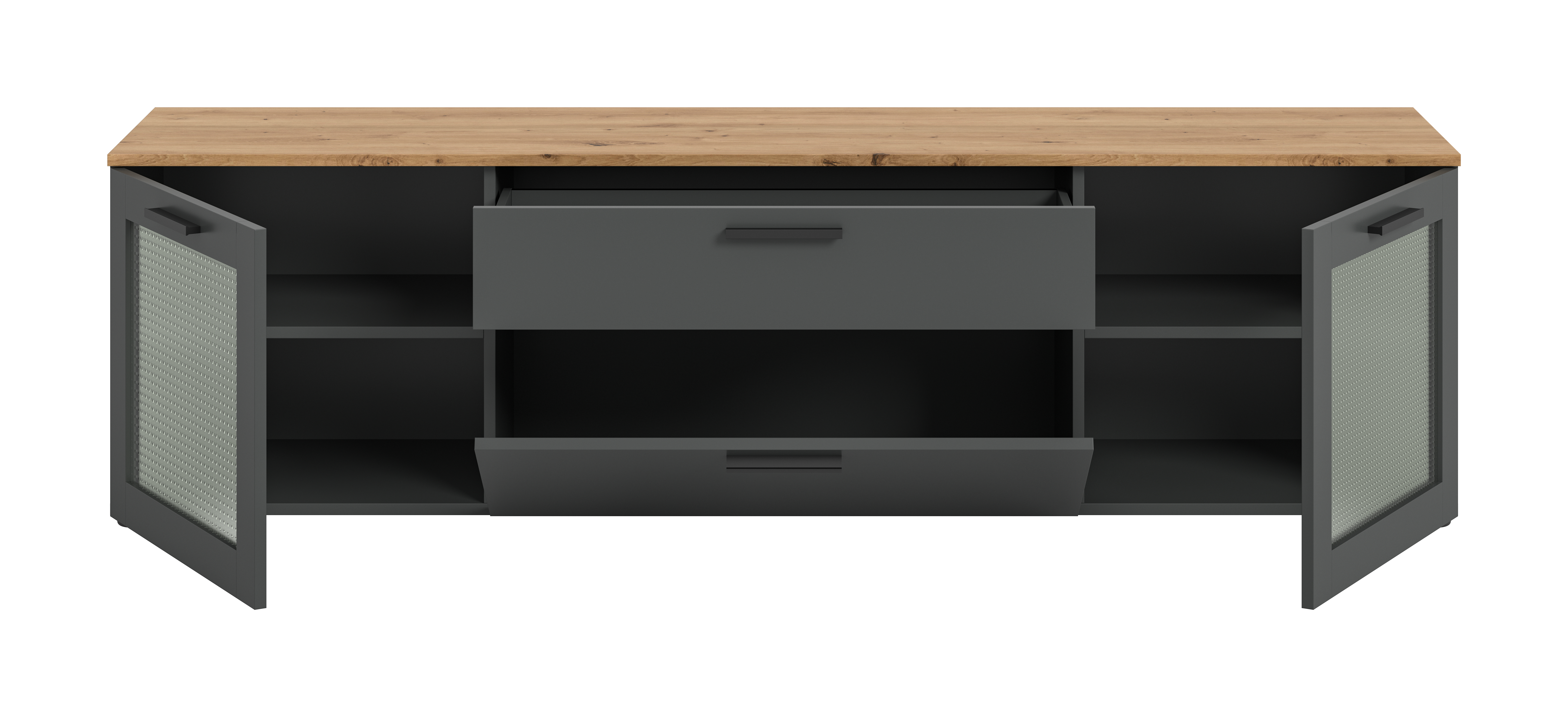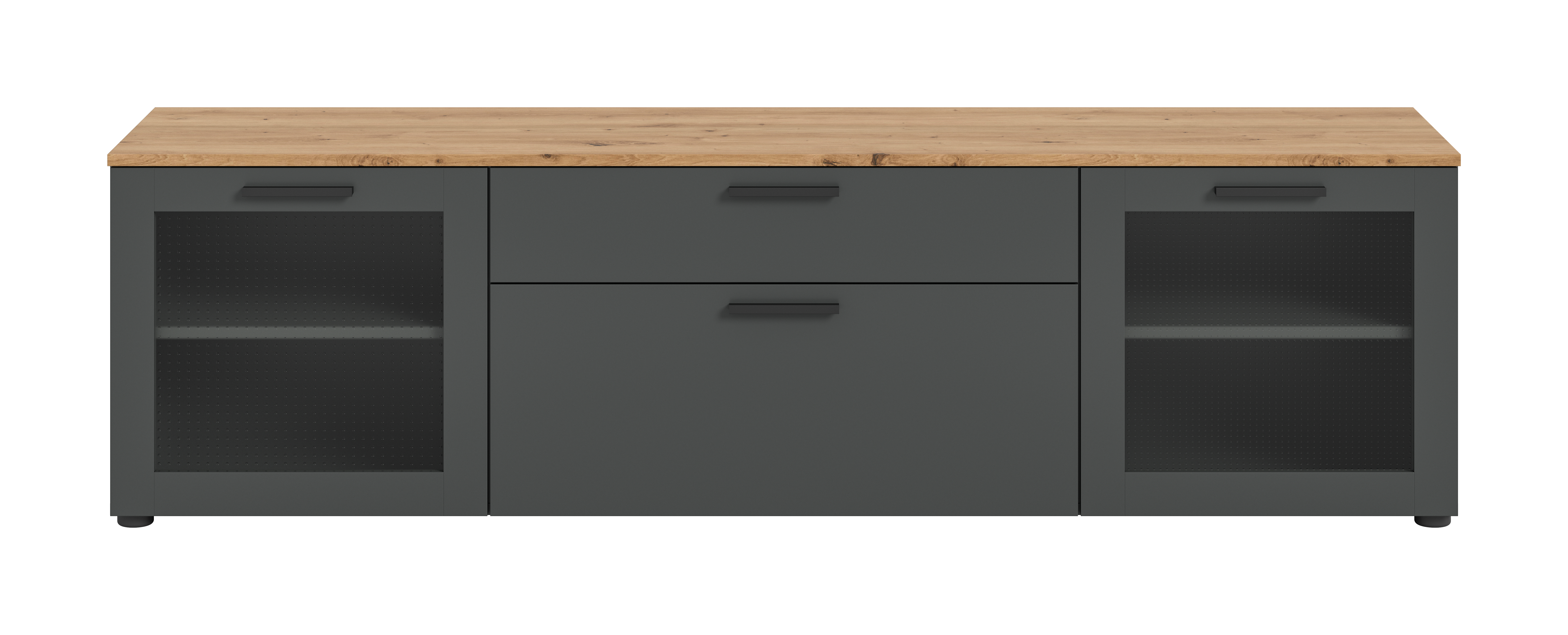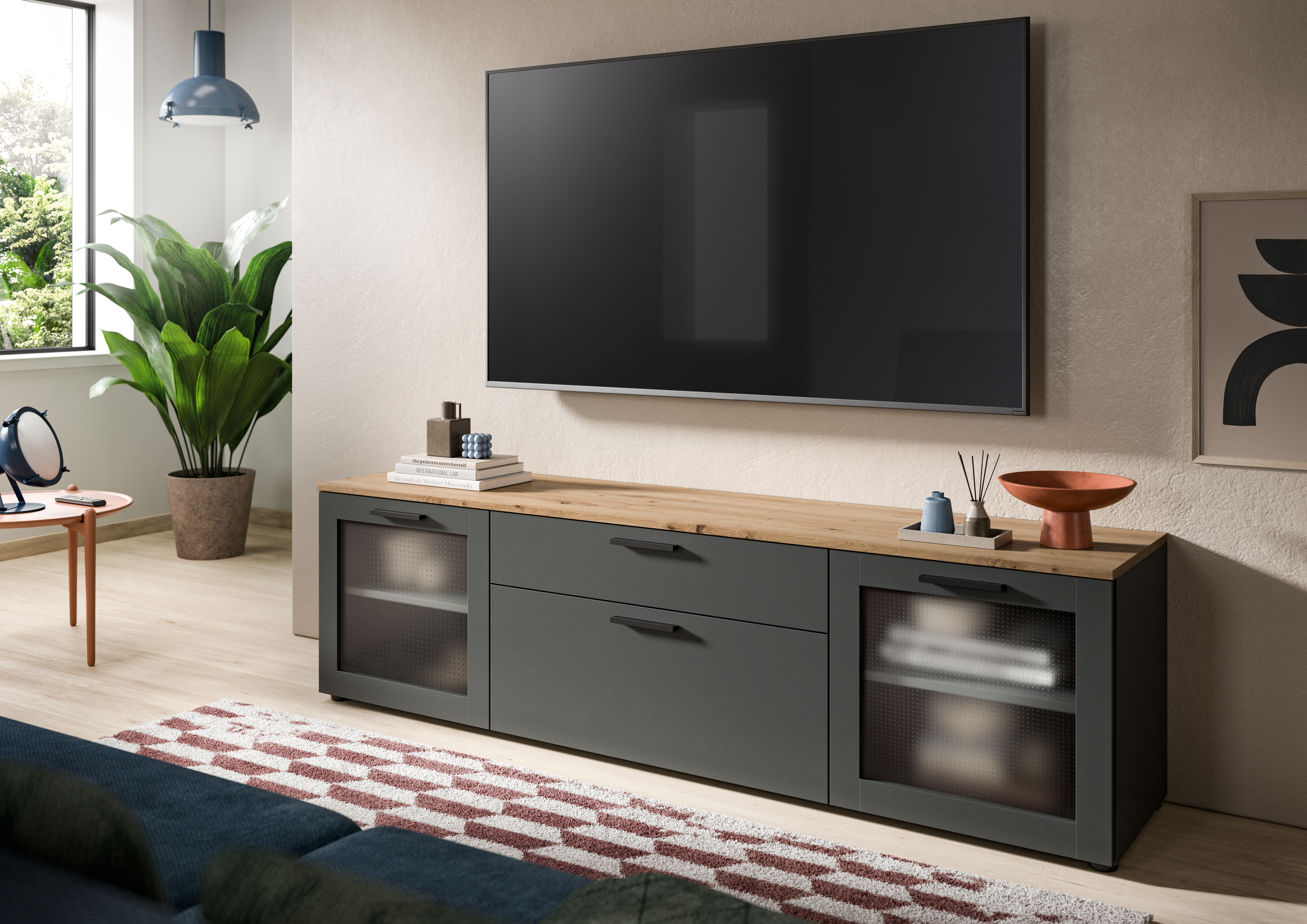 Das perfekte Zusammenspiel aus Stil und Funktionalität hat dieses Lowboard. Dieses elegante Möbelstück besticht durch seine Basaltgrau-Oberfläche mit Akzenten in Artisan Eiche und Glas. Ausgestattet mit 2 Türen, 1 Klappe und 1 Schubkasten, bietet es reichlich Stauraum für Ihre Elektronik und Medien. Die modernen Griffe verleihen dem Design eine edle Note. Ideal für zeitgemäße Wohnräume!