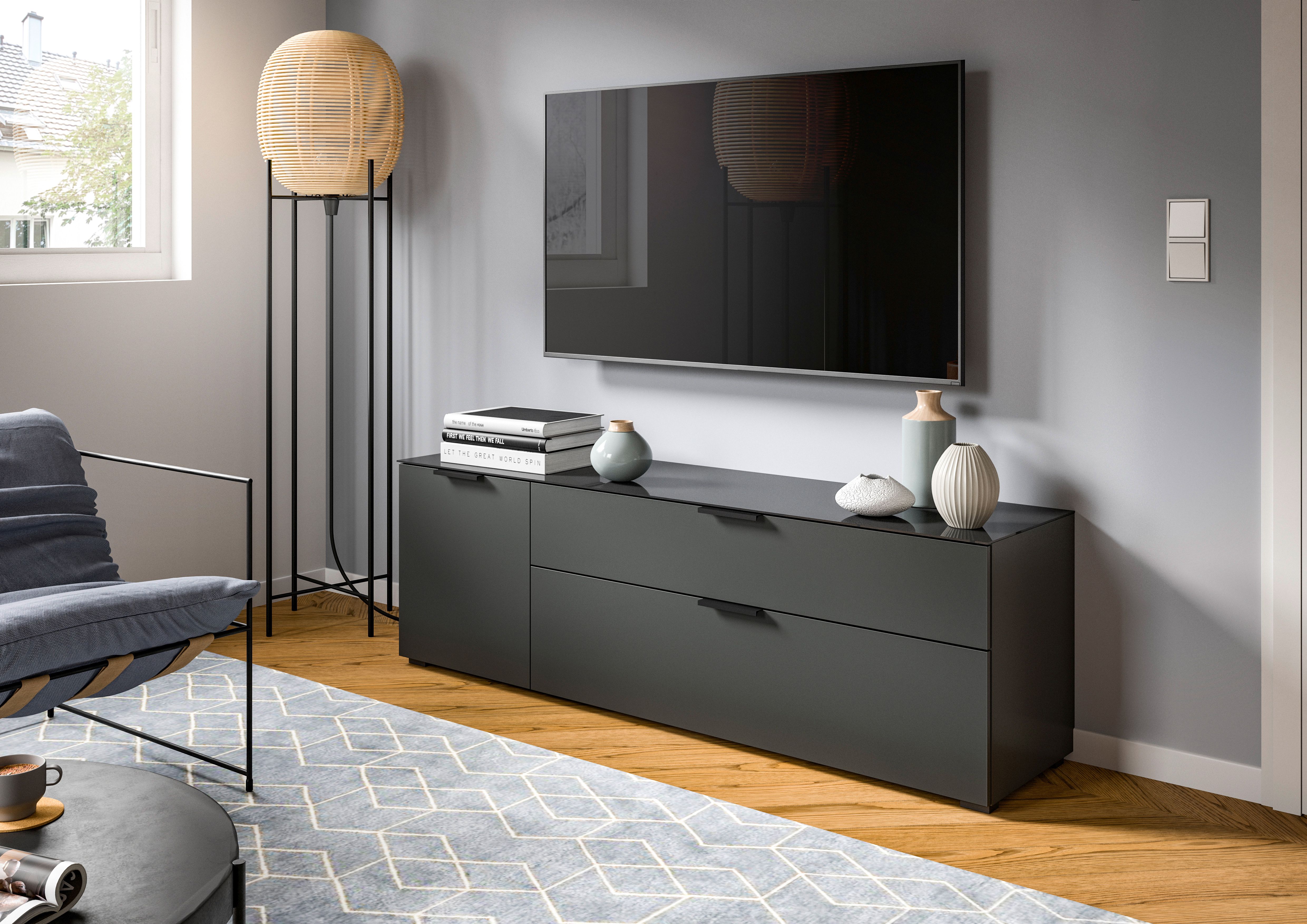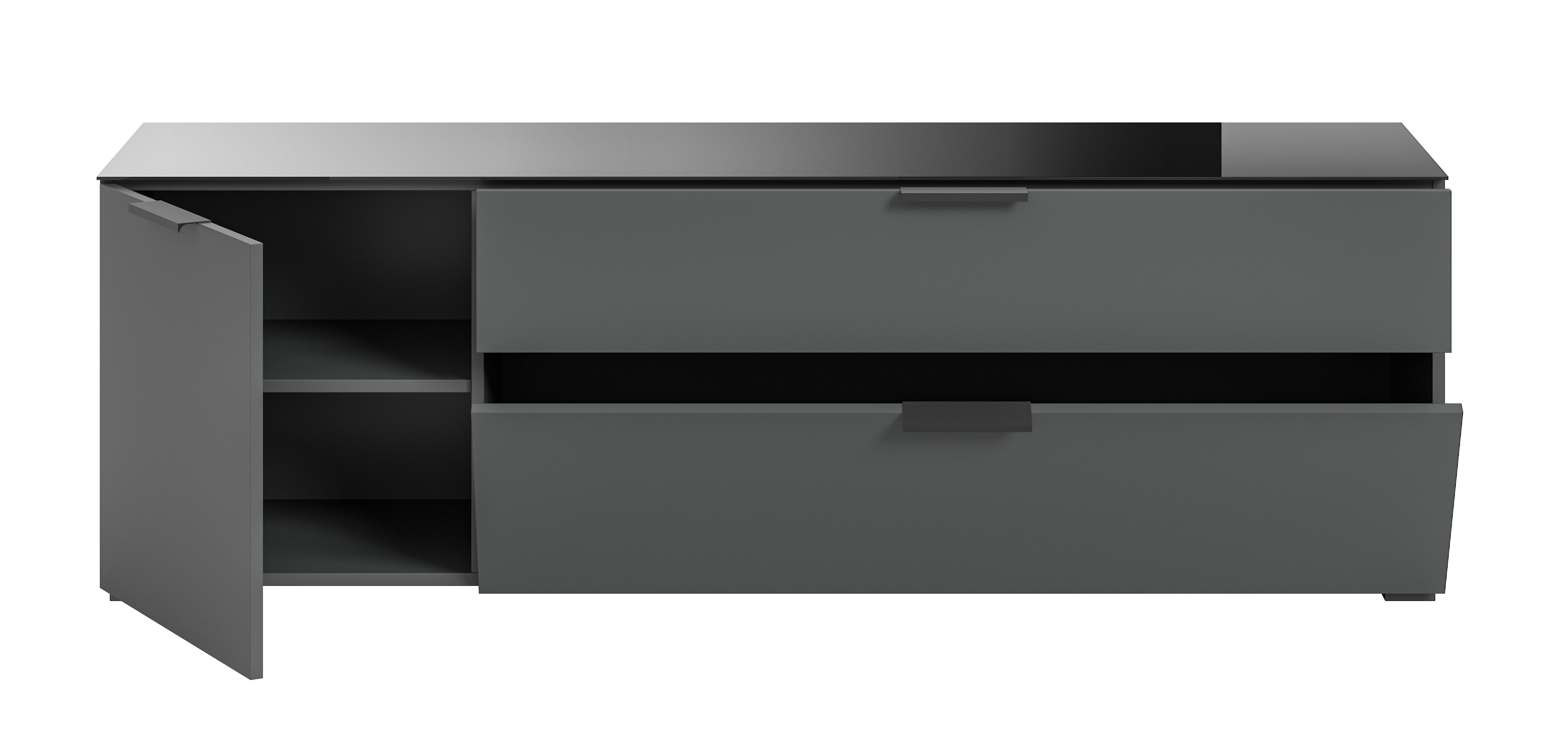 Bringe mit unserem eleganten Lowboard in Anthrazit-Nachbildung mit Glasabsetzung Stil und Organisation in dein Zuhause. Mit den großzügigen Maßen bietet sie nicht nur ausreichend Stauraum für deine persönlichen Gegenstände, sondern verleiht auch deinem Raum eine moderne Note. Erlebe Funktionalität und Ästhetik vereint in diesem hochwertigen Lowboard für dein Zuhause.