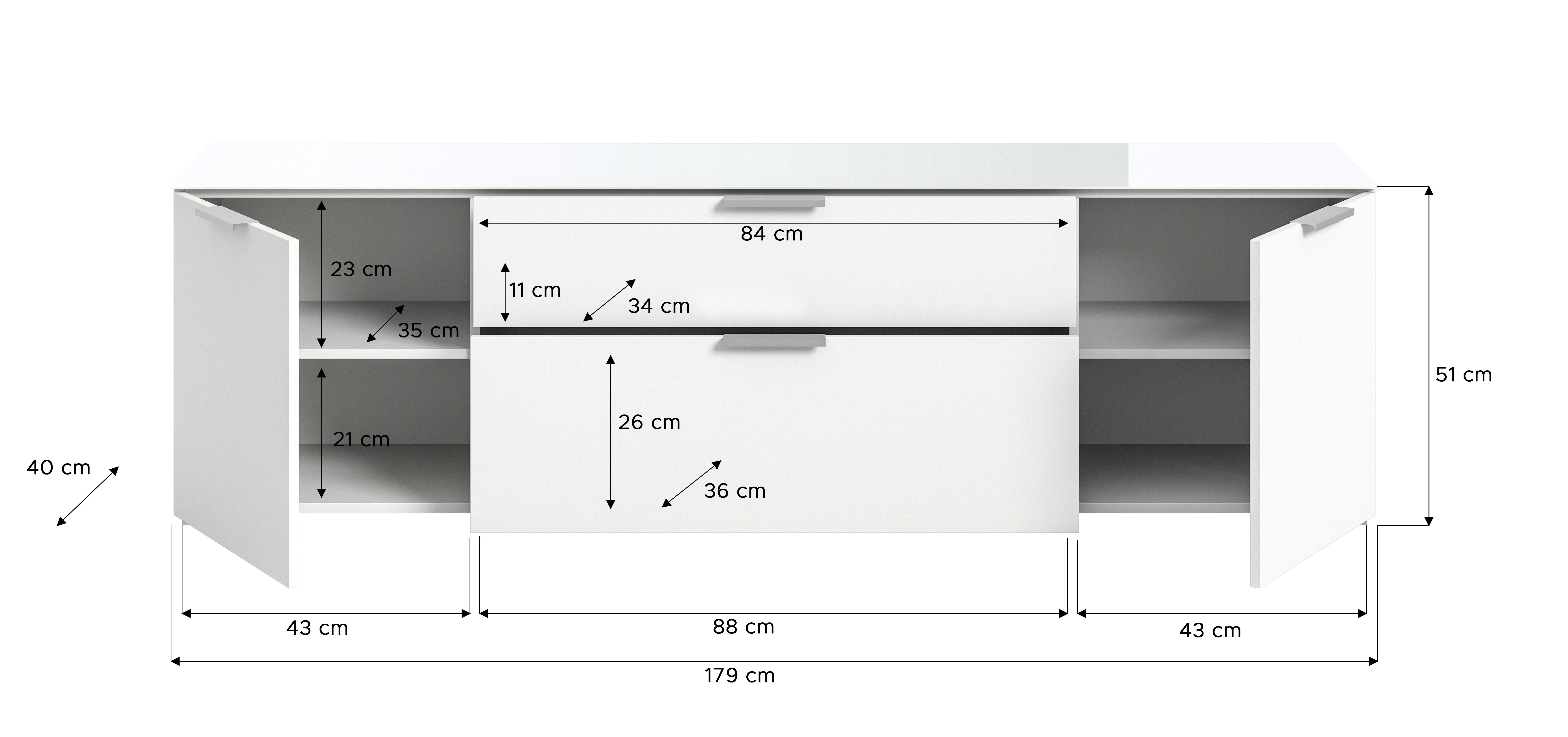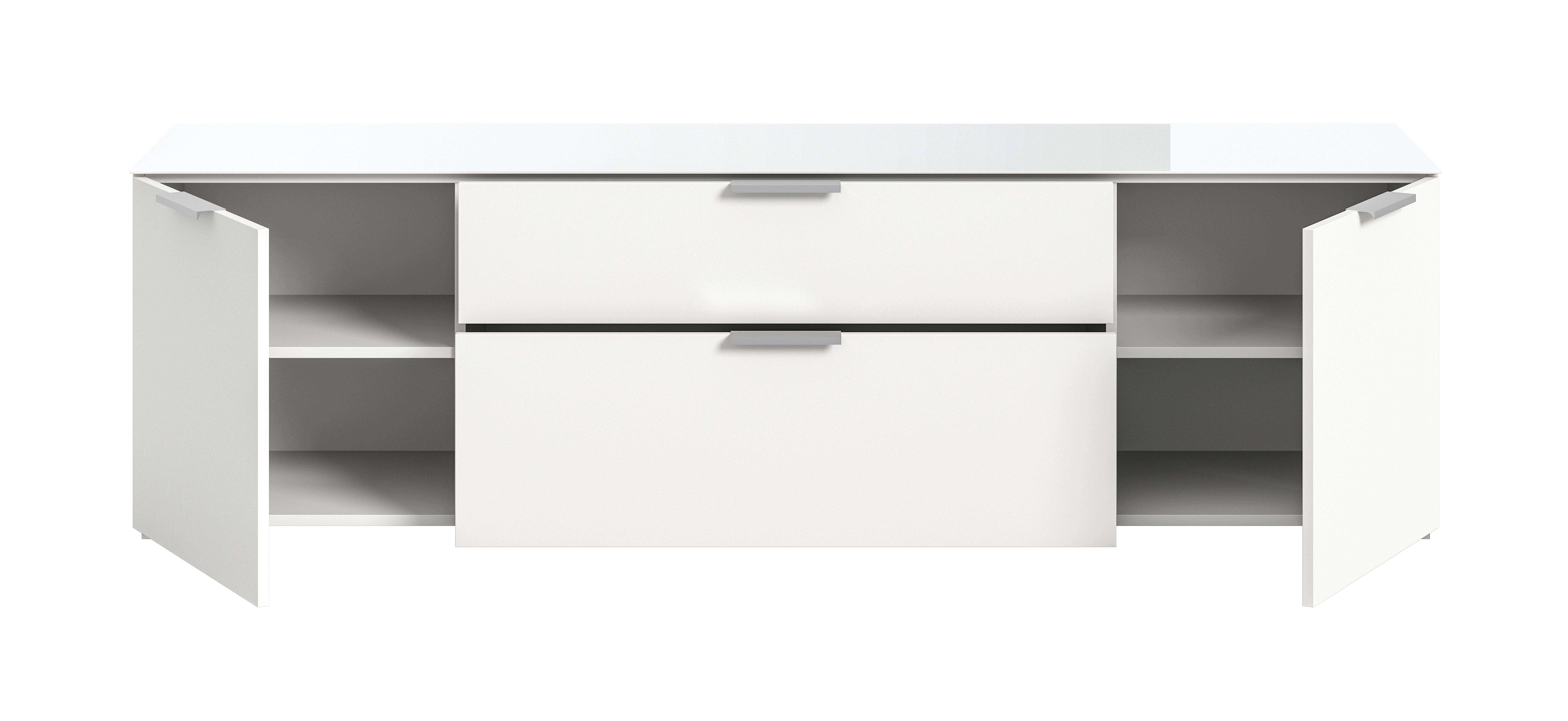 - Funktionalität: Mit Abmessungen von 179x51x40 cm bietet das Lowboard großzügigen Stauraum für verschiedenste Gegenstände. Die Schublade und Fächer ermöglichen eine praktische Organisation und Aufbewahrung, während die großzügige Ablagefläche zusätzlichen Platz für einen Fernseher oder persönliche Gegenstände bietet.