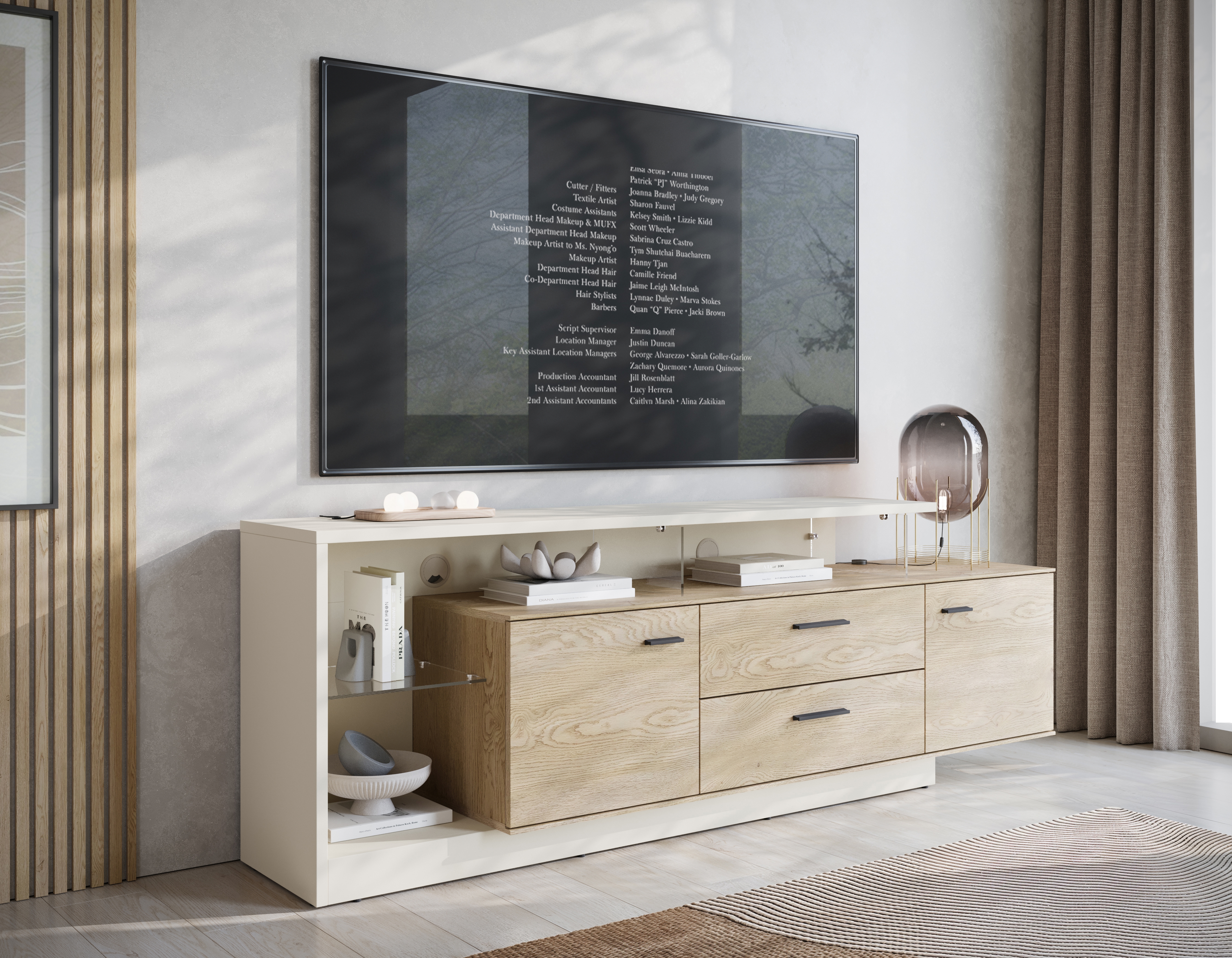 | Ausstattung Kommoden Phono Büro Regal: | Kabeldurchlass, Offene Fächer, Schublade(n), Türe(n) | ||