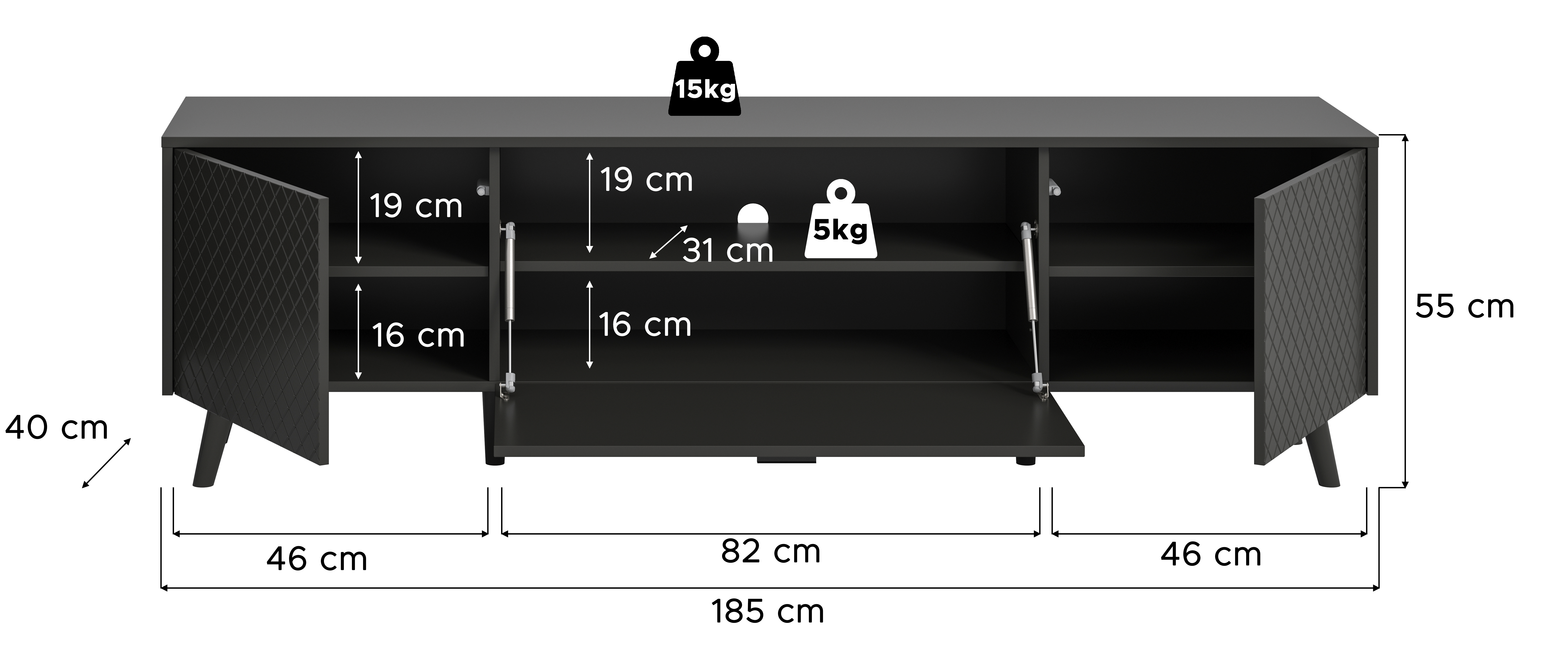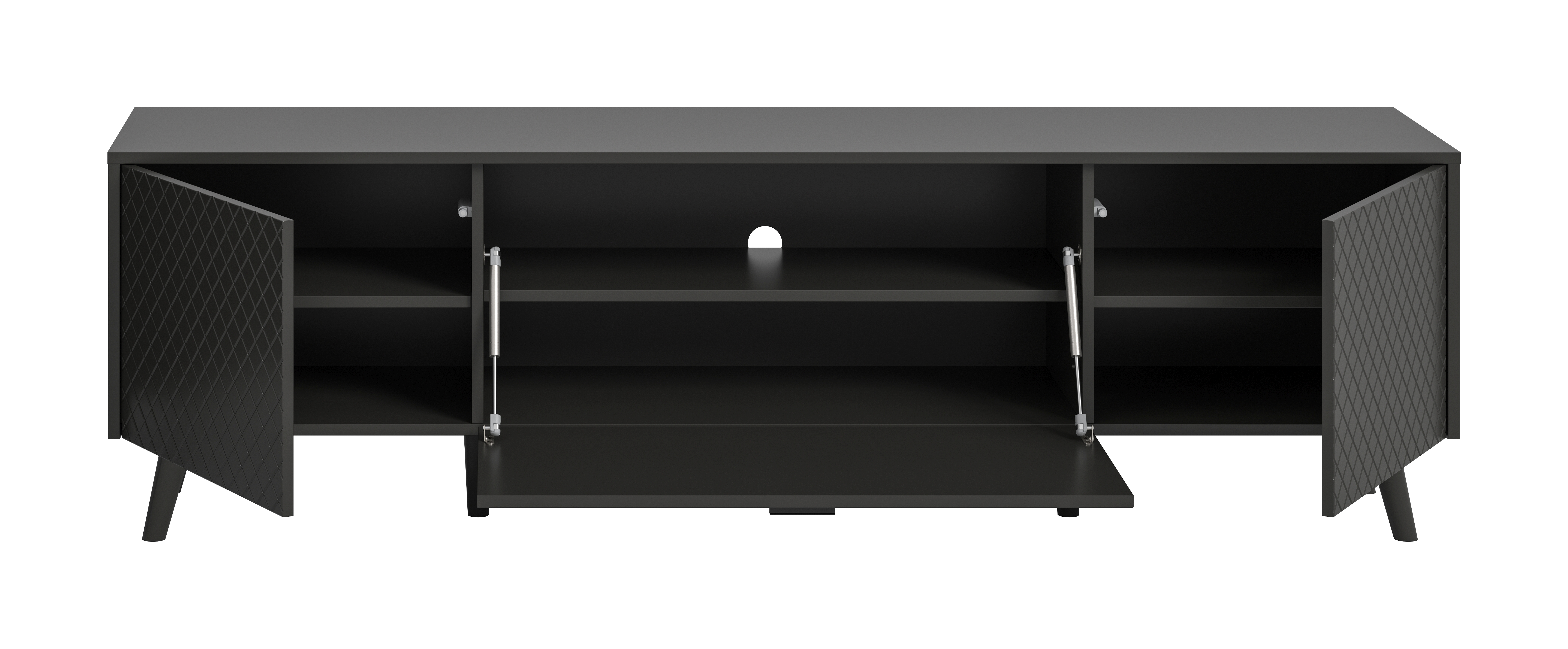 Erleben Sie das perfekte Lowboard für Ihr Wohnzimmer! Mit 185 x 55 x 40 cm bietet dieses Möbelstück zwei Türen, eine Klappe und insgesamt sechs Fächer. Die drei herausnehmbaren und höhenverstellbaren Einlegeböden ermöglichen eine flexible Nutzung. Die hochwertige MDF-Front mit eingefräster Karo-Optik kombiniert modernes Design mit Funktionalität. Ideal für TV-Geräte und Dekorationselemente, macht dieses Lowboard Ihr Wohnzimmer noch einladender.