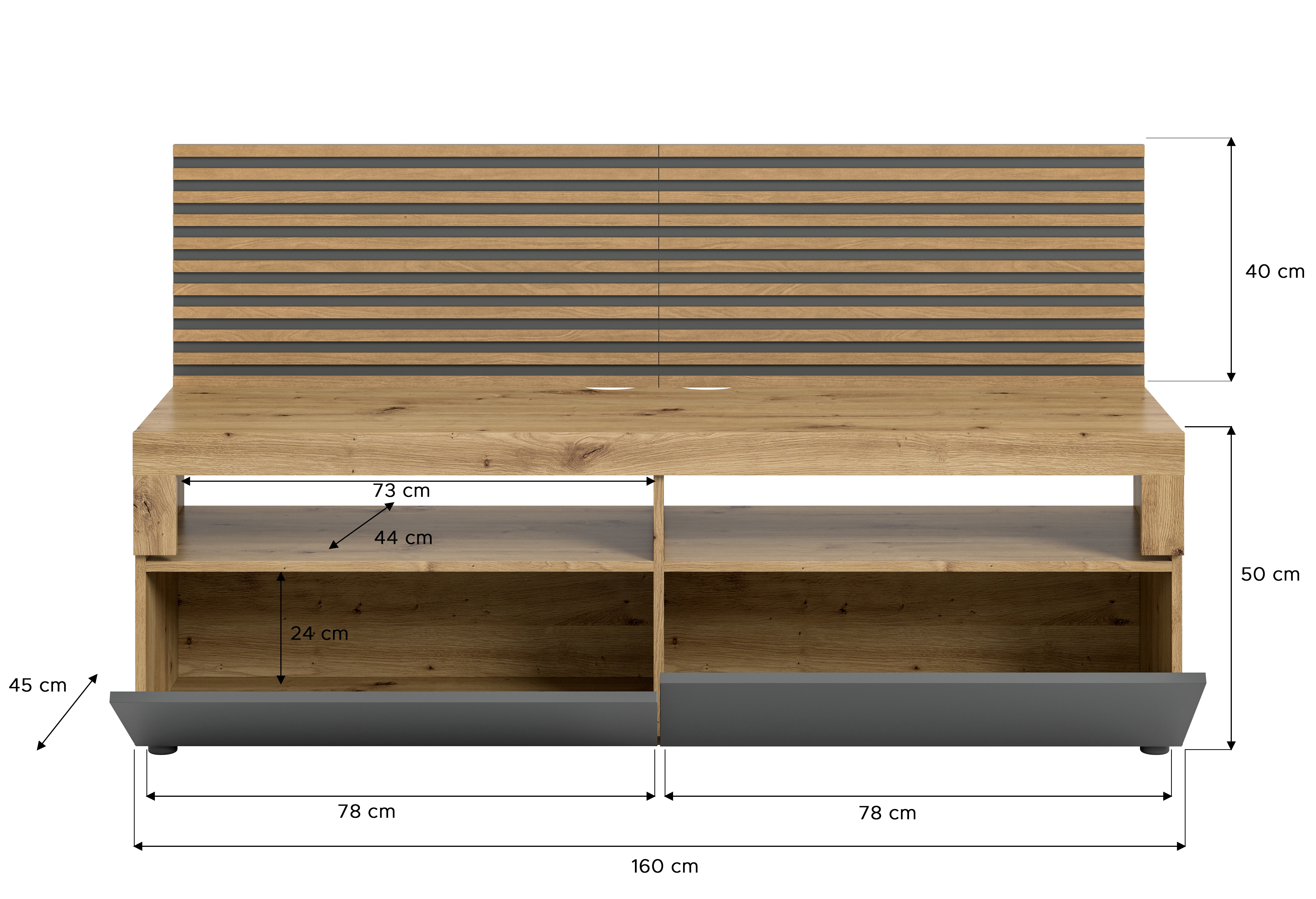 Verleihen Sie Ihrem Wohnzimmer, Studio, Jugendzimmer oder Gästezimmer mit unserem vielseitigen Lowboard inklusive Paneel einen Hauch von Raffinesse. Die Artisan Eiche Nachbildung und die Antrhrazit Nachbildung verleihen diesem Möbelstück ein modernes Flair. Mit großzügigen Maßen von 160x90x45 cm bietet es nicht nur ausreichend Stauraum, sondern auch eine ansprechende Ästhetik. Entdecken Sie jetzt die perfekte Ergänzung für Ihr Zuhause.