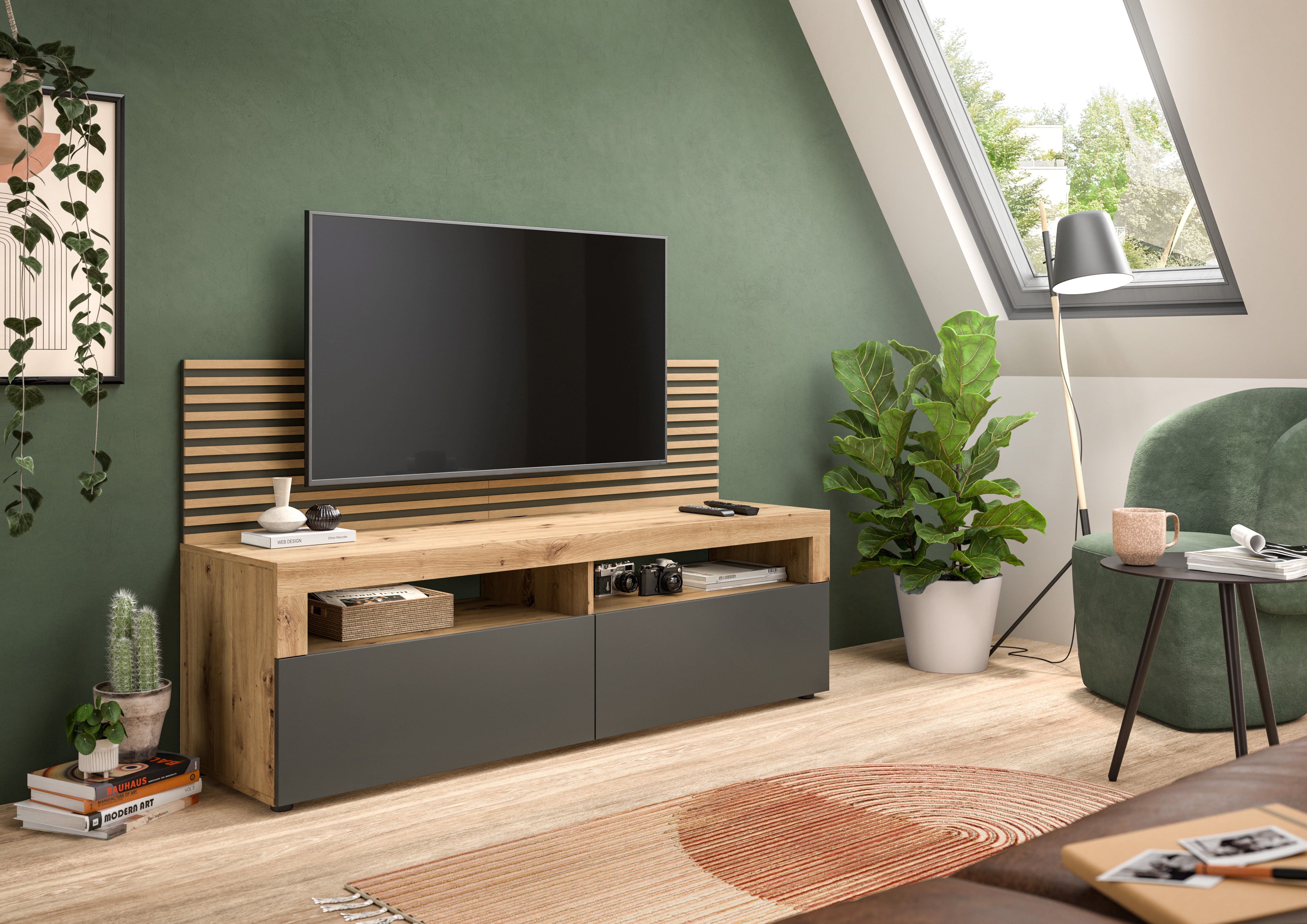 - Design/Stil: Das Lowboard inklusive Paneel in Artisan Eiche Nachbildung und Anthrazit Nachbildung bietet einen modernen und stilvollen Look für verschiedene Wohnräume. Die Kombination aus warmen Holztönen und dunklem Anthrazit verleiht dem Möbelstück eine zeitgemäße und ansprechende Ästhetik, die sich gut in verschiedene Einrichtungsstile einfügt.