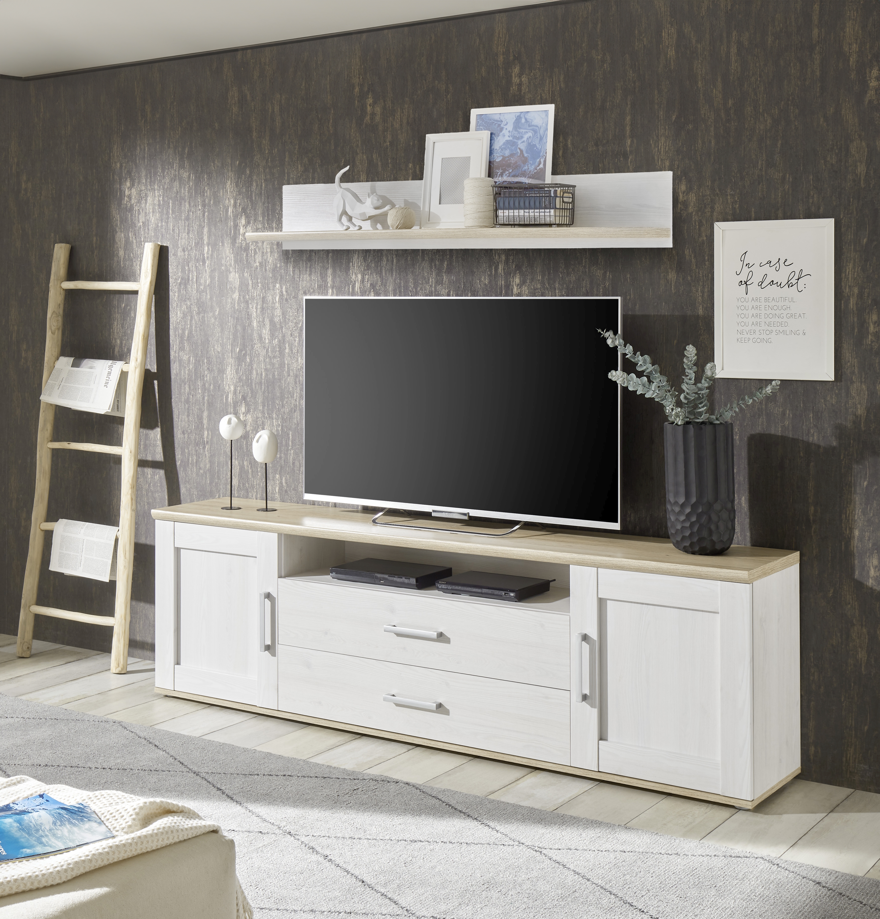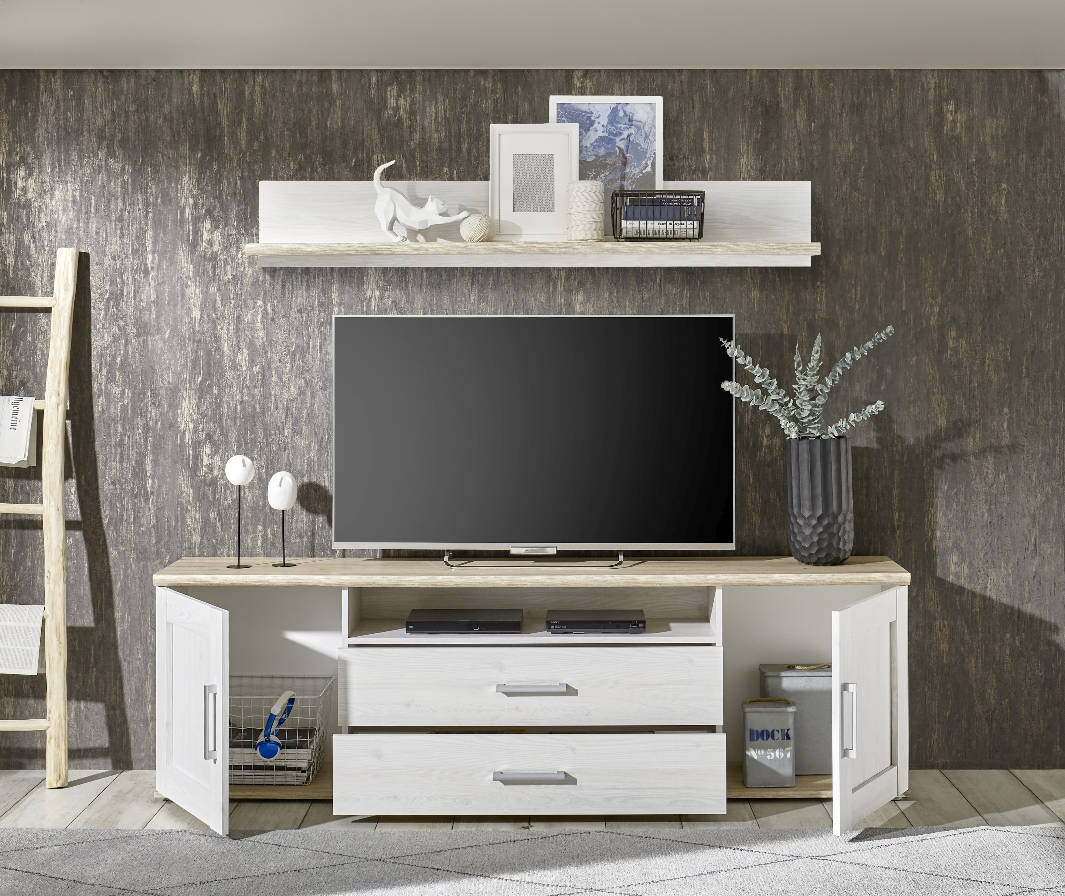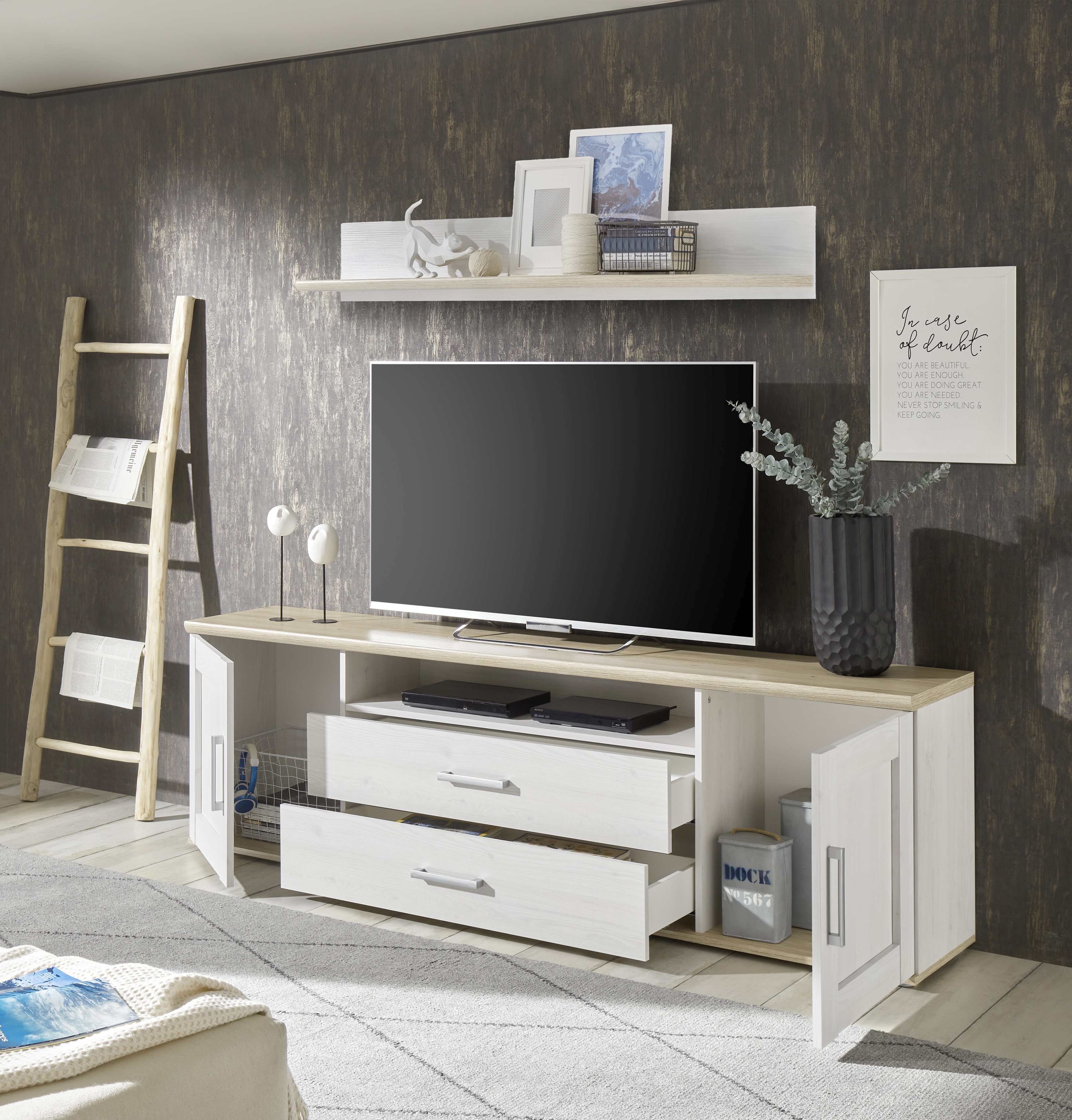1 Lowboard mit 2 Türen, 1 offenes Fach und 2 Schubkästen mit Unterflurauszügen
