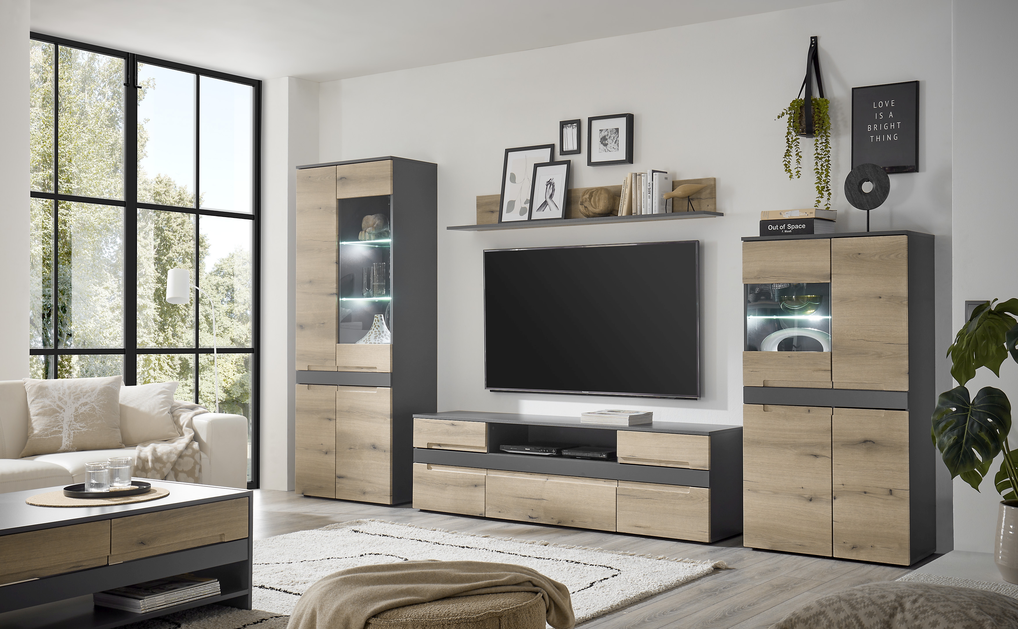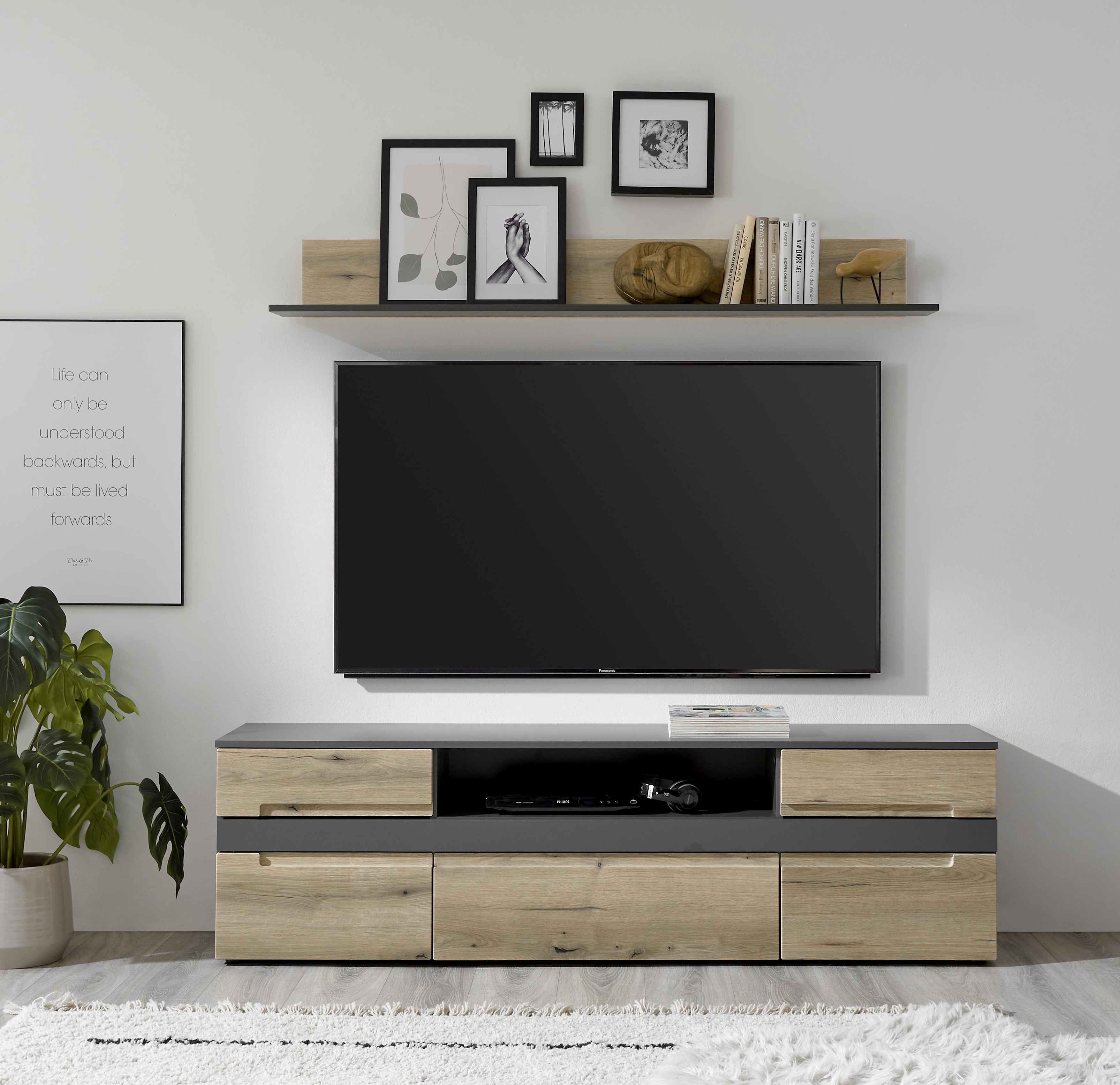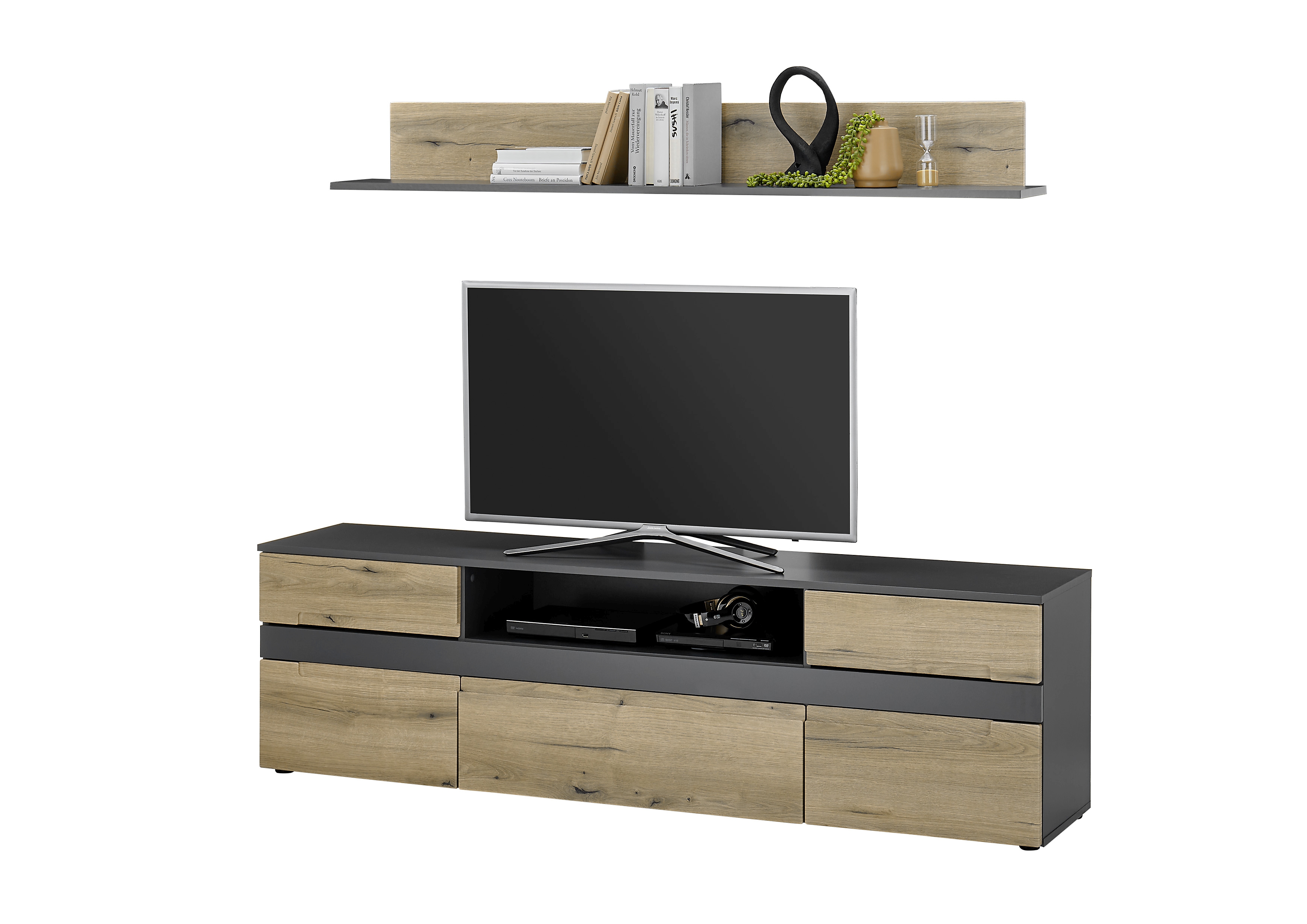 1 Lowboard mit 2 Türen, 1 Klappe, 1 offenem Fach und 2 Schubkästen mit Unterflurauszügen