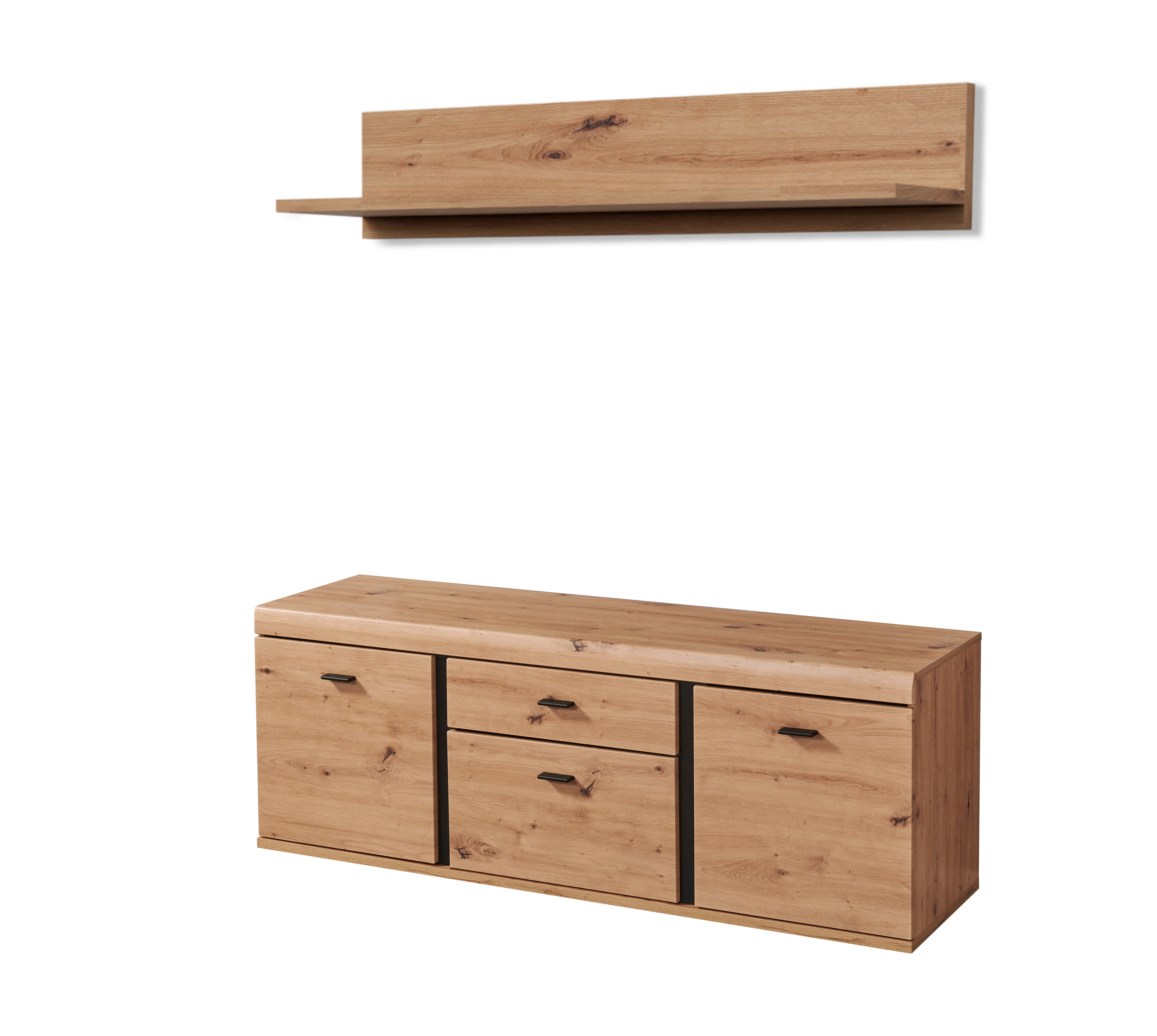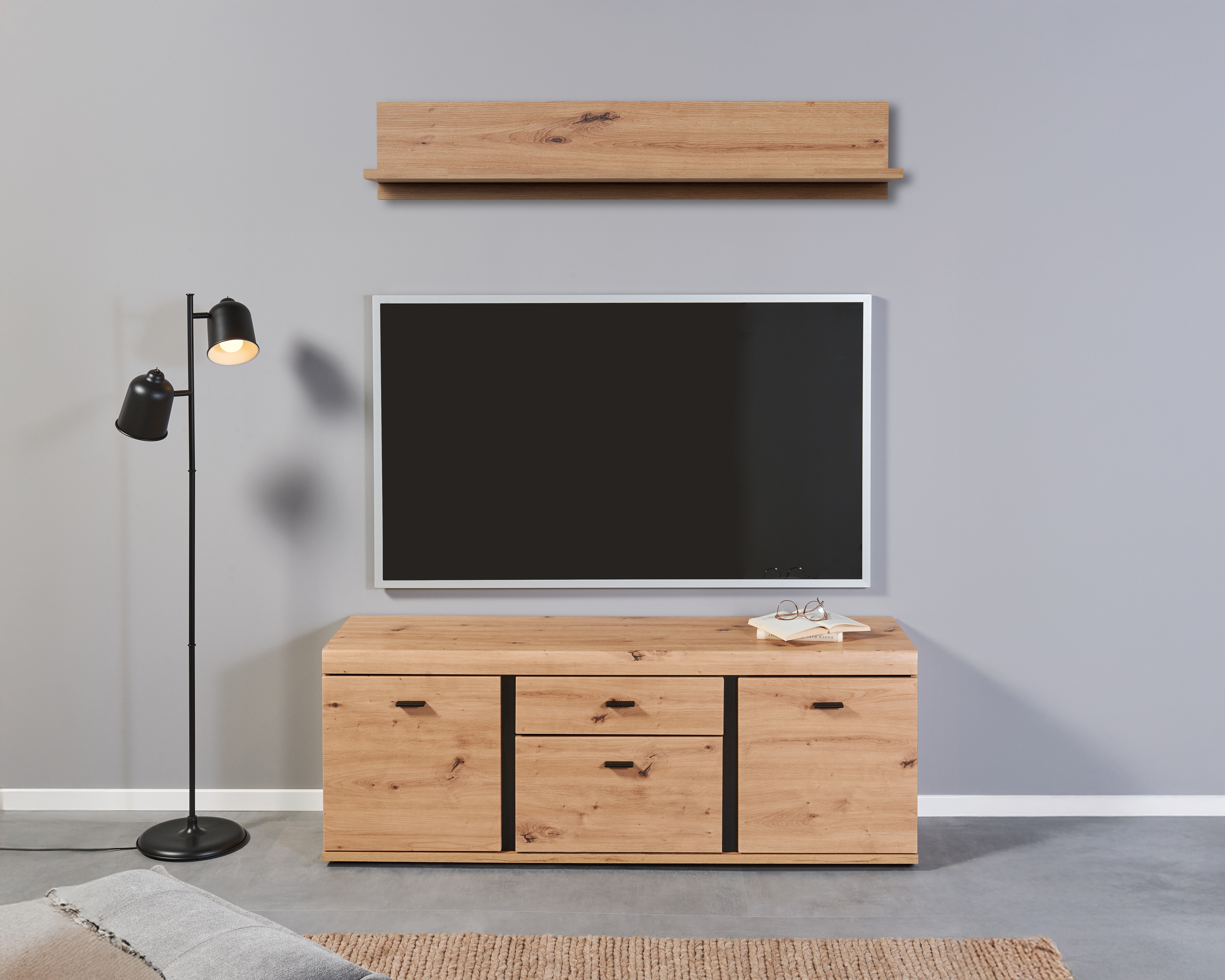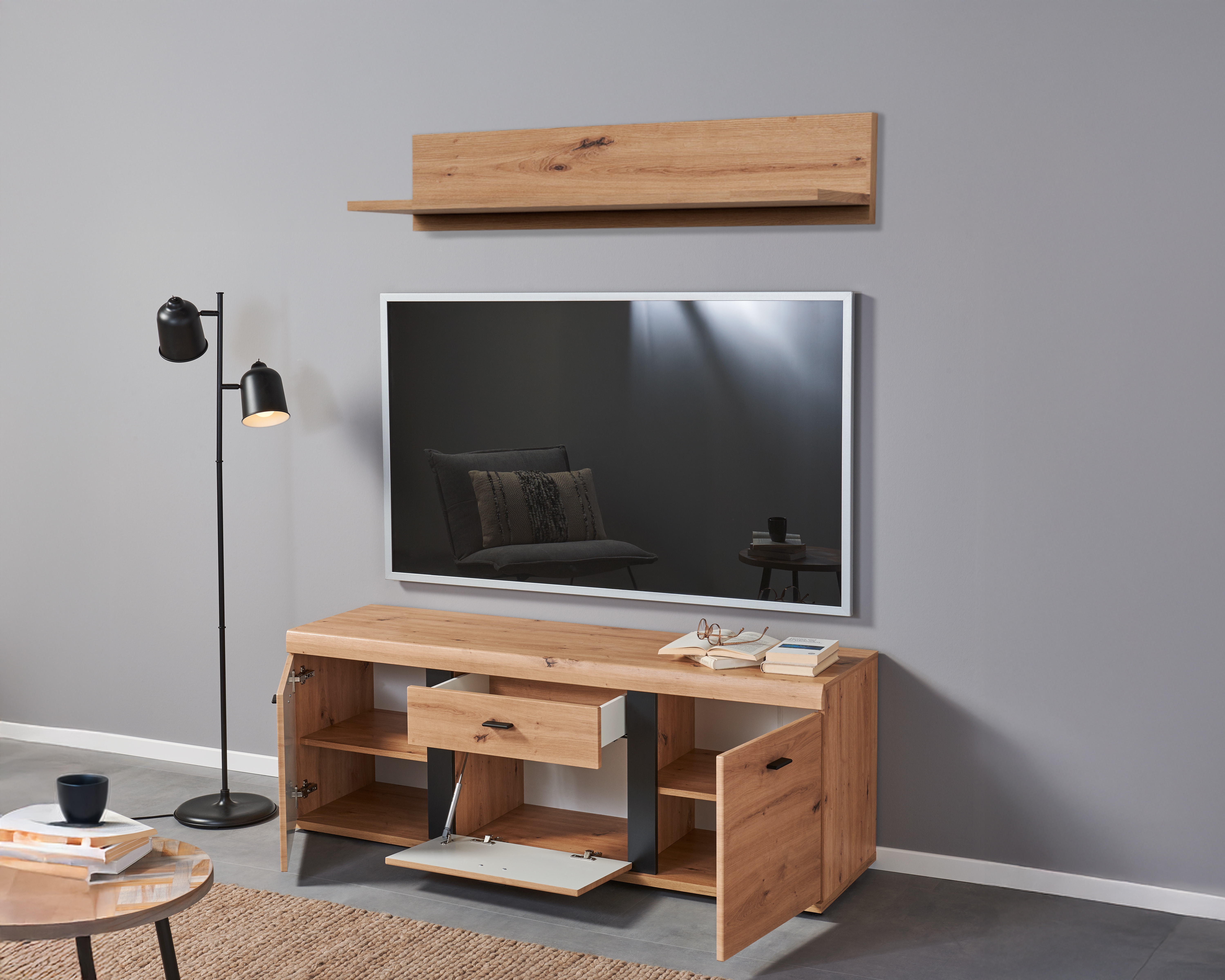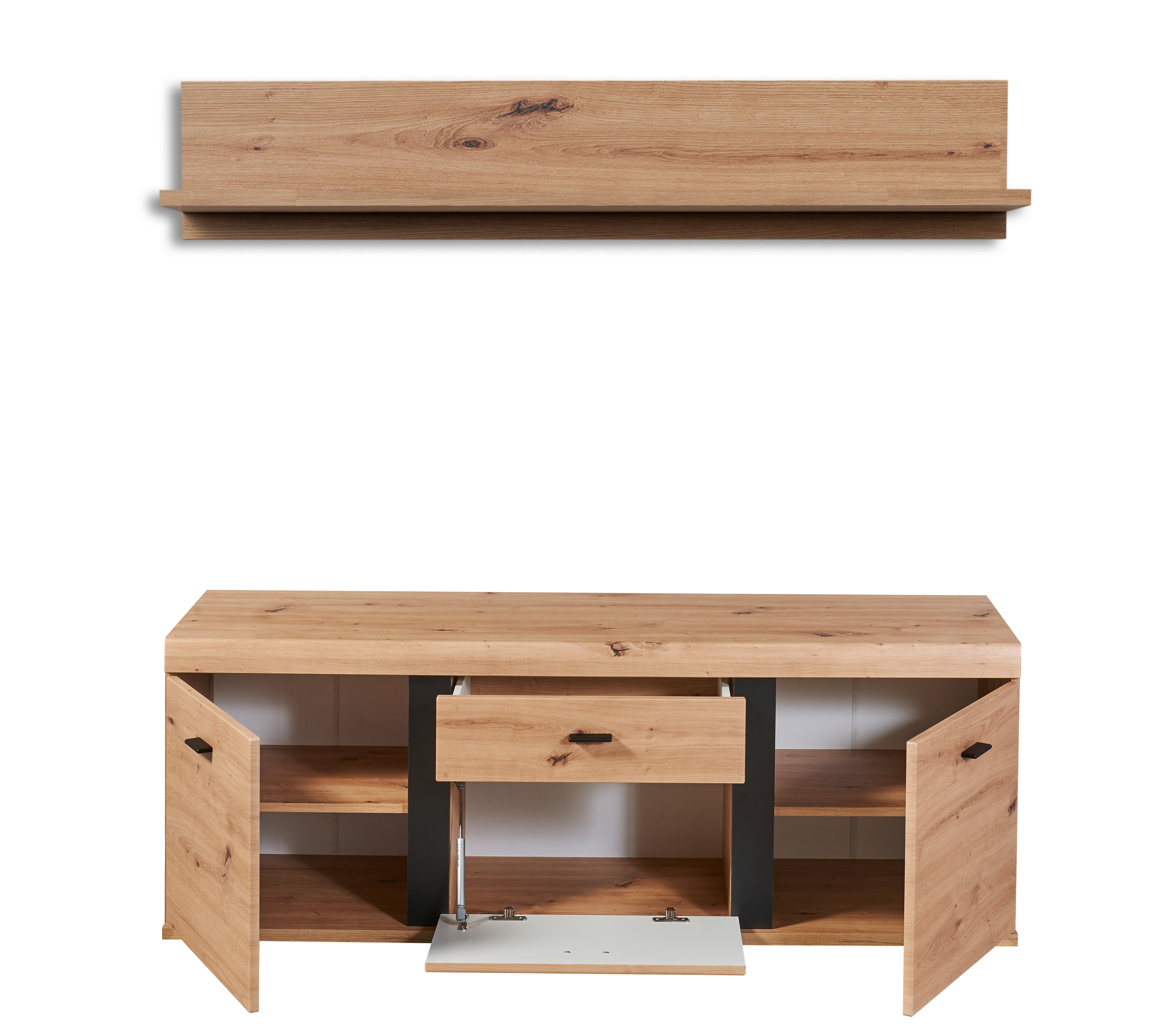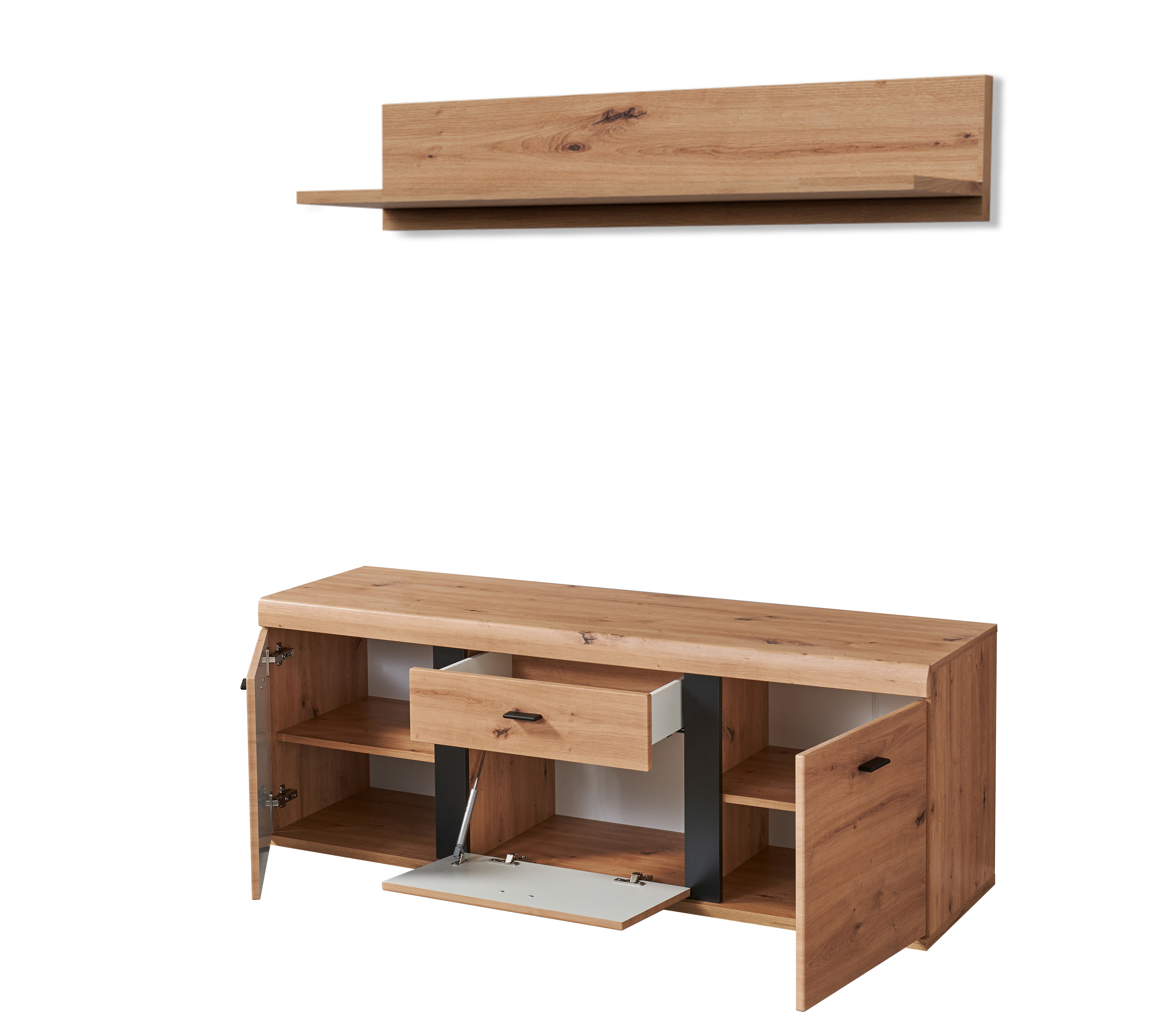 1 Lowboard mit 2 Türen, 1 Klappe, 1 Schubkasten und 2 Konstruktionsböden