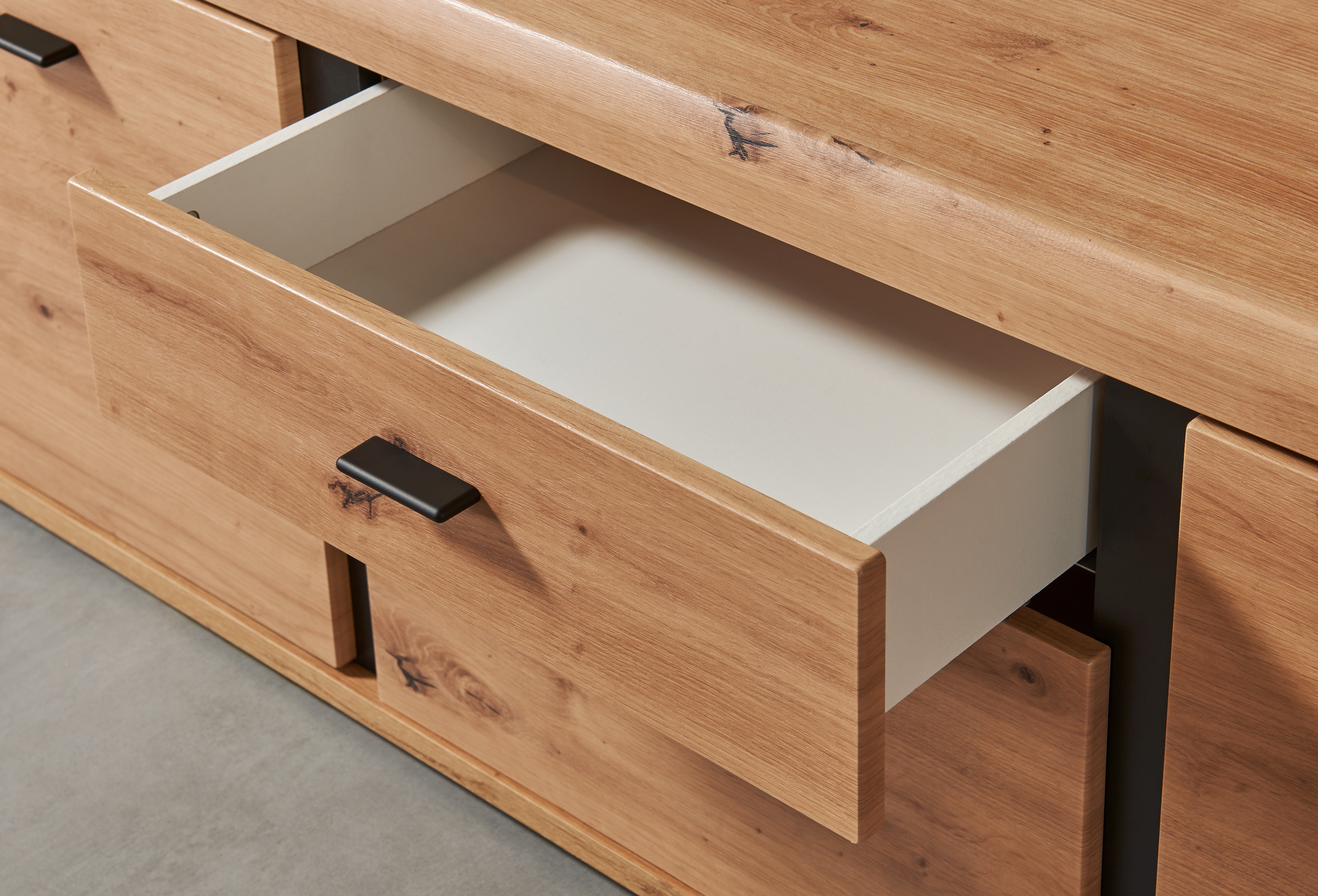 Front: Artisan Eiche Holznachbildung, MDF (Mitteldichte Holzfaserplatte) foliert mit Absetzungen in Schwarz (Spanplatte Melaminbeschichtung)