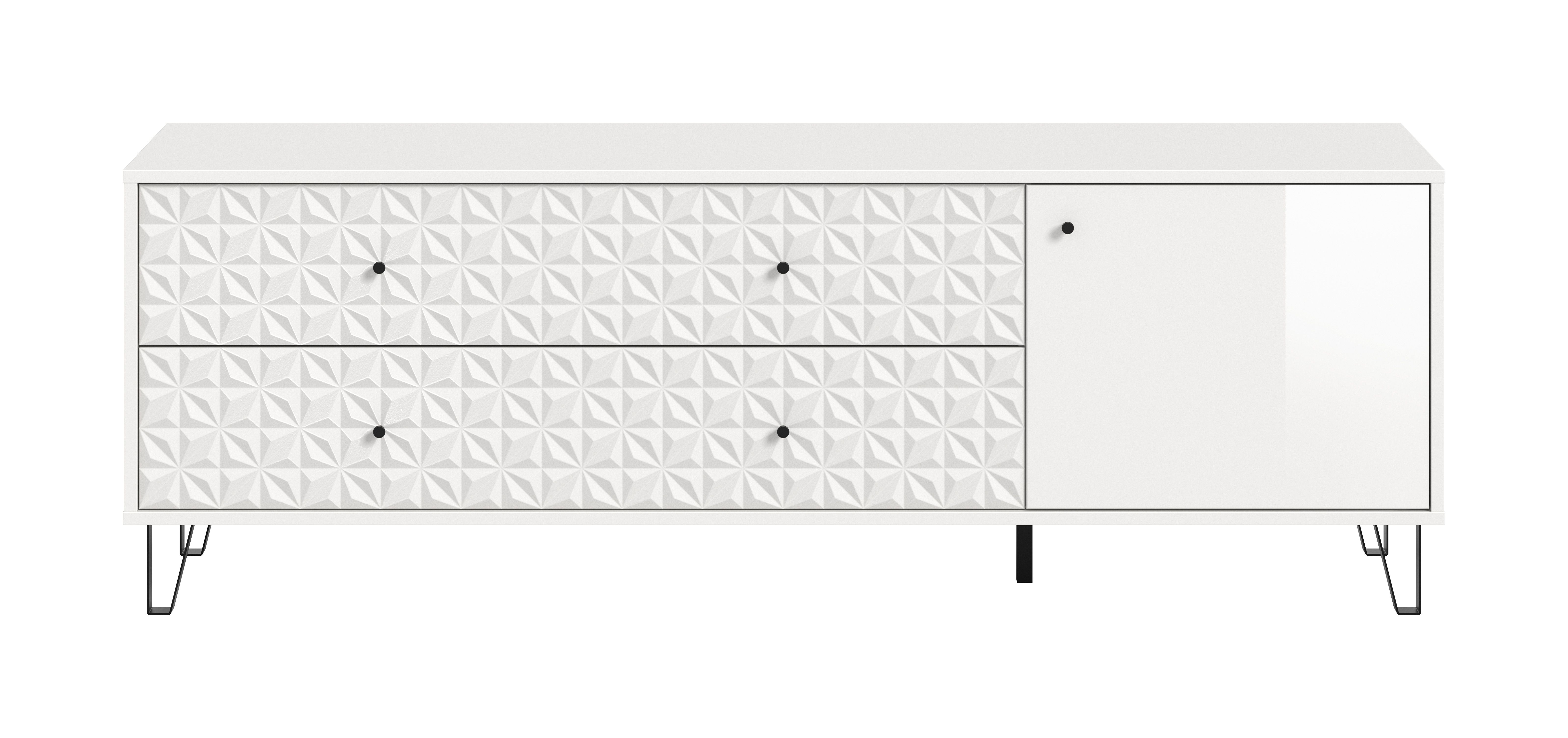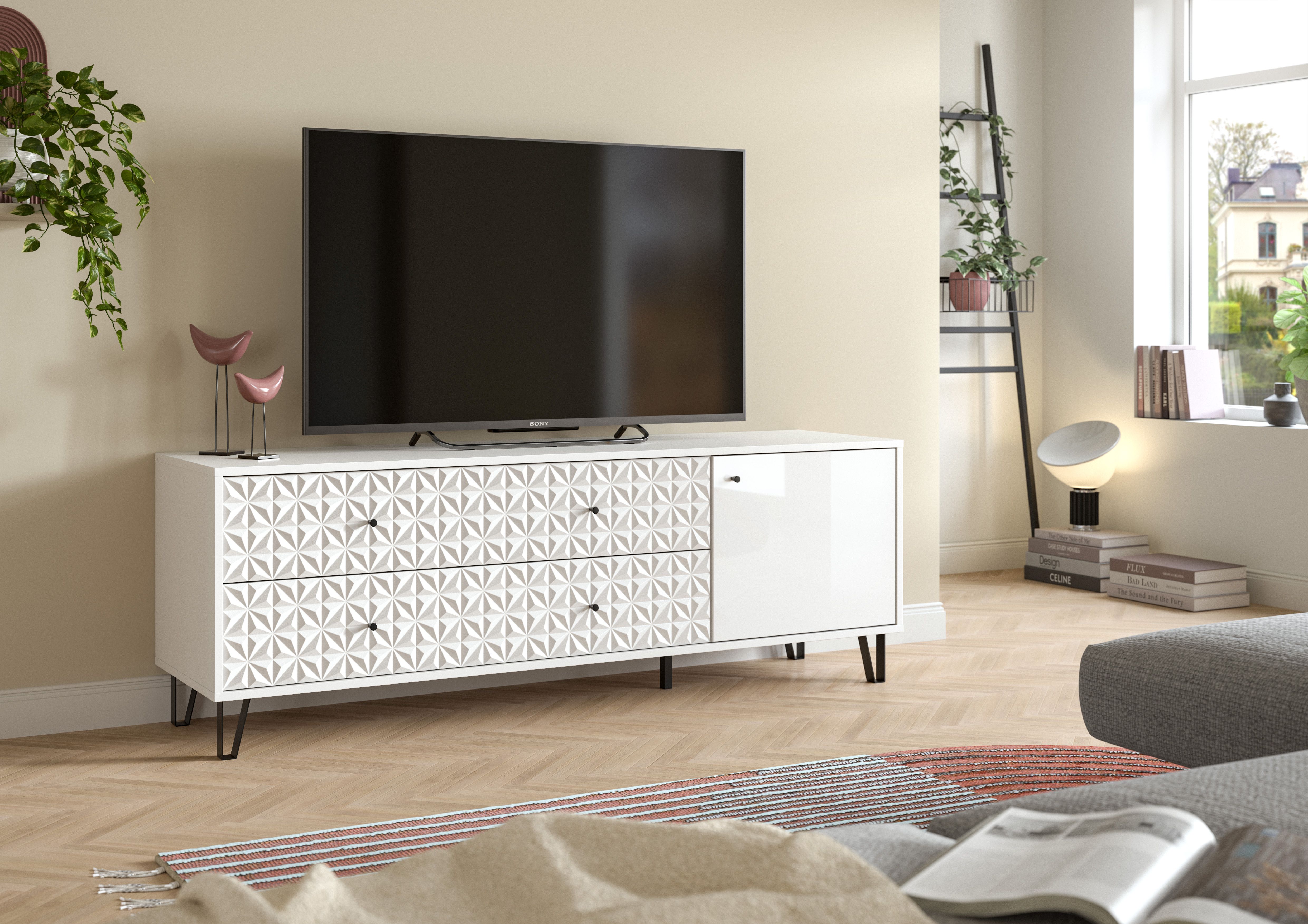 Entdecken Sie das moderne Lowboard, das durch sein elegantes Design und seine hohe Funktionalität besticht! Die Kombination aus weißem Melamin und glänzendem Weiß Hochglanz macht es zu einem zeitlosen Blickfang in jedem Raum. Mit seinen Maßen von ca. 164 x 56 x 40 cm bietet es praktischen Stauraum und gleichzeitig eine großzügige Ablagefläche. Hinter einer Tür mit höhenverstellbarem Einlegeboden finden Sie Platz für individuelle Aufbewahrungslösungen. Zwei offene Fächer sowie zwei Schubkästen ergänzen das Lowboard und sorgen für perfekte Ordnung.