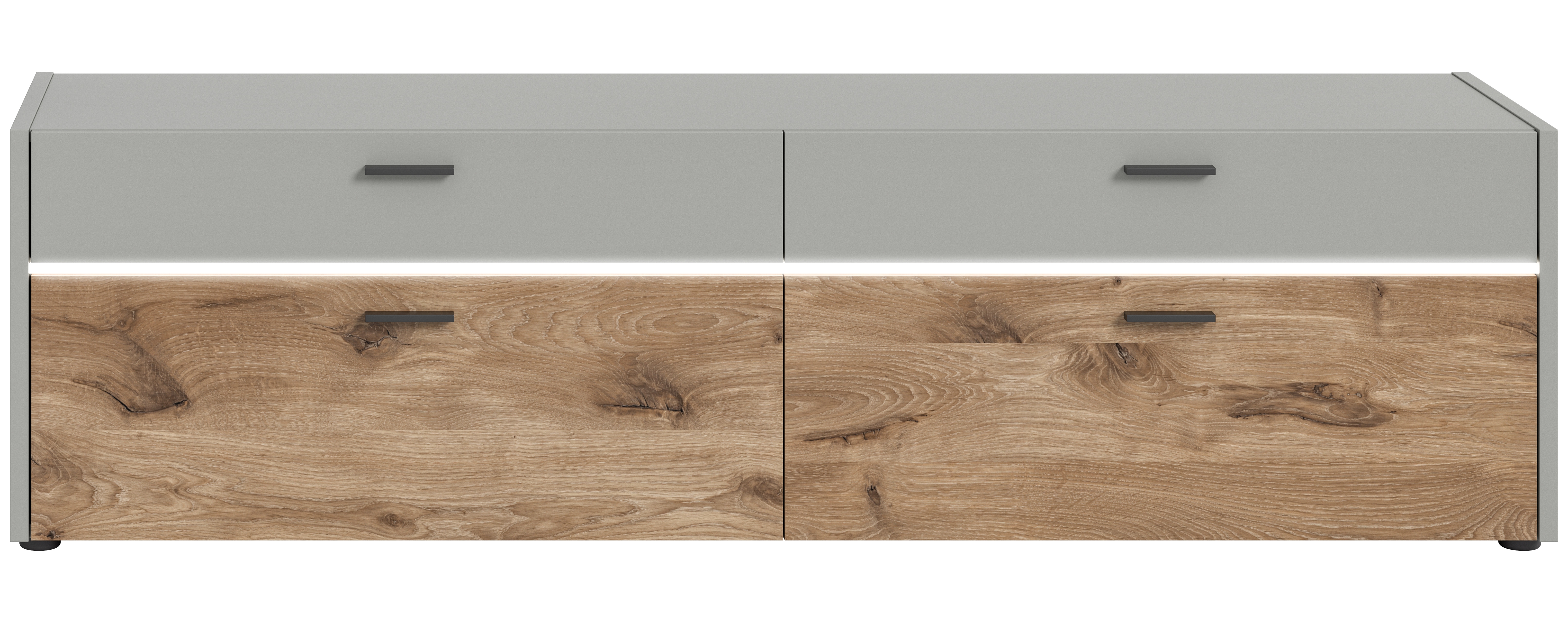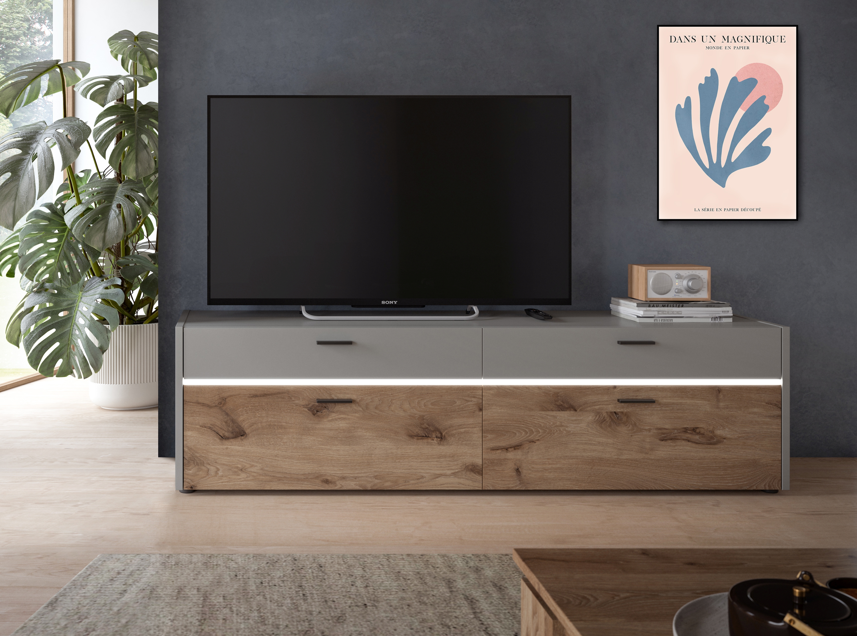 Elegante hellgraue Nachbildung zeichnet unser Lowboard mit den Maßen 185x51x43 cm aus und bietet eine ästhetische sowie praktische Ergänzung für Ihr Wohnzimmer. Die dimmbare Frontbeleuchtung, steuerbar per Fernbedienung, schafft eine stimmungsvolle Atmosphäre. Dank der robusten ABS-Kante verspricht dieses Möbelstück Langlebigkeit und Stabilität. Entdecken Sie jetzt dieses hochwertige Lowboard für eine stilvolle Wohnraumgestaltung.