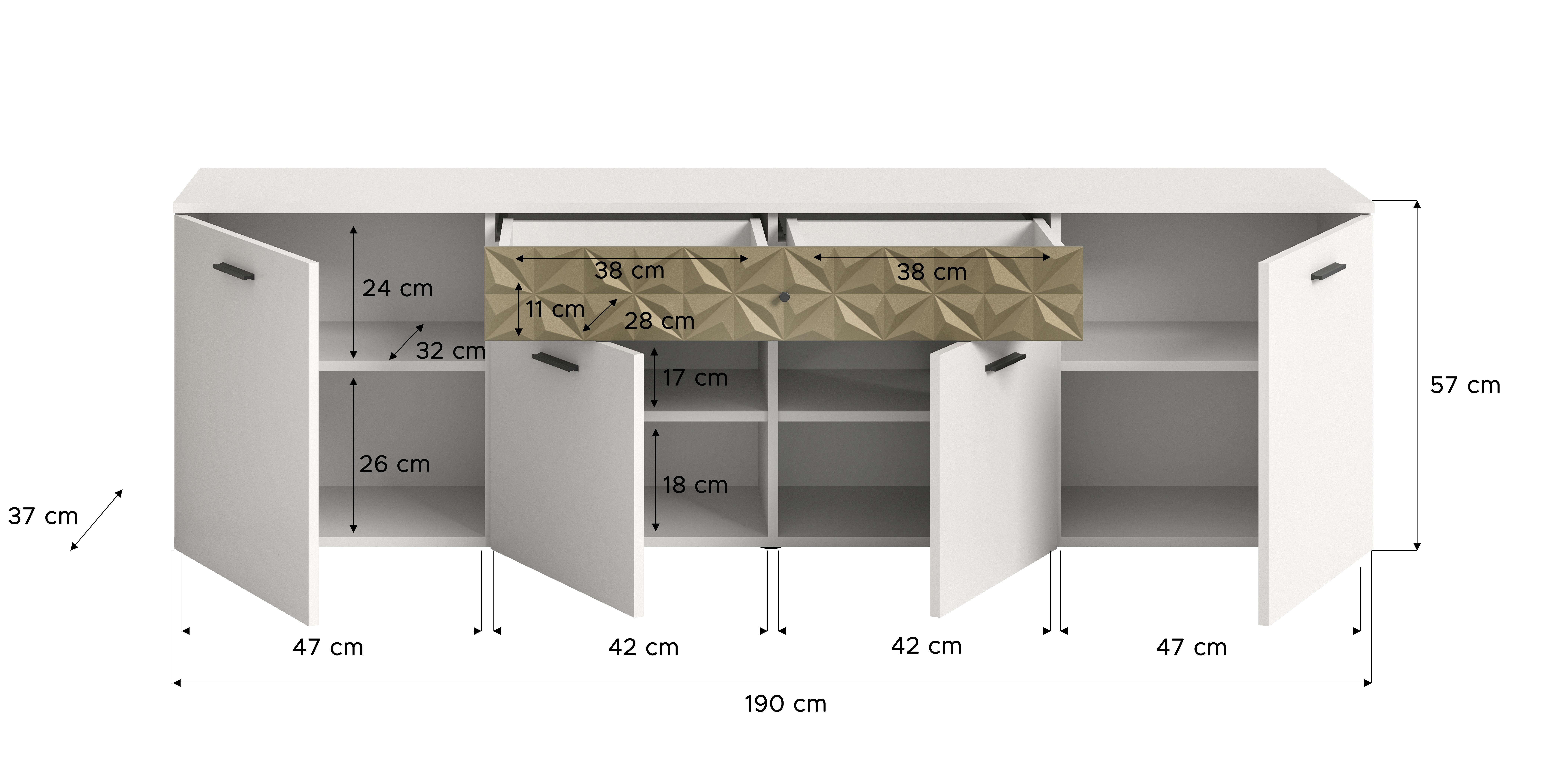 - 1 Schubkasten und 4 Türen bietet viel Stauraum