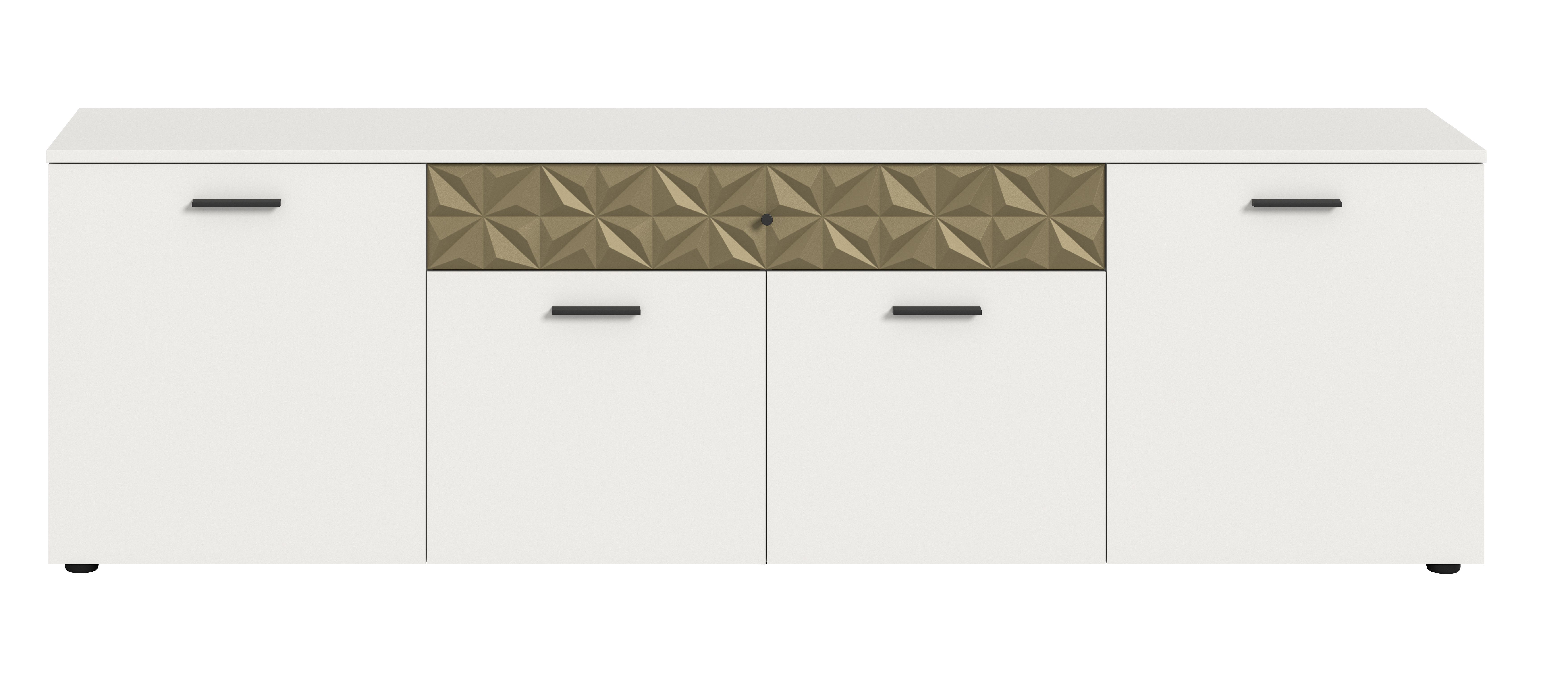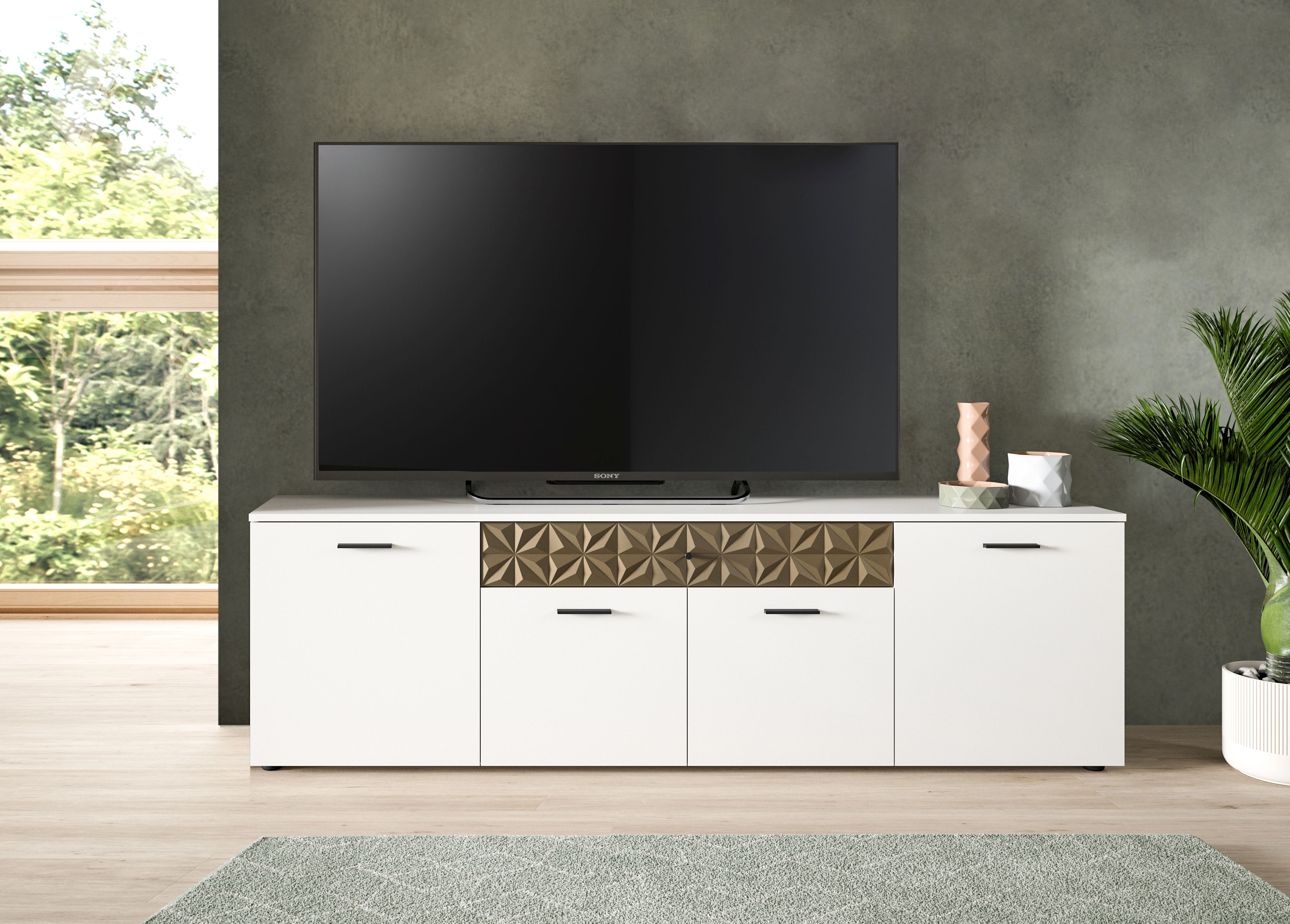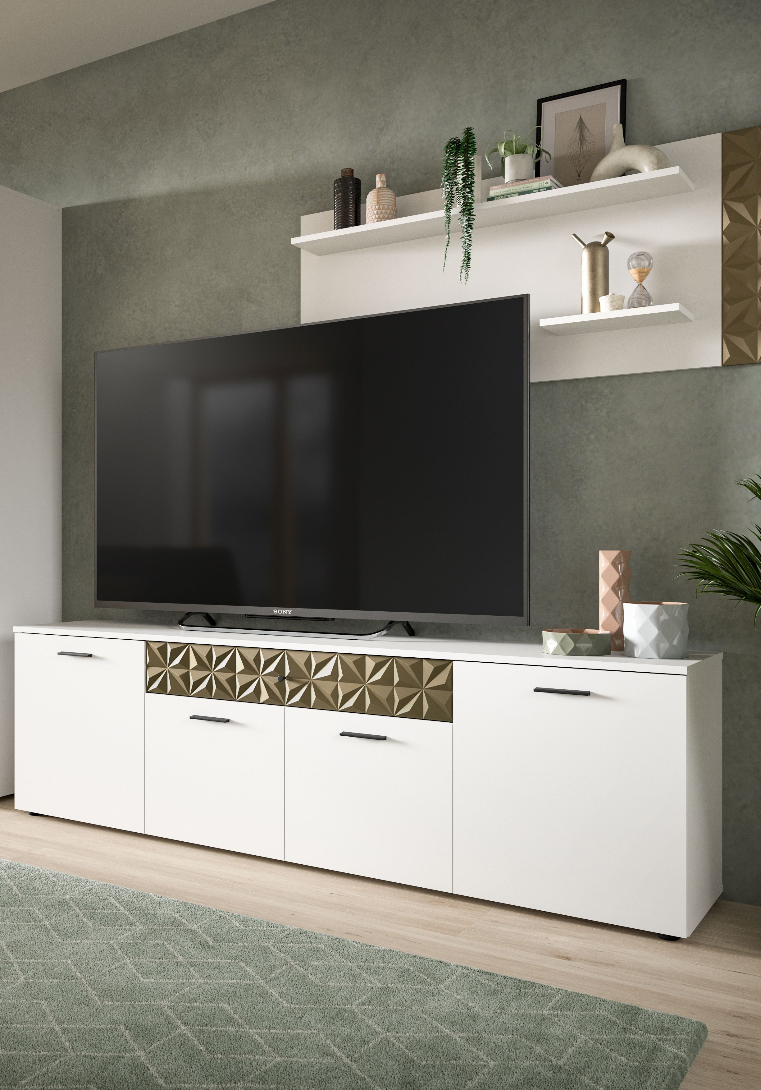 Ein Lowboard mit den Maßen 190x57x37 cm in weißem Melamin und goldener Nachbildung klingt nach einem eleganten und modernen Möbelstück für Wohnzimmer. Diese Größe bietet ausreichend Platz für deinen Fernseher, Multimedia-Geräte und zusätzlichen Stauraum für DVDs, Bücher oder Dekorationsgegenstände. Die Kombination von weißem Melamin und goldener Nachbildung verleiht dem Lowboard ein luxuriöses und stilvolles Aussehen. Das weiße Melamin sorgt für eine helle und saubere Optik, während die goldene Nachbildung einen Hauch von Eleganz und Glamour hinzufügt.