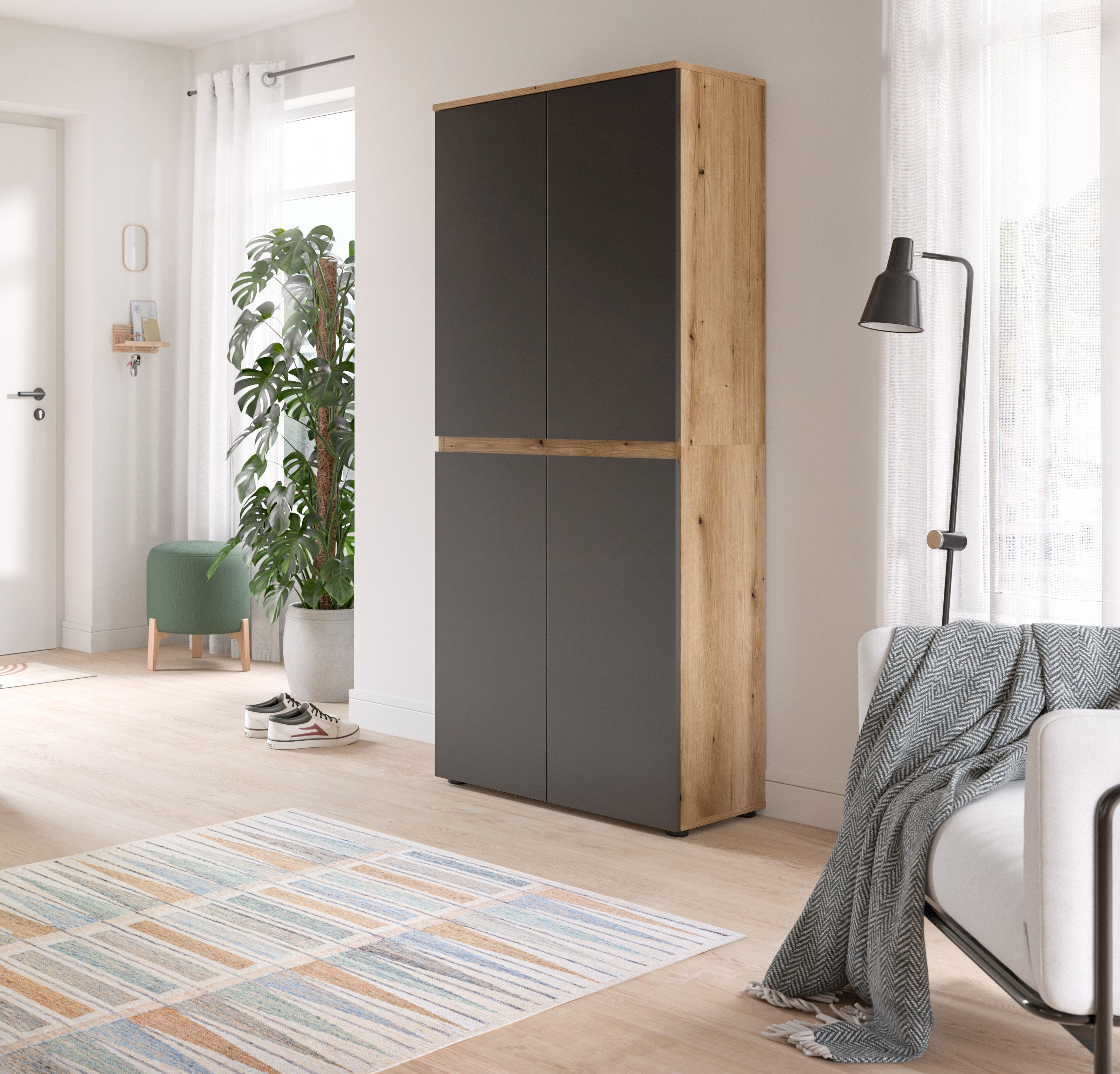 Dieser praktische Universalschrank in Evoke Eiche und Anthrazit bietet mit den Maßen 70x175x37 cm eine clevere Kombination aus Stauraum und Ordnung. Dank der 1 stabilen Kleiderstange finden Jacken, Mäntel oder Hemden ihren Platz, während die 7 variablen Einlegeböden für maximale Flexibilität beim Einräumen sorgen. Ob Schuhe, Textilien, Aktenordner oder Haushaltsutensilien – dieser Schrank passt sich deinen Bedürfnissen mühelos an. Mit seinem zeitlosen Design fügt er sich harmonisch in jeden Wohnraum, Flur oder Keller ein und ist die perfekte Wahl für alle, die platzsparende Ordnung schätzen.