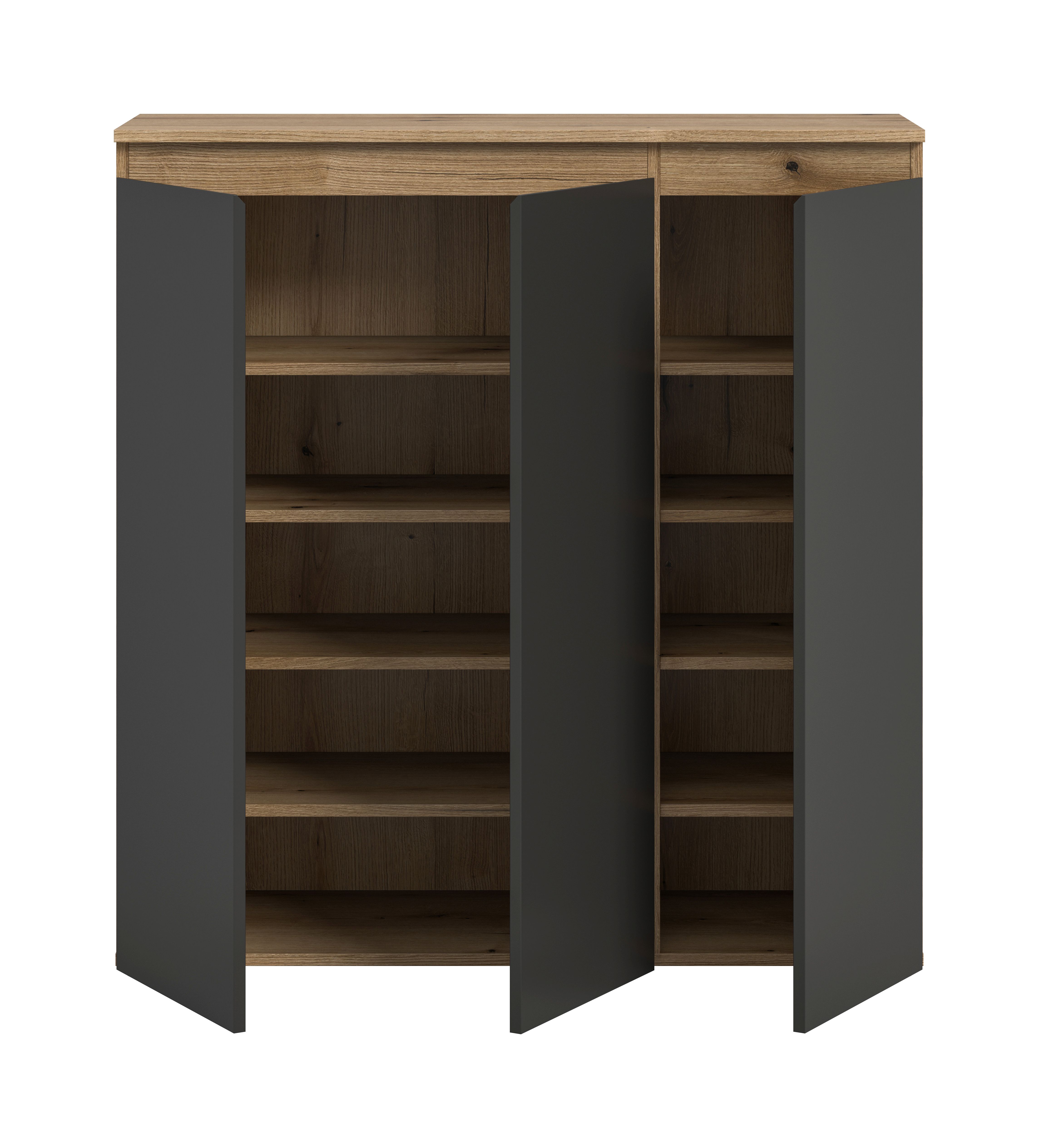 Kompakt, modern und vielseitig – der Universalschrank in Evoke Eiche Holznachbildung und Anthrazit mit den Maßen 105x111x37 cm ist die ideale Lösung für kleine Räume und Nischen. Mit 8 individuell verstellbaren Einlegeböden bietet er ausreichend Platz für Kleidung, Schuhe, Ordner oder Haushaltsartikel. Durch sein schlankes, geradliniges Design passt er sich jedem Wohnstil an und wirkt stets modern und unaufdringlich. Ob im Büro, im Flur, in der Abstellkammer oder im Kinderzimmer – dieser Schrank sorgt überall für aufgeräumte Ordnung.