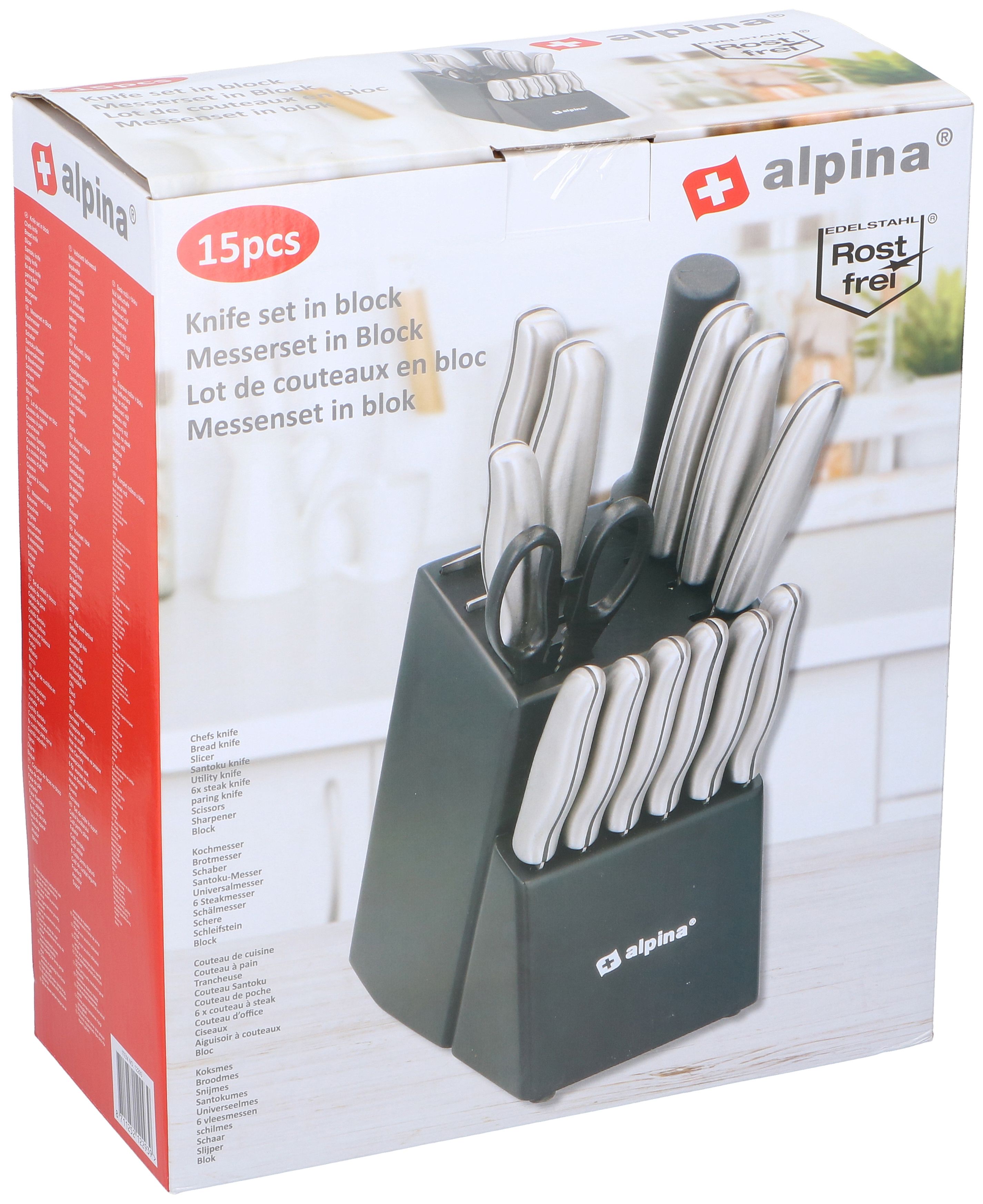 Set bestehend aus : Kochmesser, Brotmesser, Schaber, Santoku-Messer, Universalmesser, 6x Steakmesser, Schälmesser, Schere, Schleifstein, Block