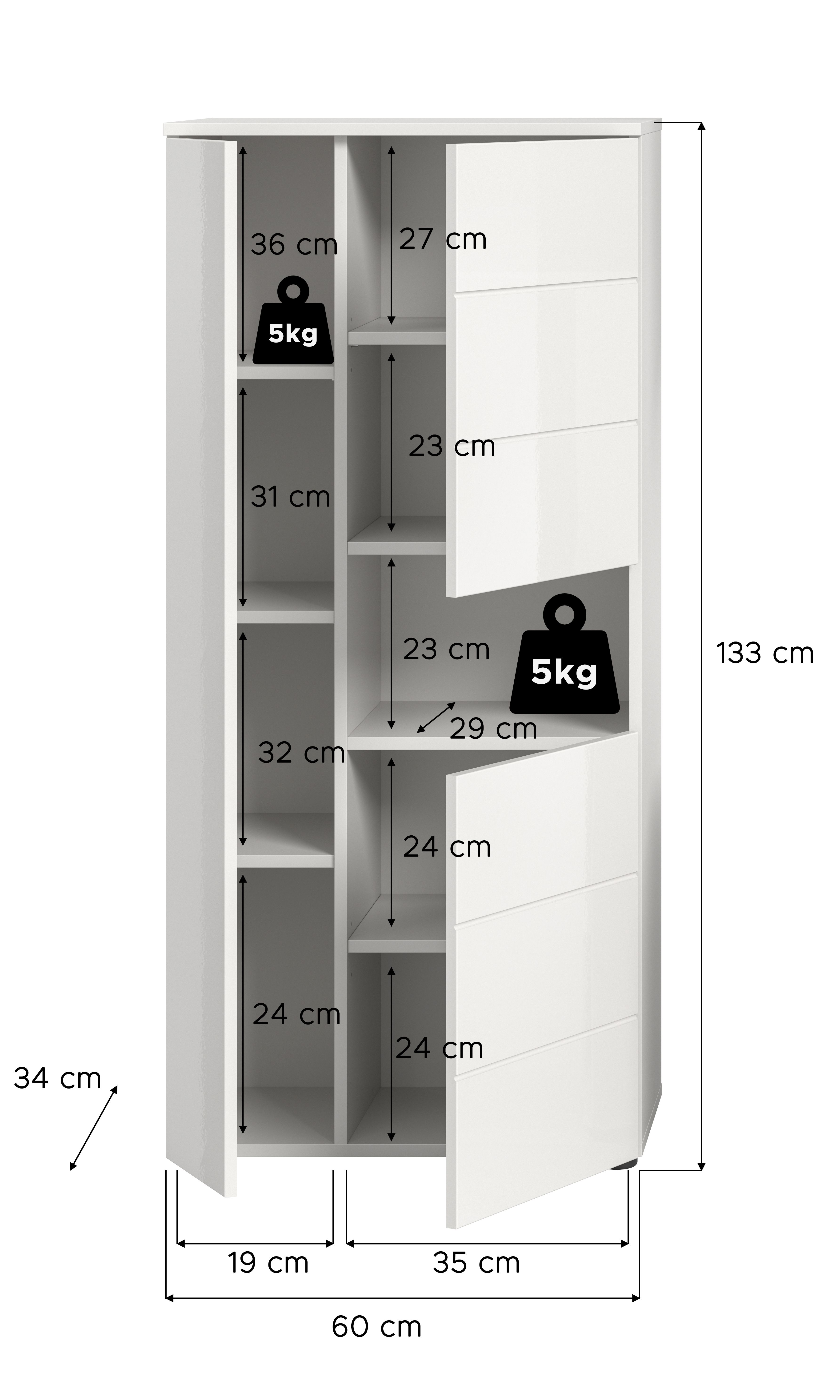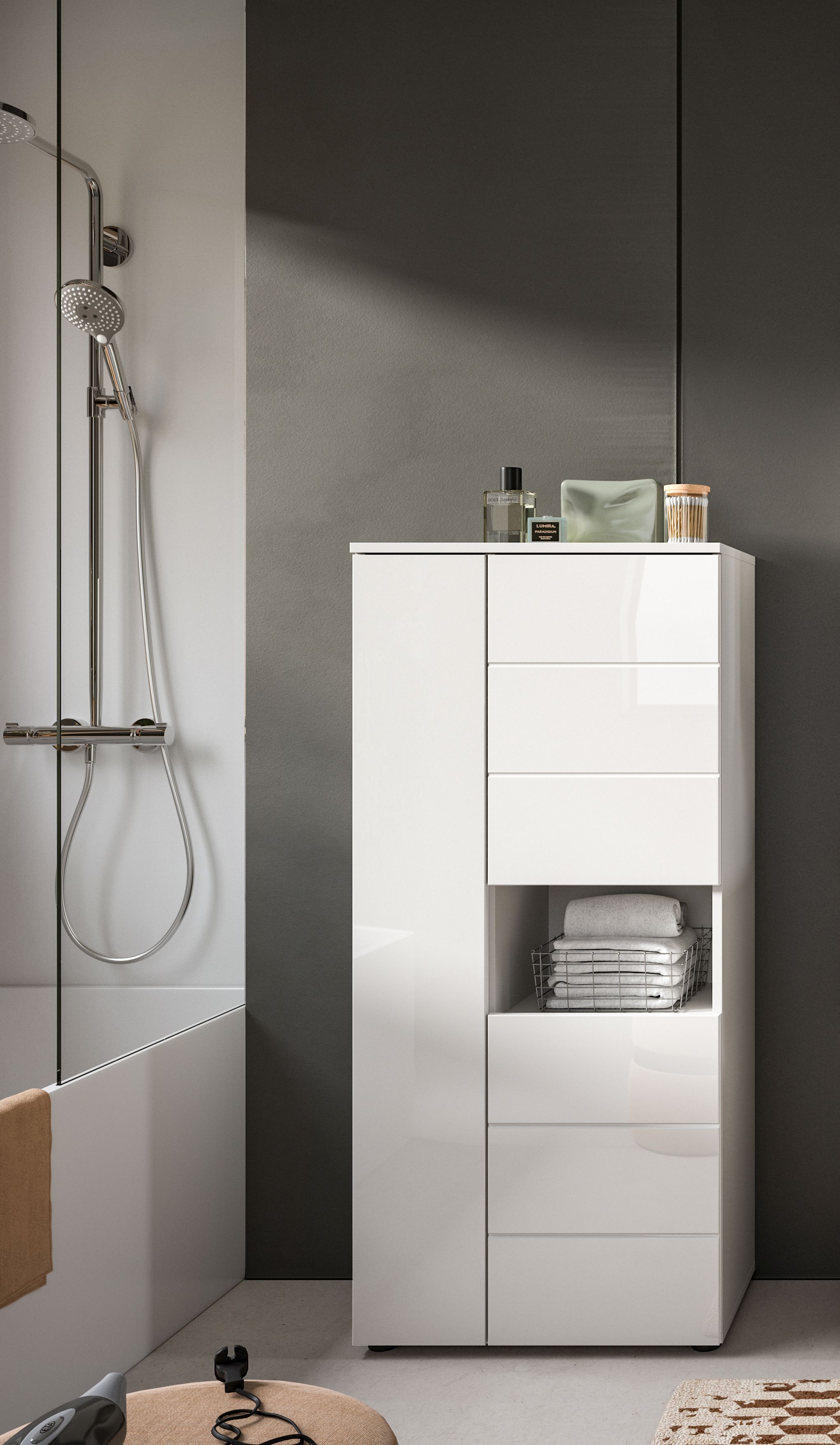Der Badschrank (B/H/T: 60x131x34 cm) in stilvoller weißer Hochglanz-Tiefzieh-Optik ist die perfekte Wahl für Ihre Badezimmereinrichtung. Er bietet genug Stauraum für Handtücher, Pflegeprodukte und andere Badezimmerutensilien, während die glatte Oberfläche einen modernen Look schafft. Der Schrank lässt sich problemlos in jede Badgestaltung integrieren und sorgt für eine organisierte und aufgeräumte Atmosphäre.