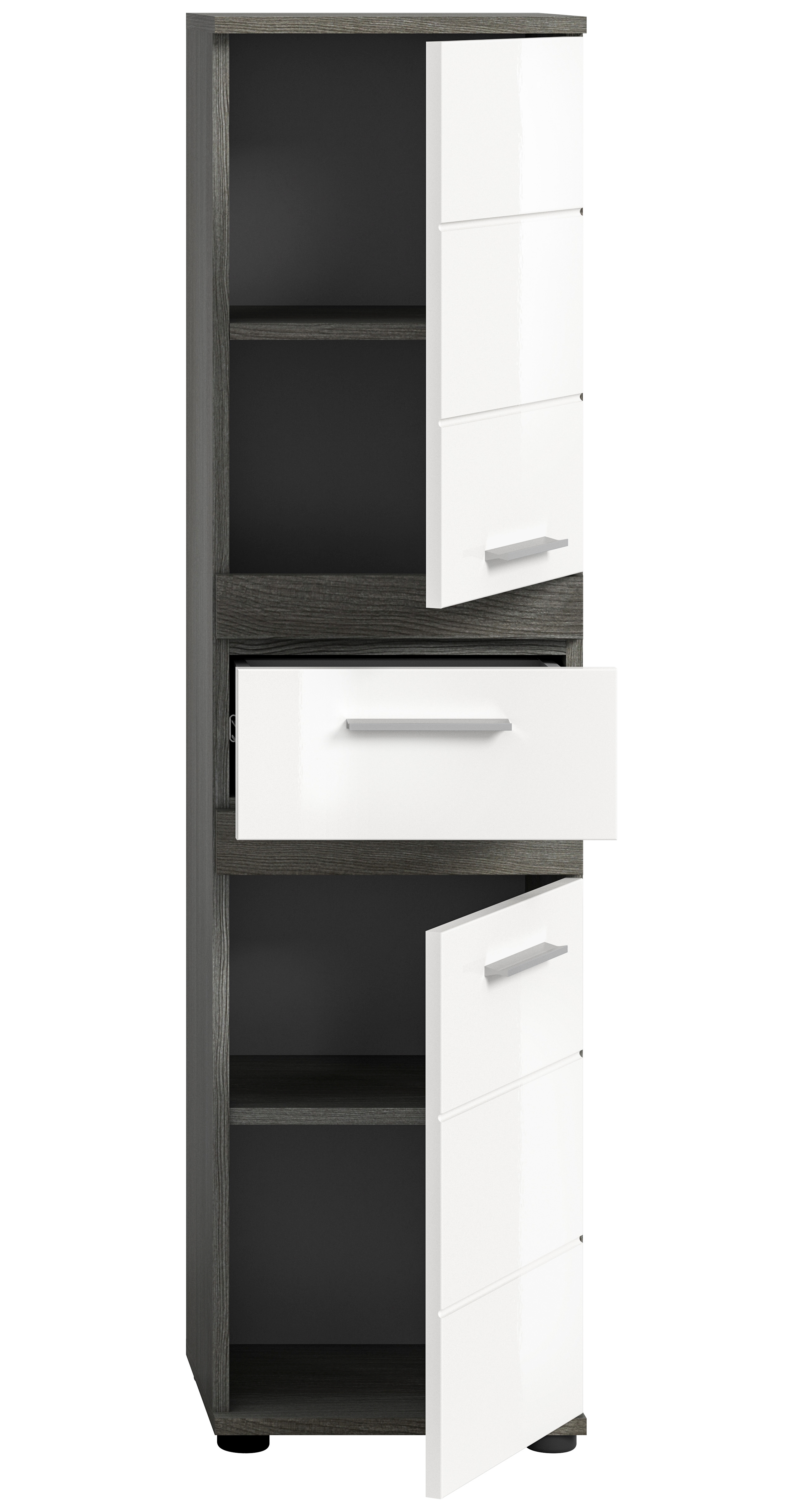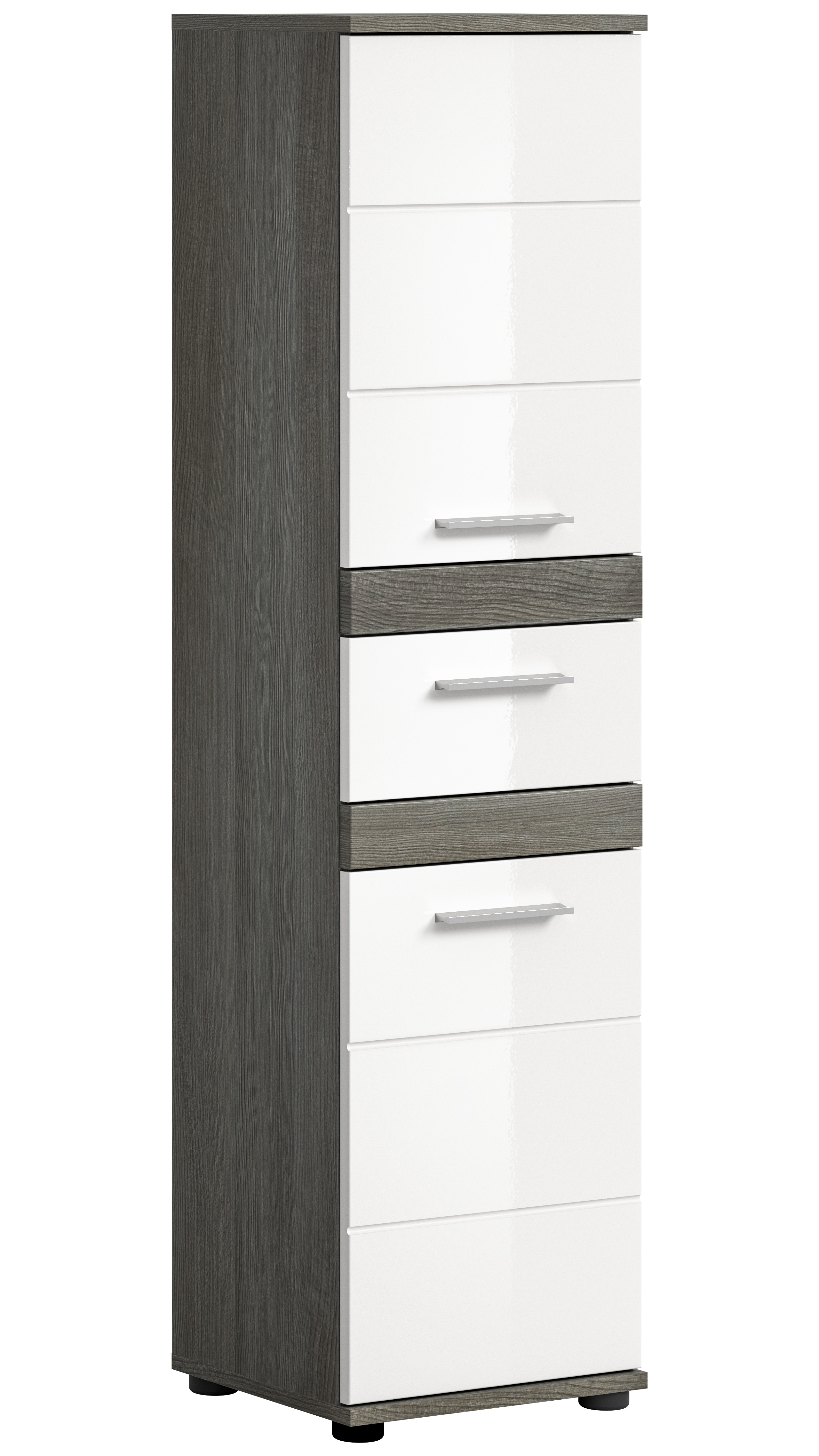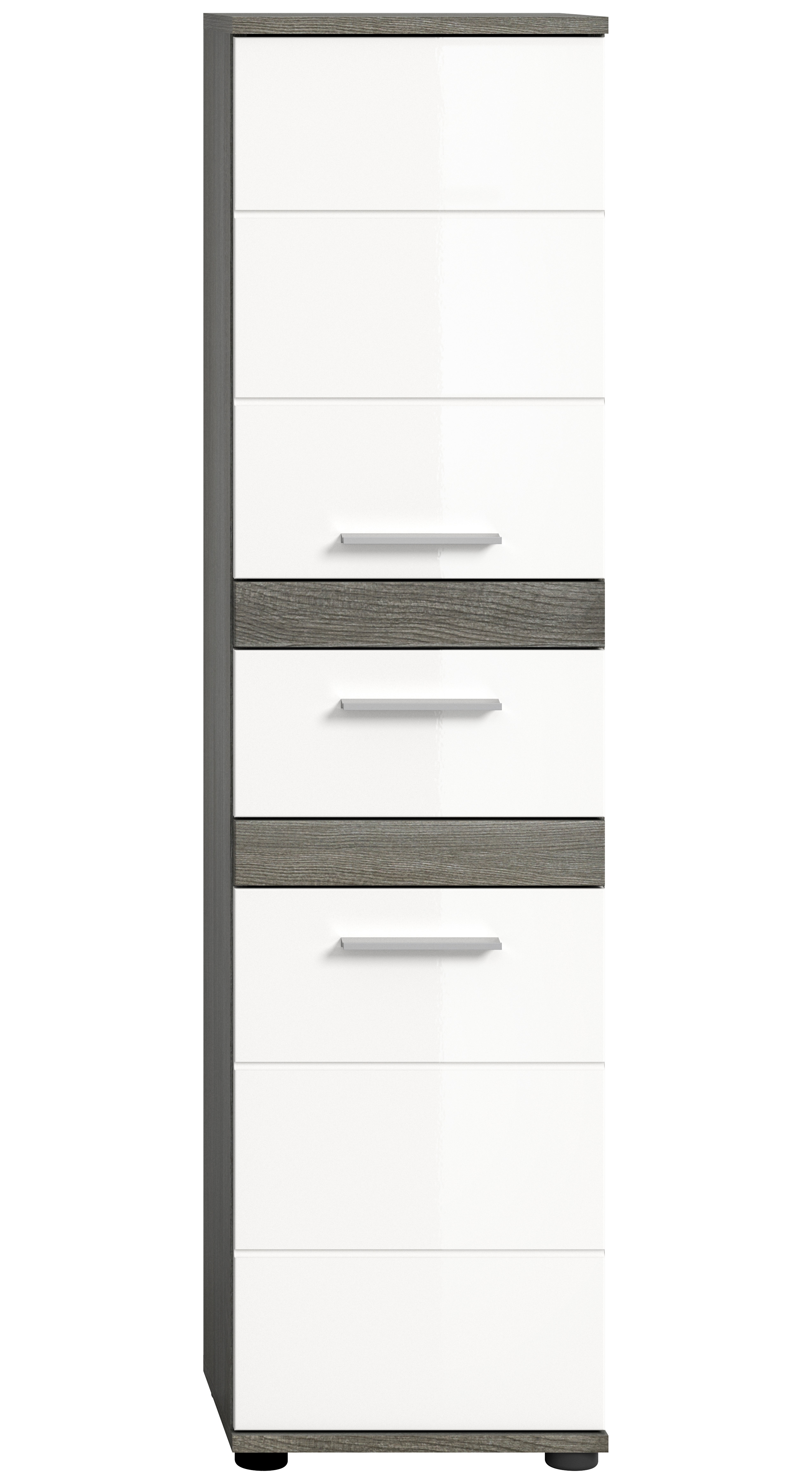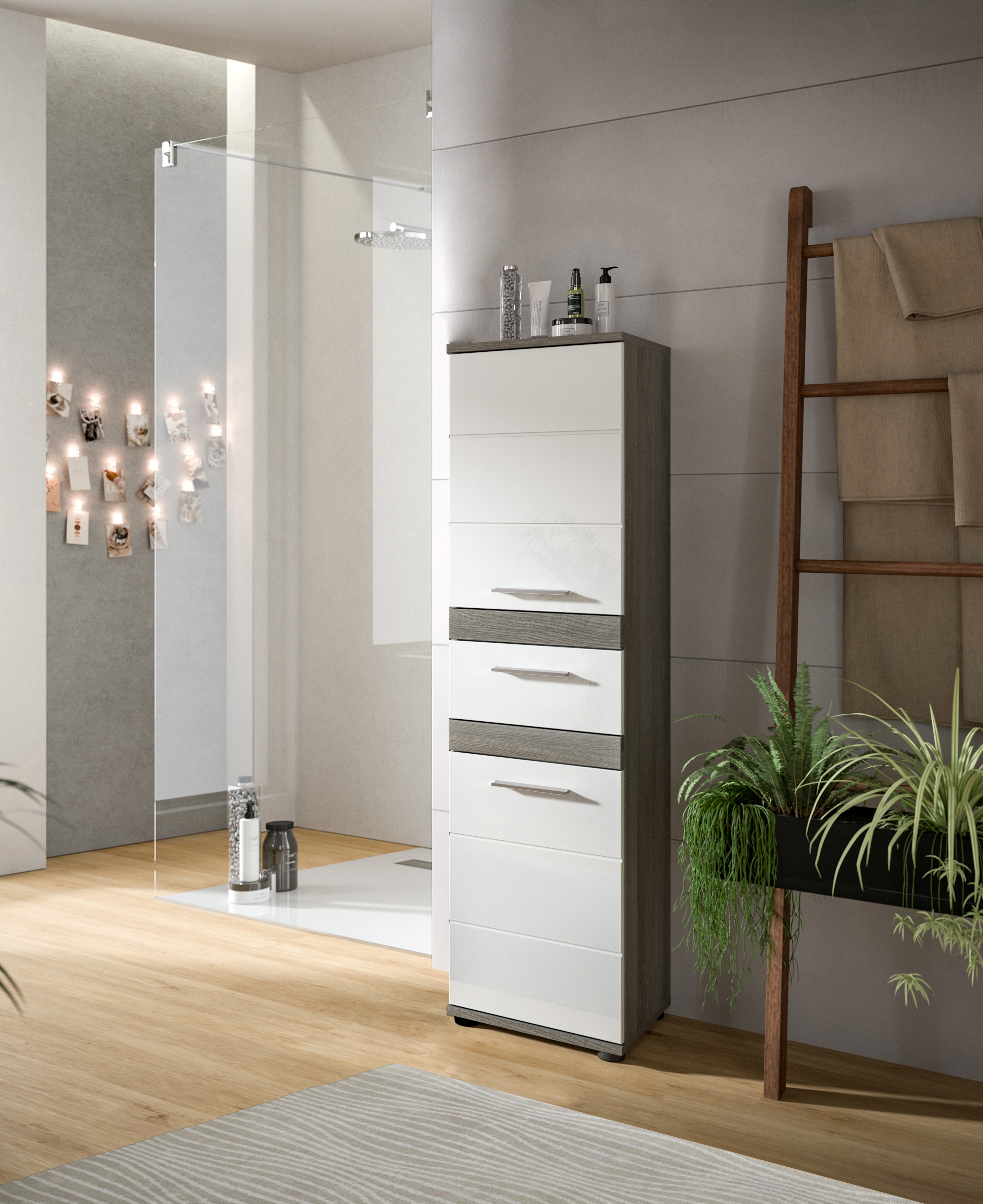 - Design/Stil: Kompakter Standschrank mit einem attraktiven Kontrast aus Rauchsilber und weißem Hochglanz , der eine moderne und elegante Note in das Badezimmer bringt.