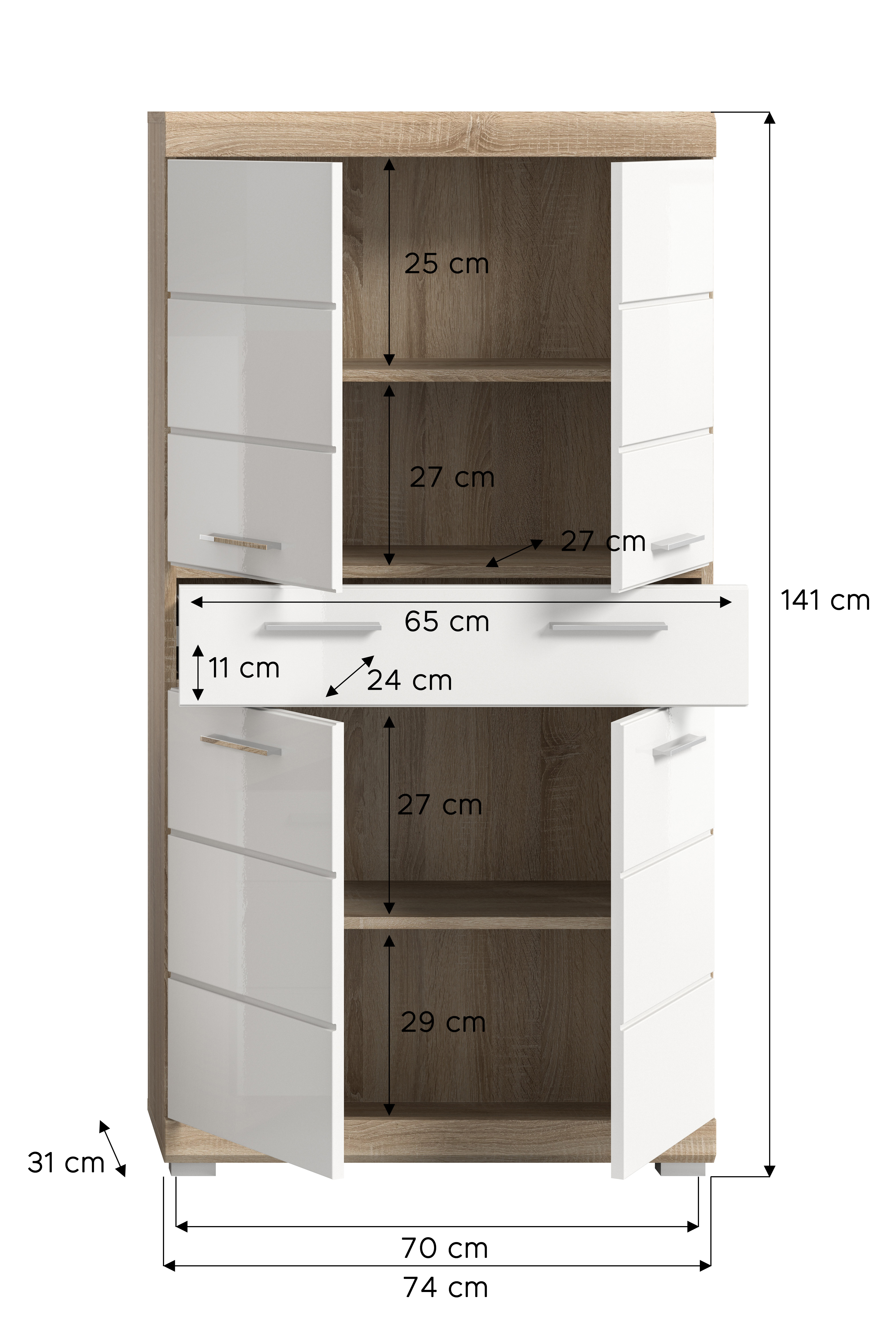 - Funktionalität: Mit kompakten Abmessungen bietet der Midischrank genügend Stauraum für die Aufbewahrung von Reinigungsutensilien, Handtüchern oder anderen Haushaltsgegenständen und trägt zur Organisation des Raumes bei.