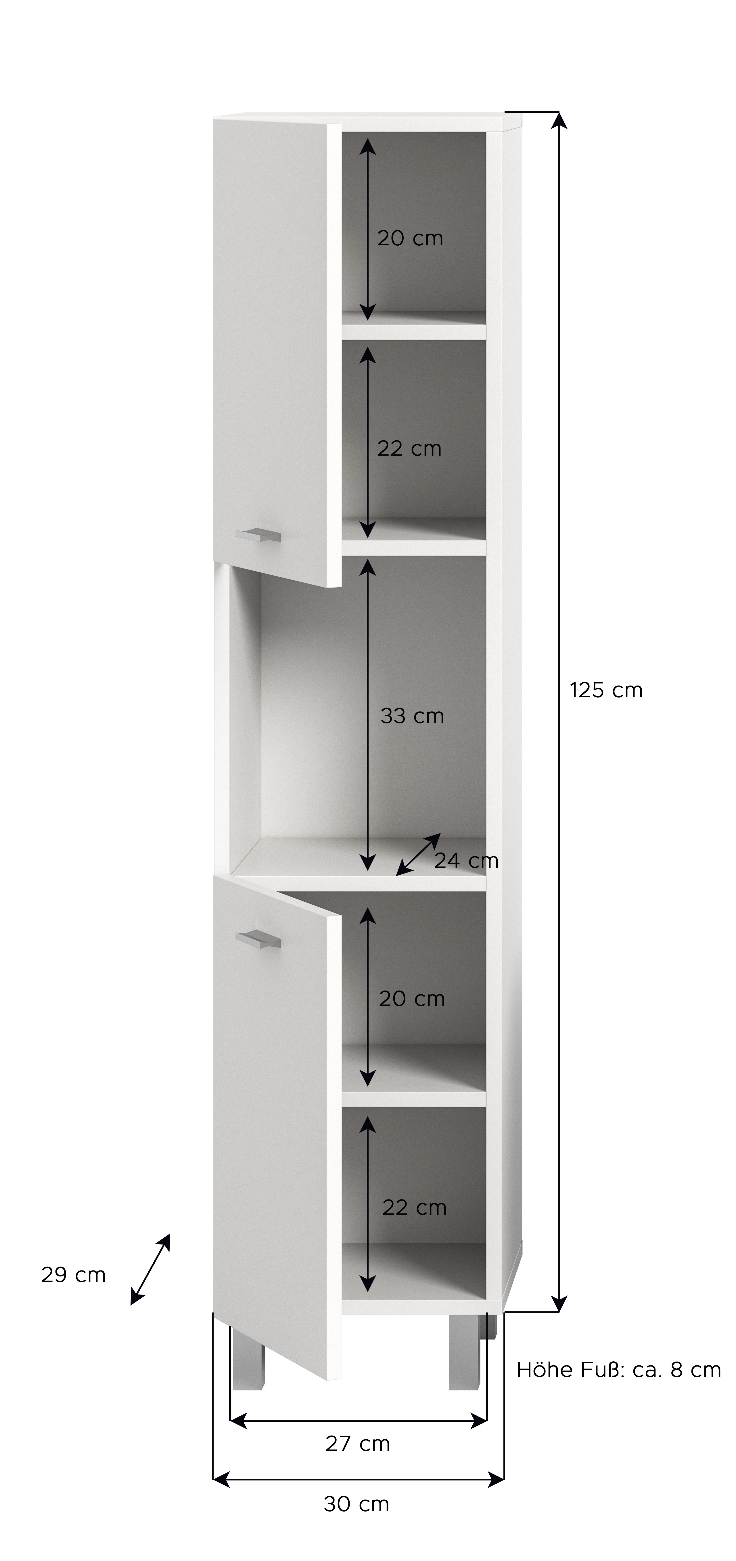 Unser Badschrank mit den Maßen 30x125x29 cm ist sowohl bodenstehend als auch hängend montierbar, wodurch er sich flexibel an Ihre Raumsituation anpasst. Mit seinem schlichten und dennoch modernen Design in weißer Nachbildung fügt sich dieser Schrank nahtlos in jedes Badezimmer ein. Entdecken Sie jetzt diese vielseitige Lösung und optimieren Sie Ihre Badorganisation.