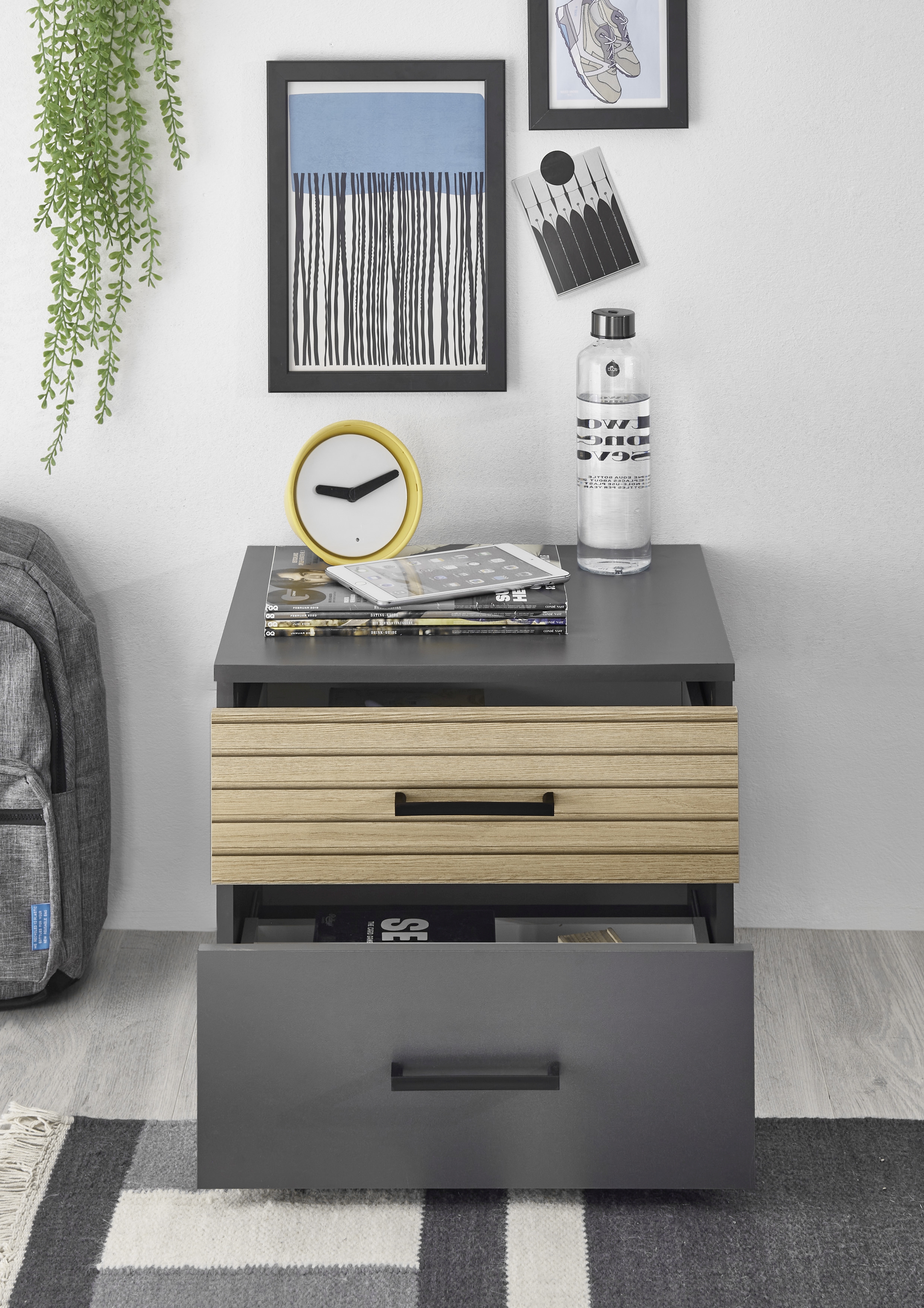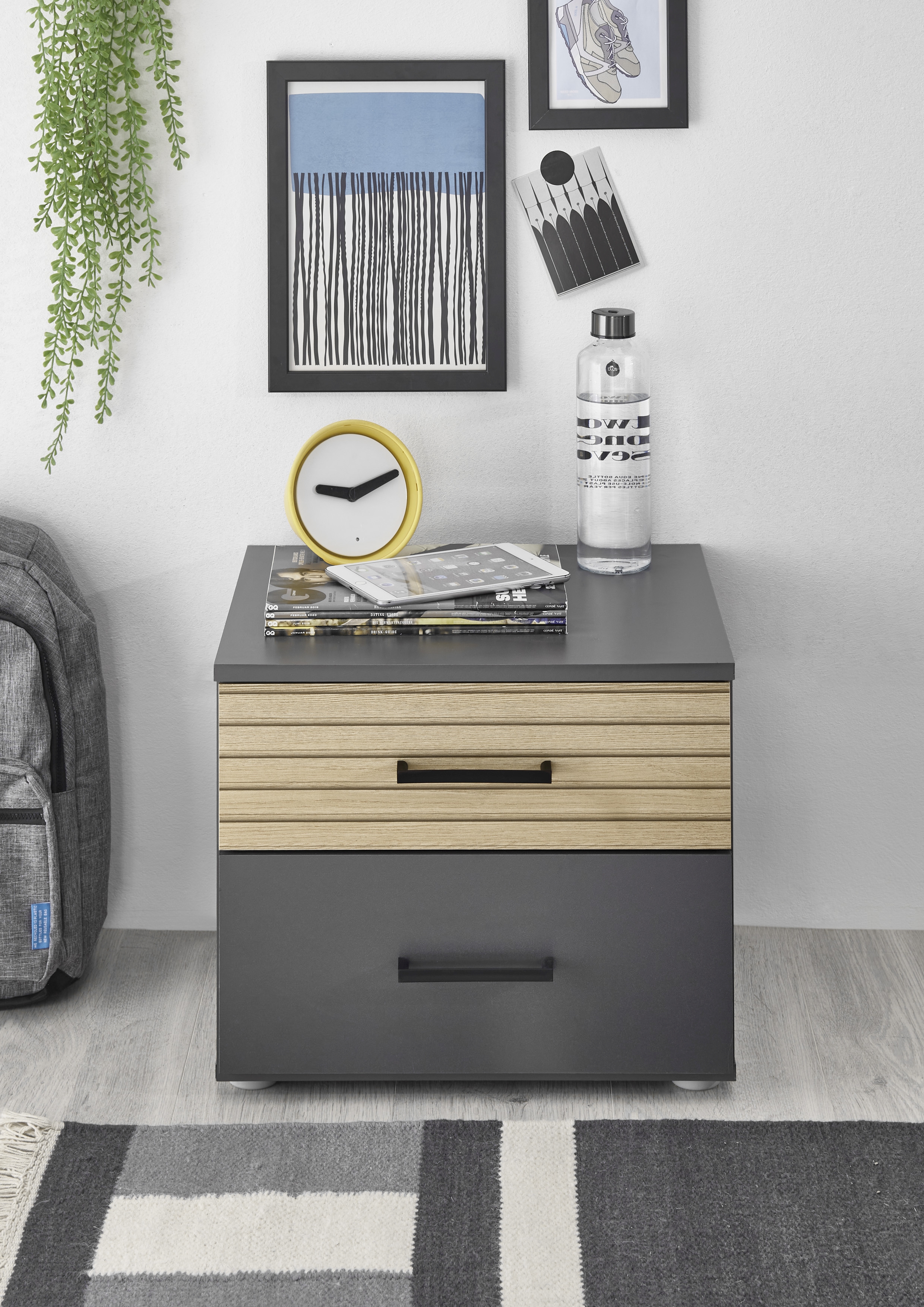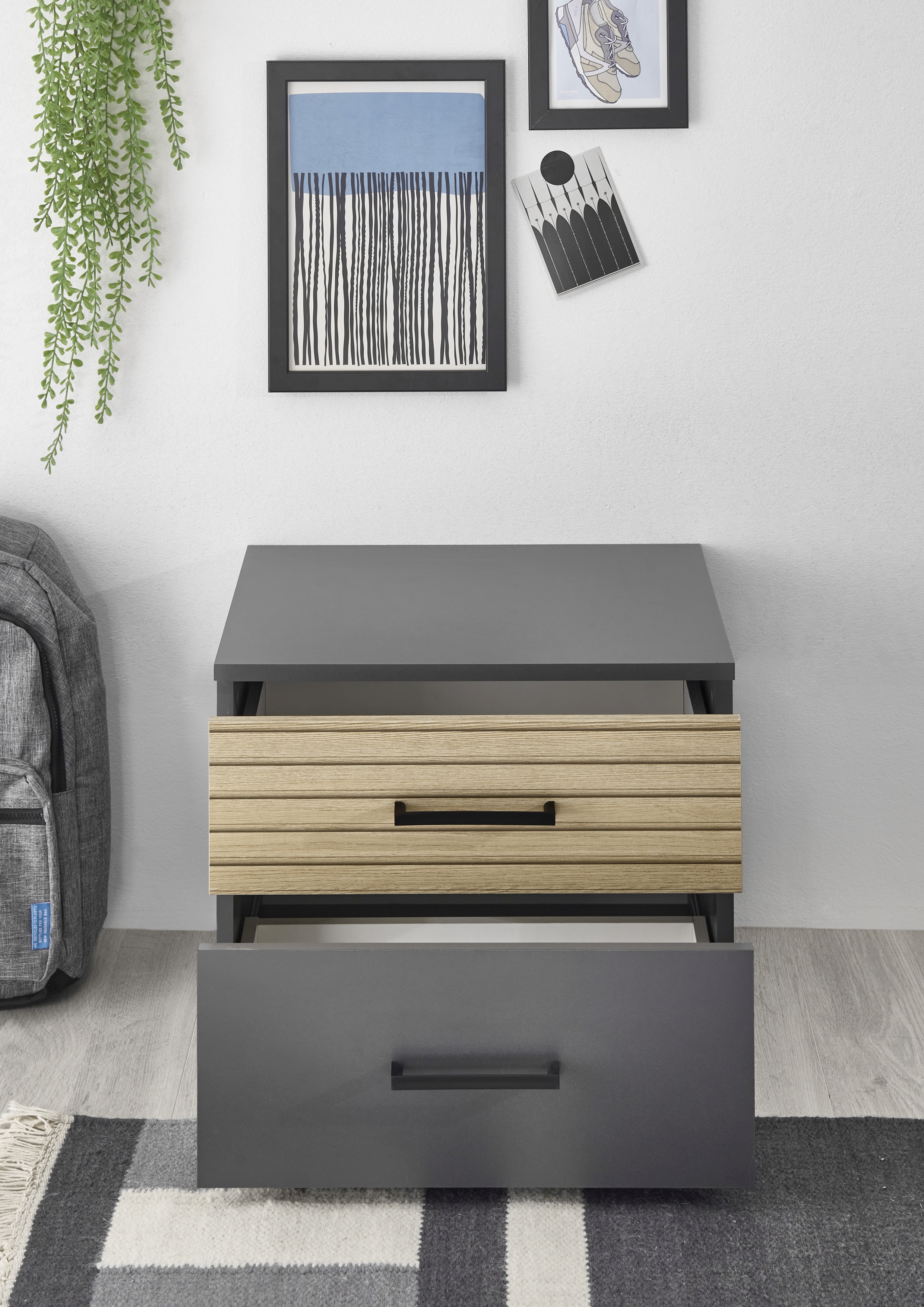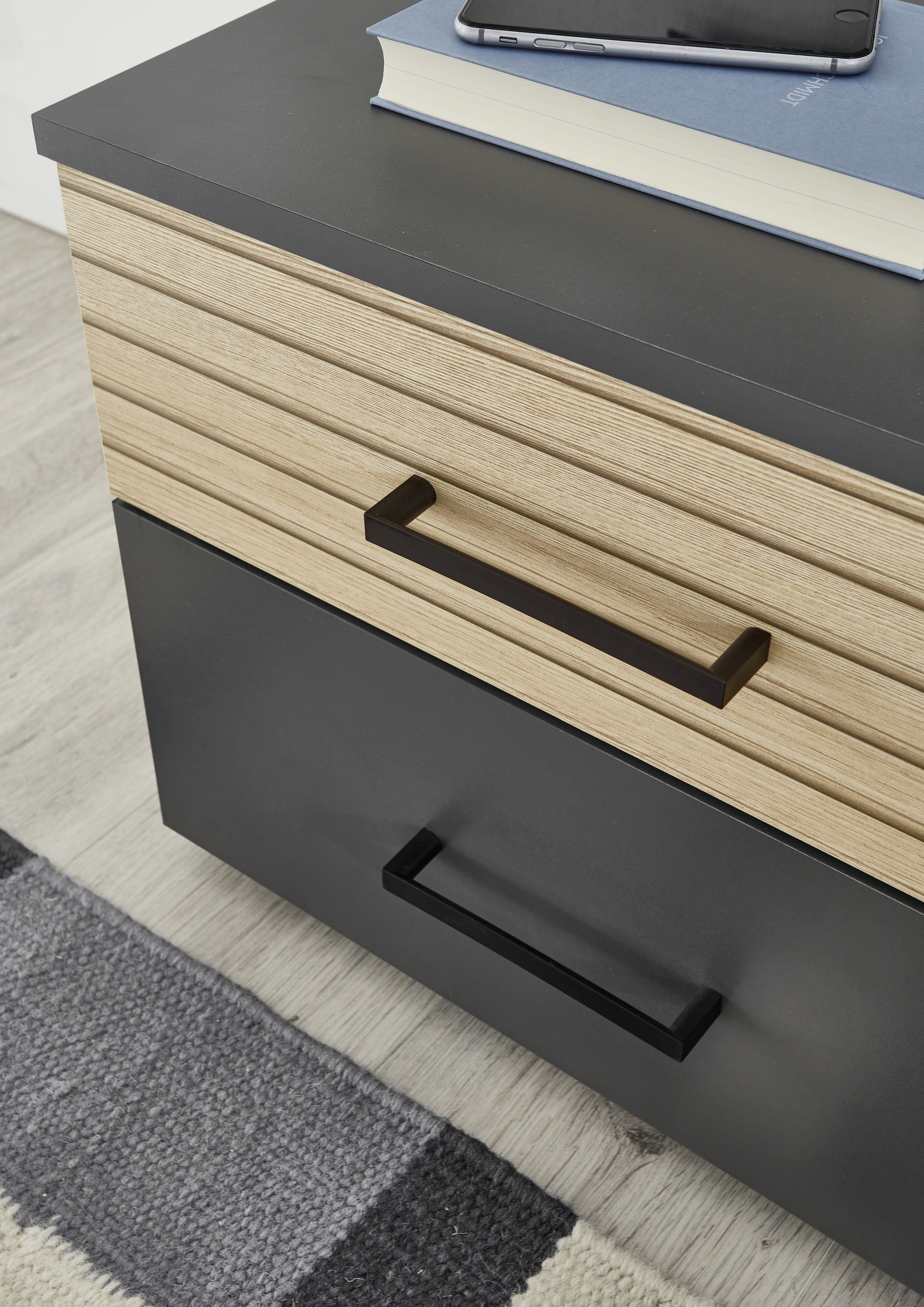 Graphit mit einer Schubkastenfront in Eiche Lamelle Holznachbildung, Melaminbeschichtung