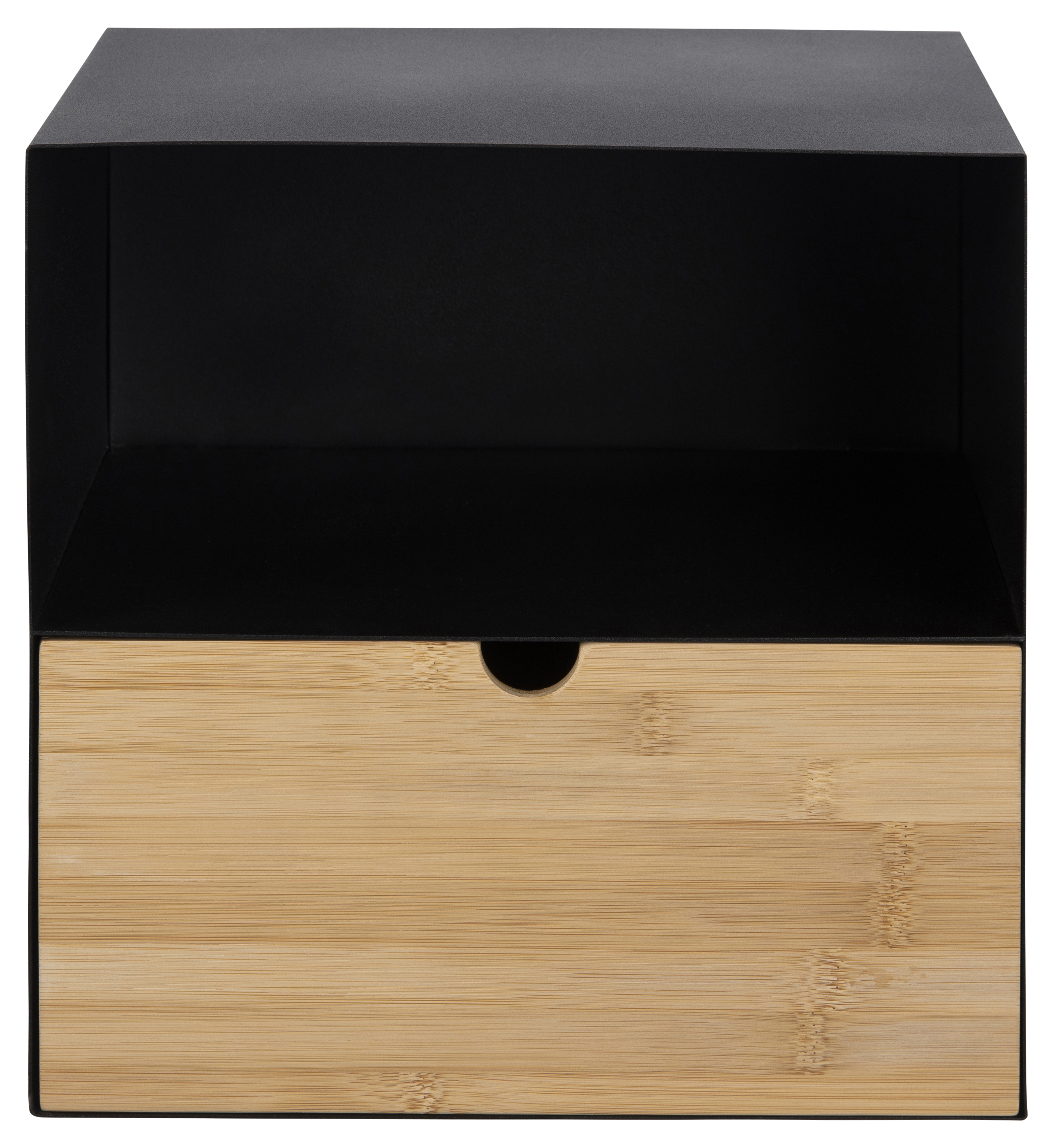Korpus und Fronten: Metall in matt schwarz rau pulverbeschichtet kombiniert mit einem Schubkasten in Bambus massiv (China) NC lackiert