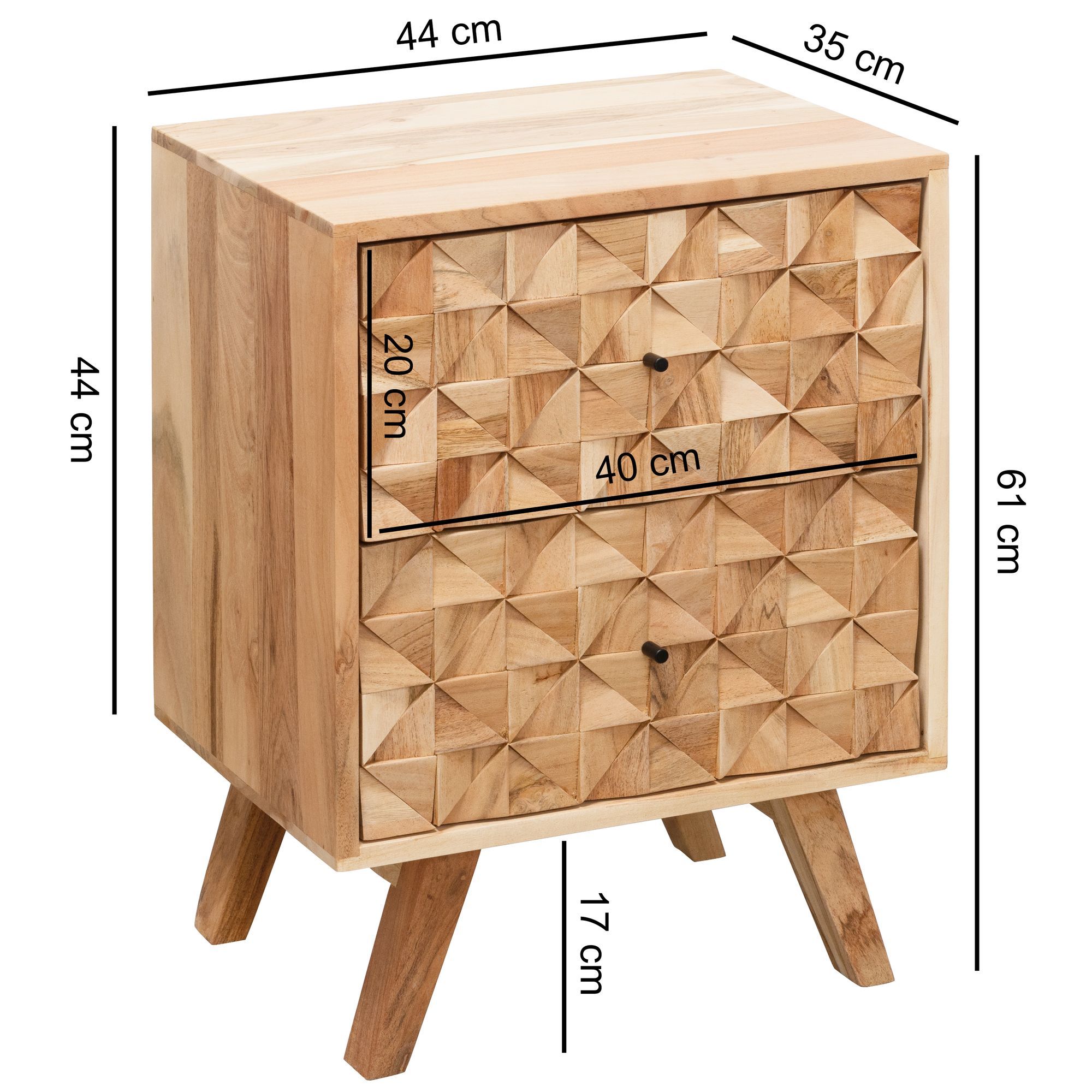 - AUGENSCHMAUS ✔ Kleine Dreiecke aus Akazie schmiegen sich optimal an das jeweils nebenliegende Dreieck an und ergeben so die wunderschönen Schubladenfronten. Aufgrund der Größe ist das Nachtschränkchen perfekt für Boxspringbetten geeignet. Schreibtischlampe, Wecker und Co. finden auf der großzügigen Ablagefläche Ihren Platz, während sich z.B. Brille und Bücher in den beiden Schubladen verstauen lassen. Kunst mit Stauraum!