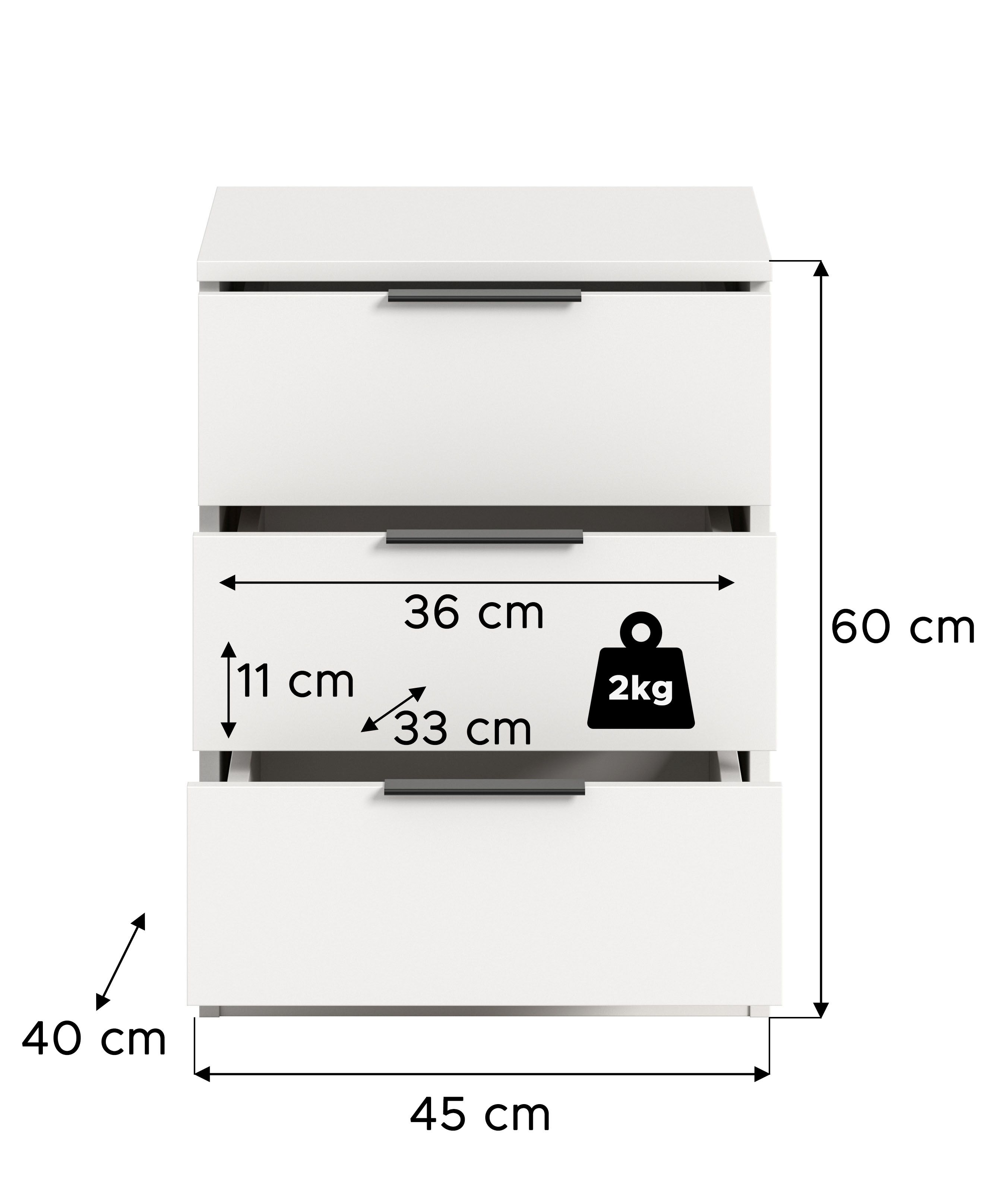 Diese Nachtkommode bietet Ihnen praktischen Stauraum direkt neben Ihrem Bett und sorgt für Ordnung in Ihrem Schlafzimmer. Mit ihrem klaren Design schafft sie eine ruhige Atmosphäre, die zum Entspannen einlädt. Die drei Schubkästen mit Vollauszug ermöglichen einen einfachen Zugriff auf Ihre persönlichen Gegenstände, während die pflegeleichten Oberflächen eine unkomplizierte Reinigung garantieren. Mit den Maßen 45 x 60 x 40 cm passt die Kommode perfekt auch in kleinere Räume und fügt sich harmonisch in verschiedene Einrichtungsstile ein. Ob für Bücher, Brillen oder Ihre Lieblingsnachtcreme – diese Kommode ist der ideale Begleiter für Ihre nächtlichen Routinen. Vertrauen Sie auf hochwertige Verarbeitung und langlebige Materialien, die Ihnen lange Freude bereiten. Gönnen Sie sich jetzt mehr Ordnung und Stil – bestellen Sie Ihre neue Nachtkommode noch heute!