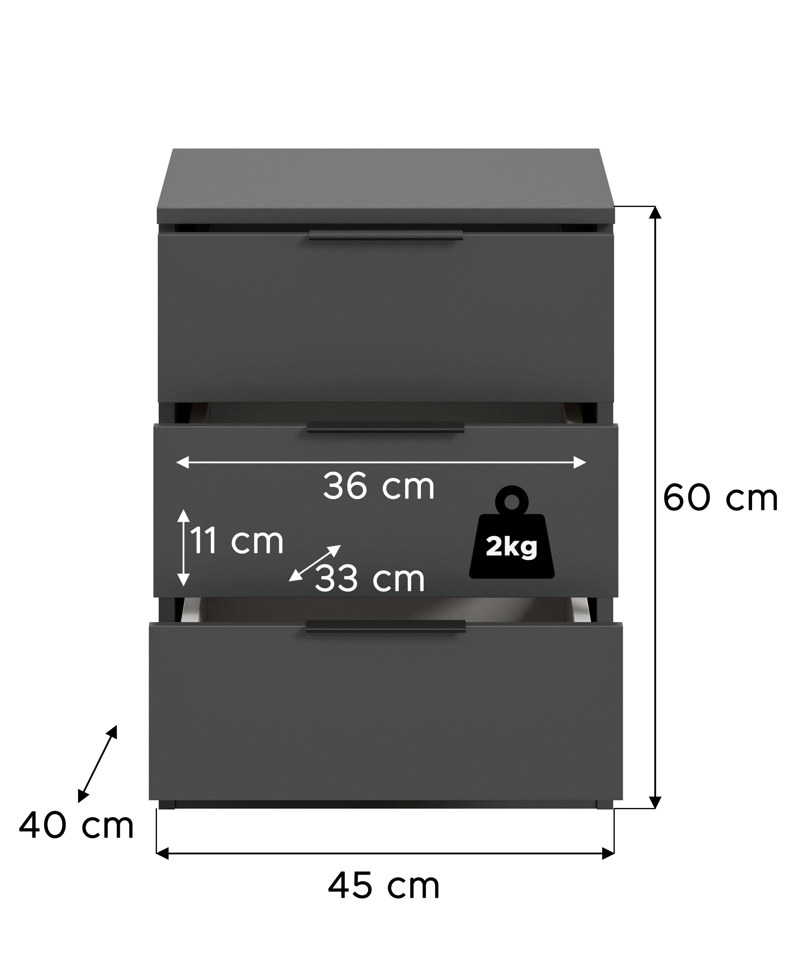 Diese Nachtkommode bietet Ihnen praktischen Stauraum direkt neben Ihrem Bett und sorgt für Ordnung in Ihrem Schlafzimmer. Mit ihrem klaren Design schafft sie eine ruhige Atmosphäre, die zum Entspannen einlädt. Die drei Schubkästen mit Vollauszug ermöglichen einen einfachen Zugriff auf Ihre persönlichen Gegenstände, während die pflegeleichten Oberflächen eine unkomplizierte Reinigung garantieren. Mit den Maßen 45 x 60 x 40 cm passt die Kommode perfekt auch in kleinere Räume und fügt sich harmonisch in verschiedene Einrichtungsstile ein. Ob für Bücher, Brillen oder Ihre Lieblingsnachtcreme – diese Kommode ist der ideale Begleiter für Ihre nächtlichen Routinen. Vertrauen Sie auf hochwertige Verarbeitung und langlebige Materialien, die Ihnen lange Freude bereiten. Gönnen Sie sich jetzt mehr Ordnung und Stil – bestellen Sie Ihre neue Nachtkommode noch heute!