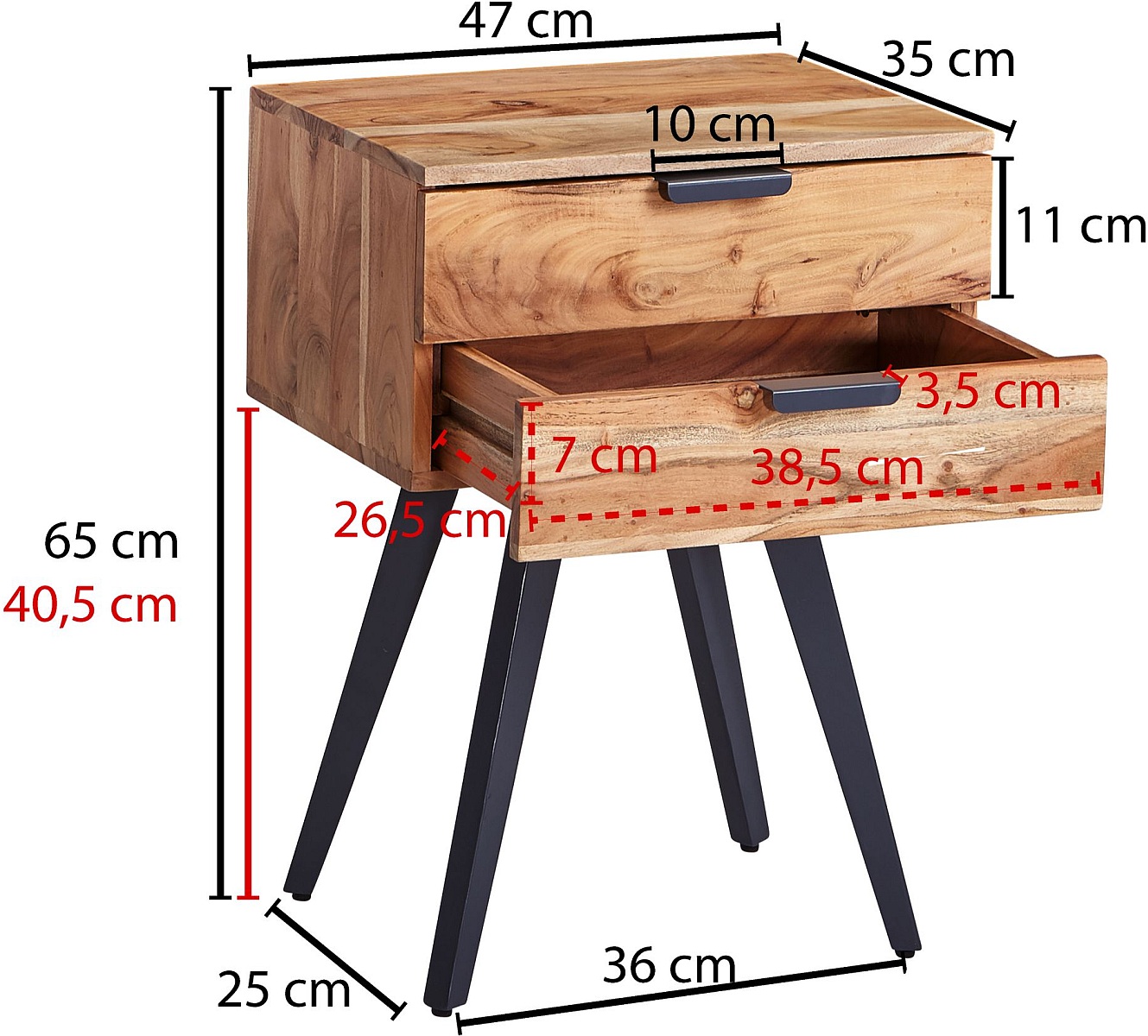MATERIAL ✔ Der Korpus besteht aus Akazie Massivholz, das mit schützendem Klarlack beschichtet ist. Die Beine und die Schubladengriffe sind aus lackiertem Eisen.