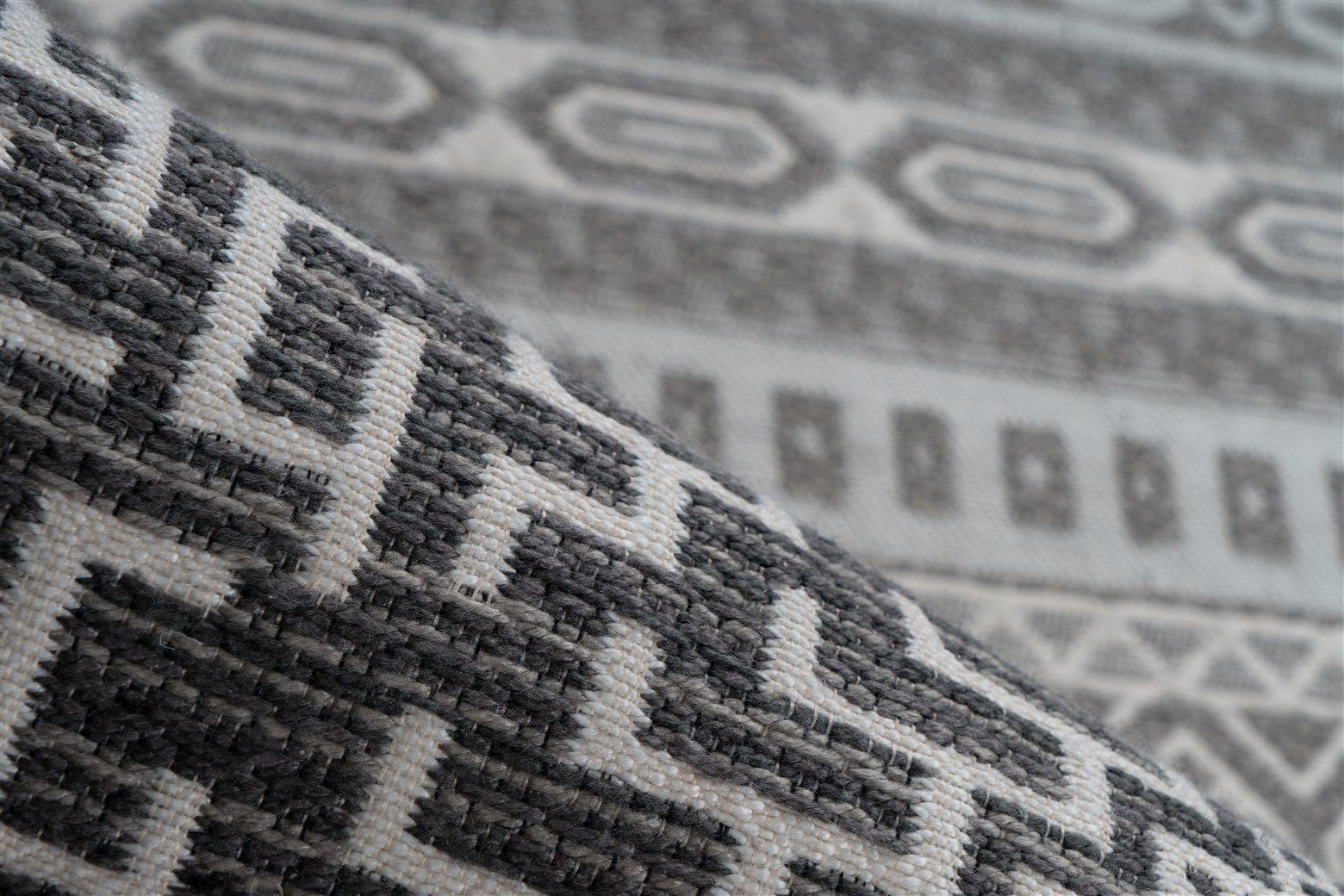 Das Material ist robust und widerstandsfähig und wetterfest. Dank eines wasserdurchlässigen Rückens aus Latex kann sich keine Nässe auf der Oberfläche stauen, sodass der Teppich bei Wind und Wetter im Außenbereich liegen bleiben kann.