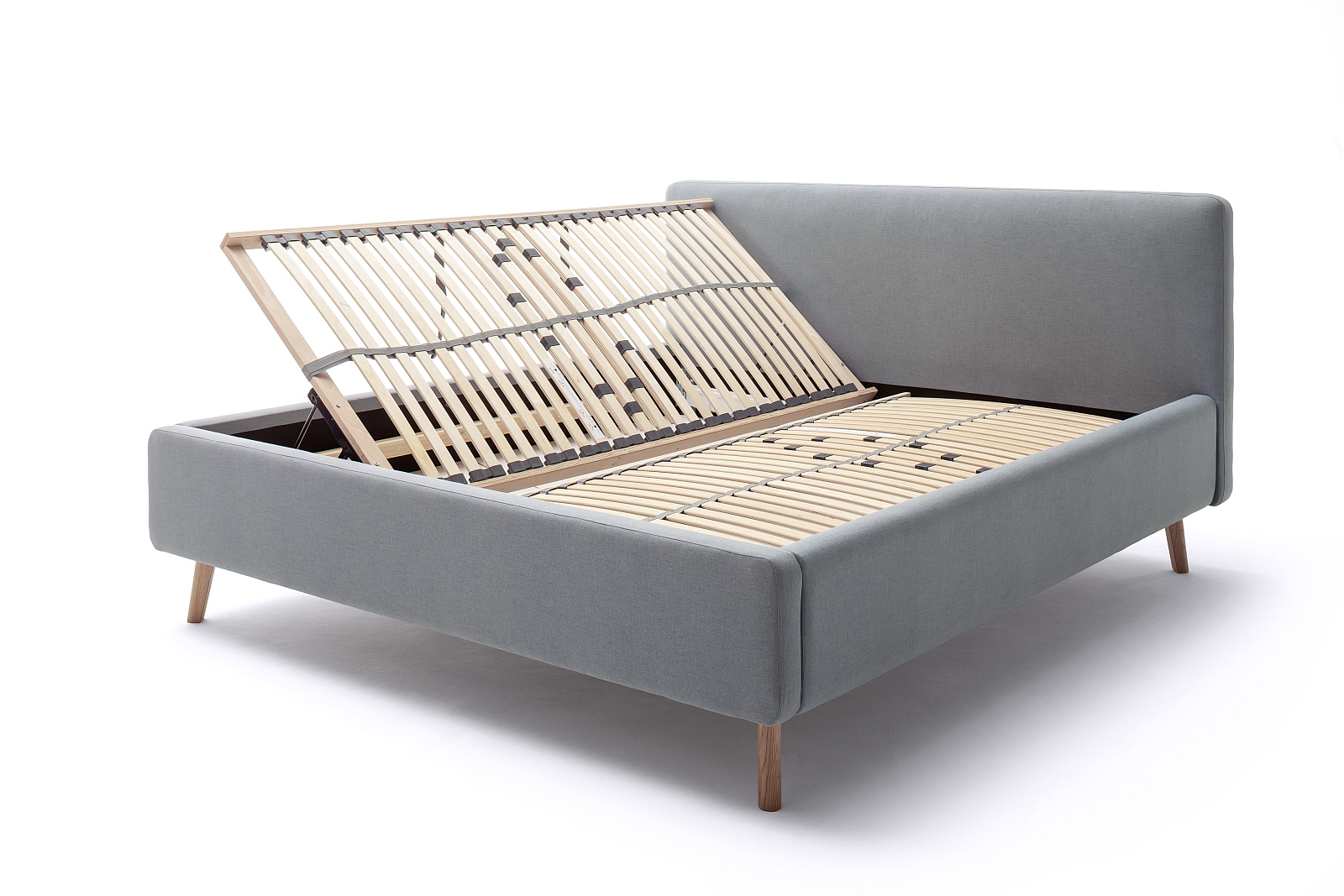 2 seitlich klappbare Federholzrahmen mit jeweils 28 Leisten, starr und mit Härtegradverstellung