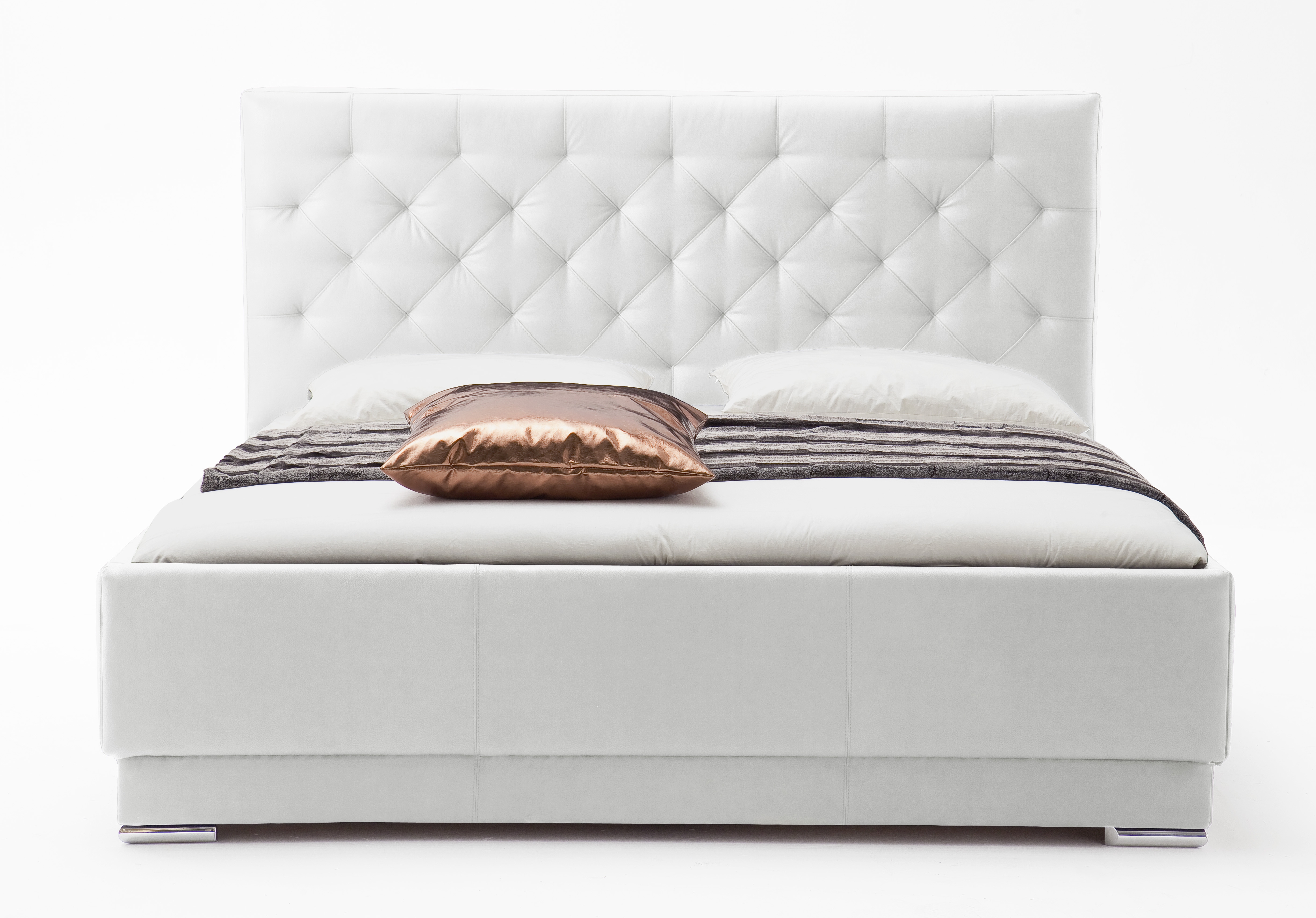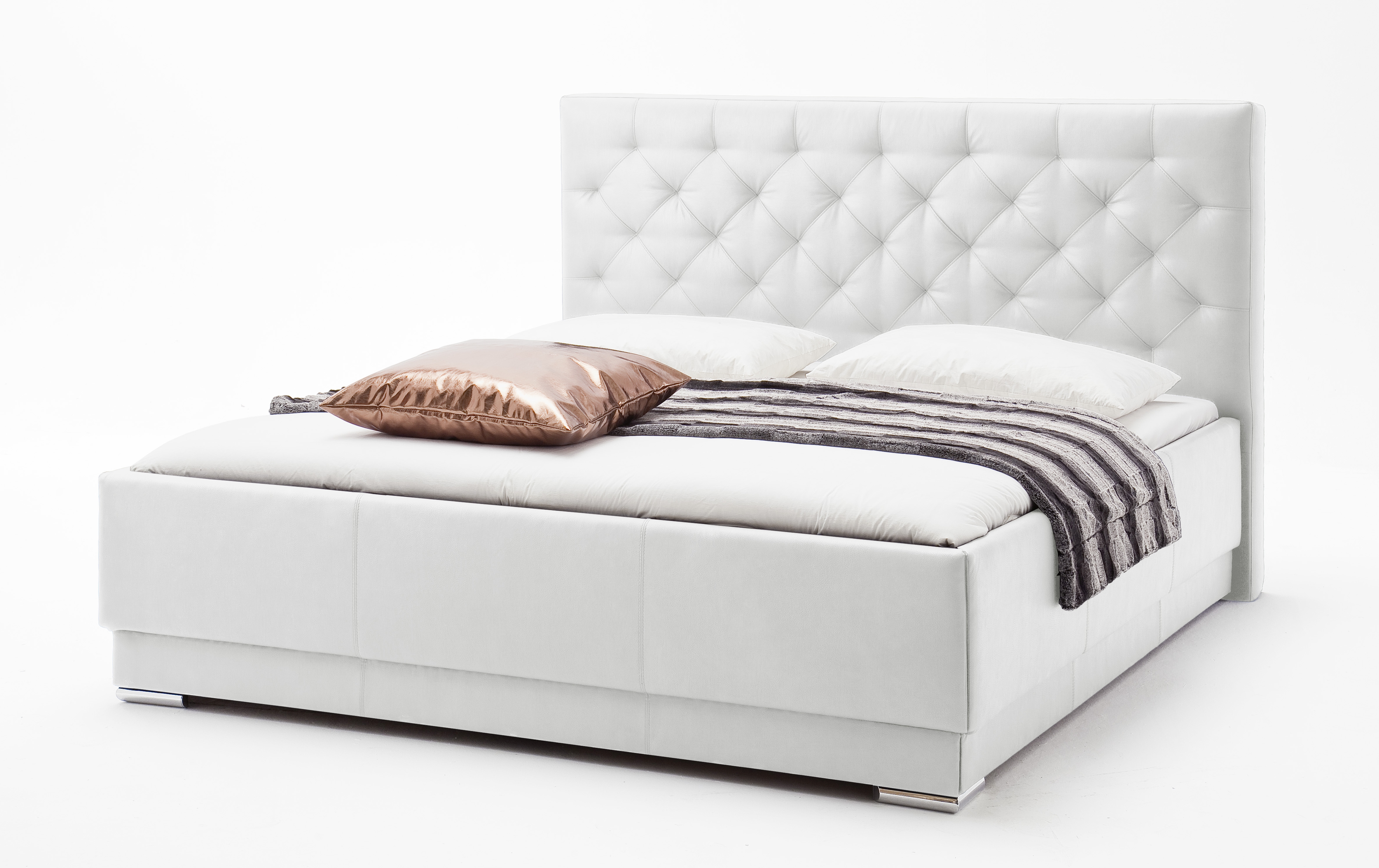 Polsterbett in der Farbe weiß mit einem Kunstlederbezug: Vorderseite 100% Polyurethan, Rückseite: 40% Baumwolle, 60% Polyester