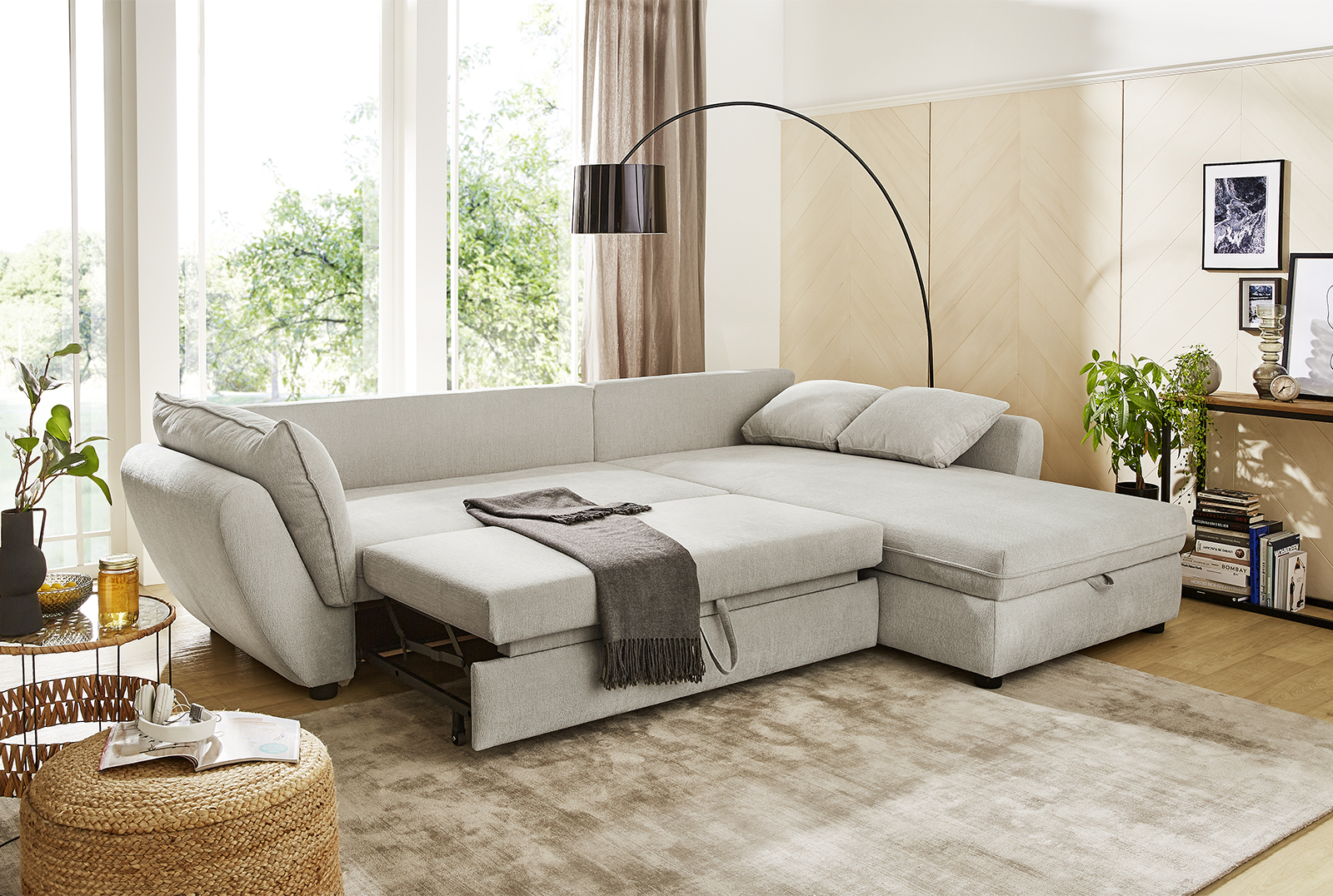 | Ausstattung Polster: | Ottomane rechts links wählbar, inkl. Bettkasten, inkl. Kissen | ||