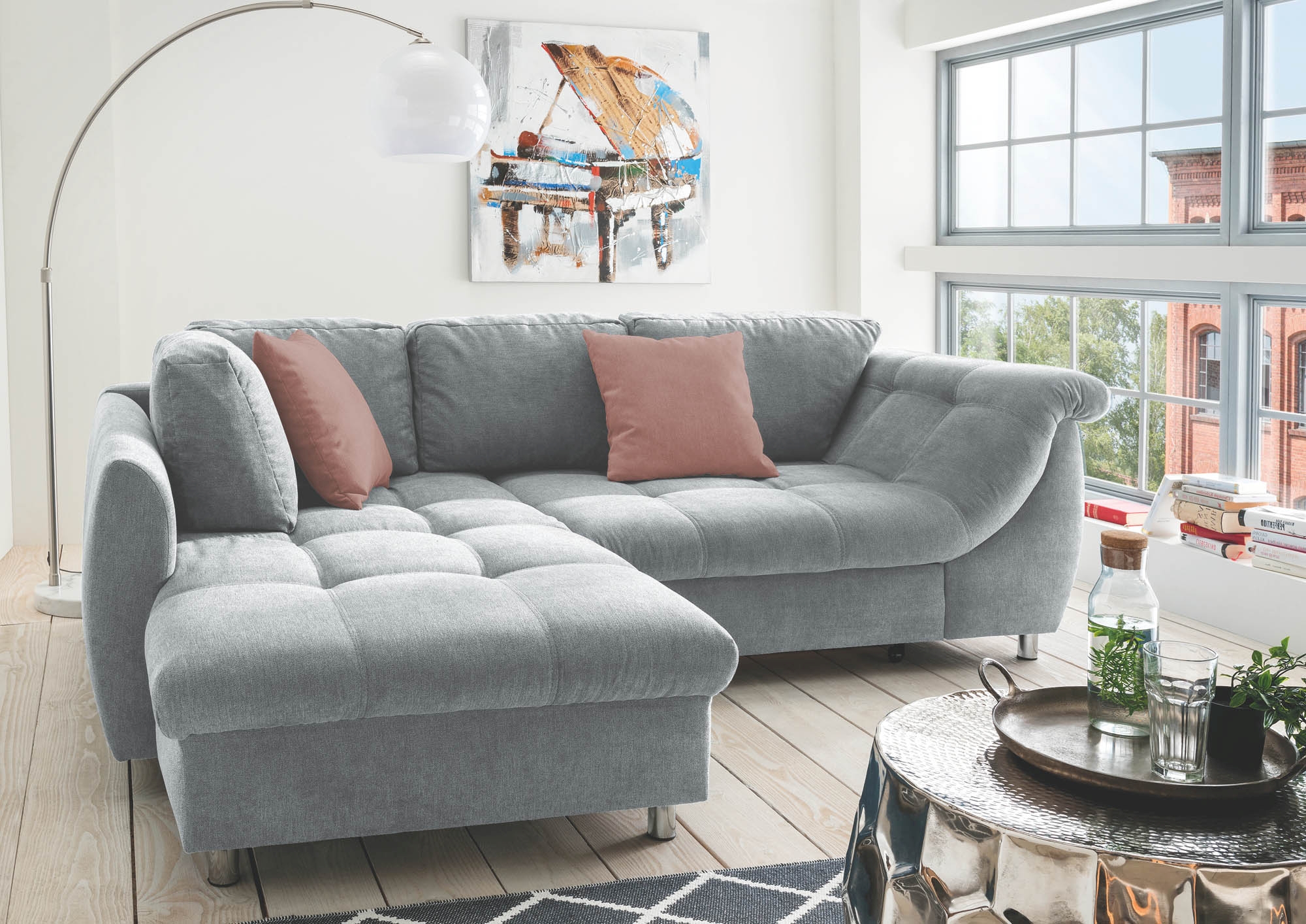 Bezug: Wohnlandschaft im Stoff Tonia in der Farbe grau aus 95% Polyester und 5% Nylon; Zierkissen im Stoff Mango in der Farbe flamingo aus 100% Polyester