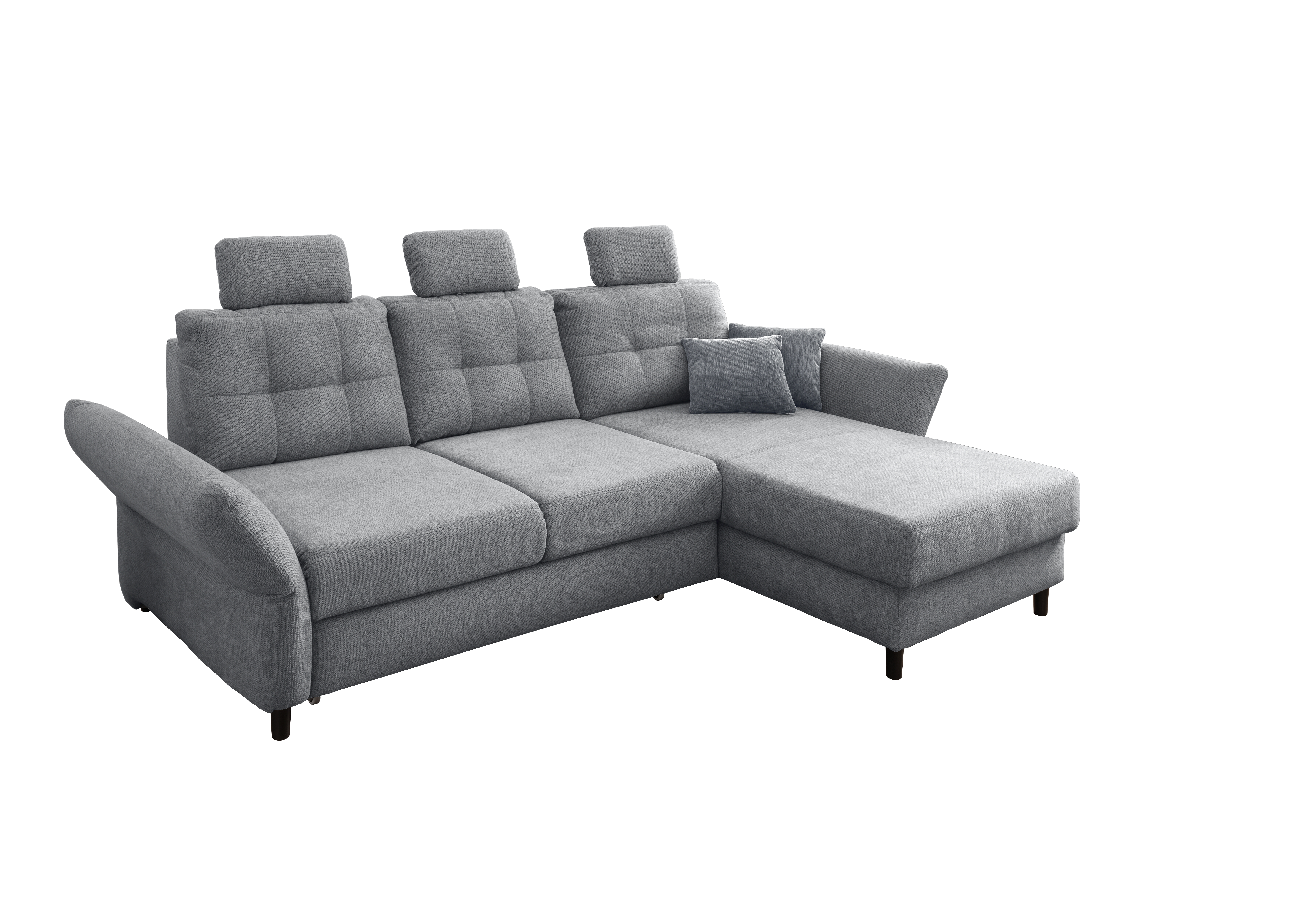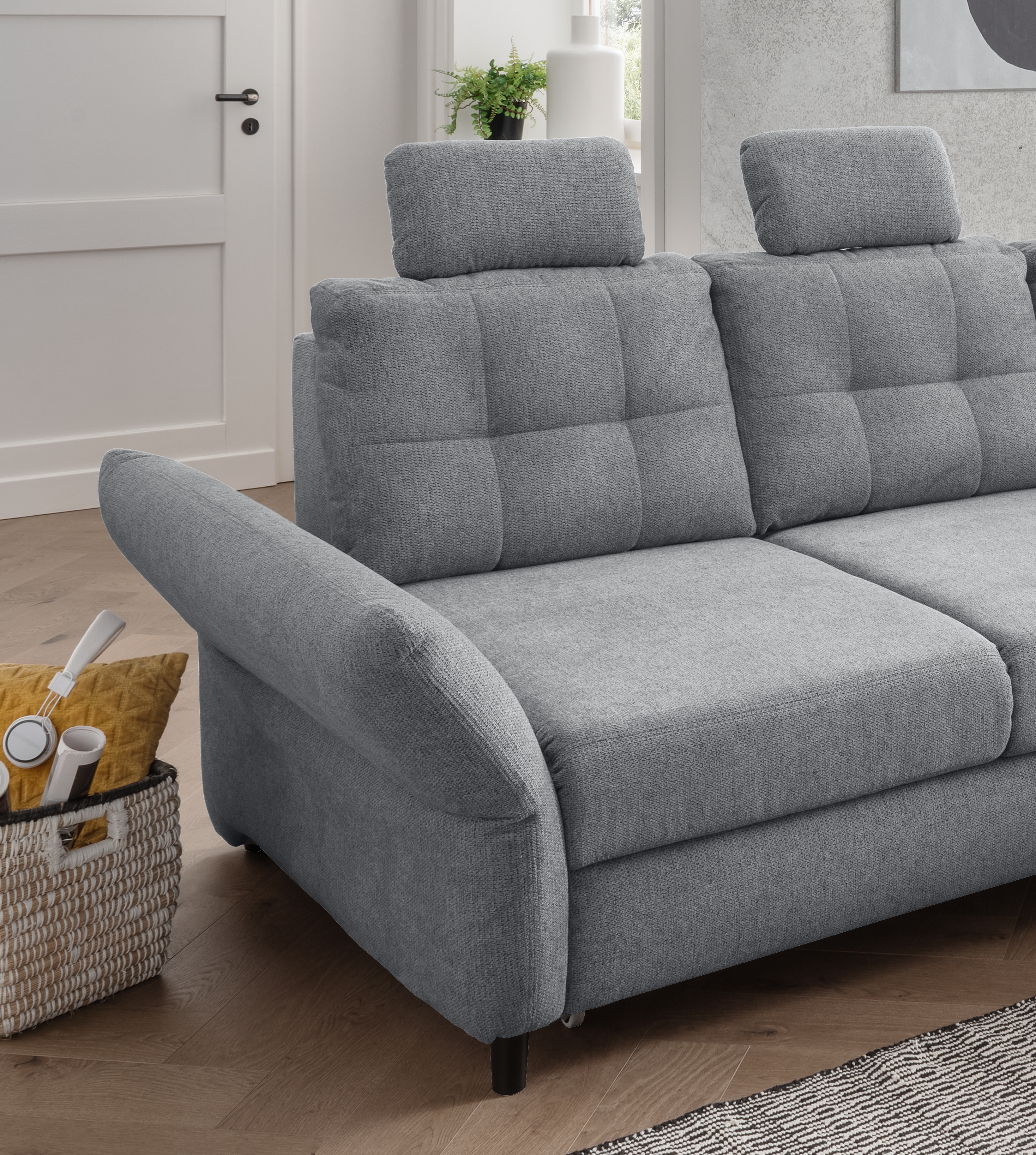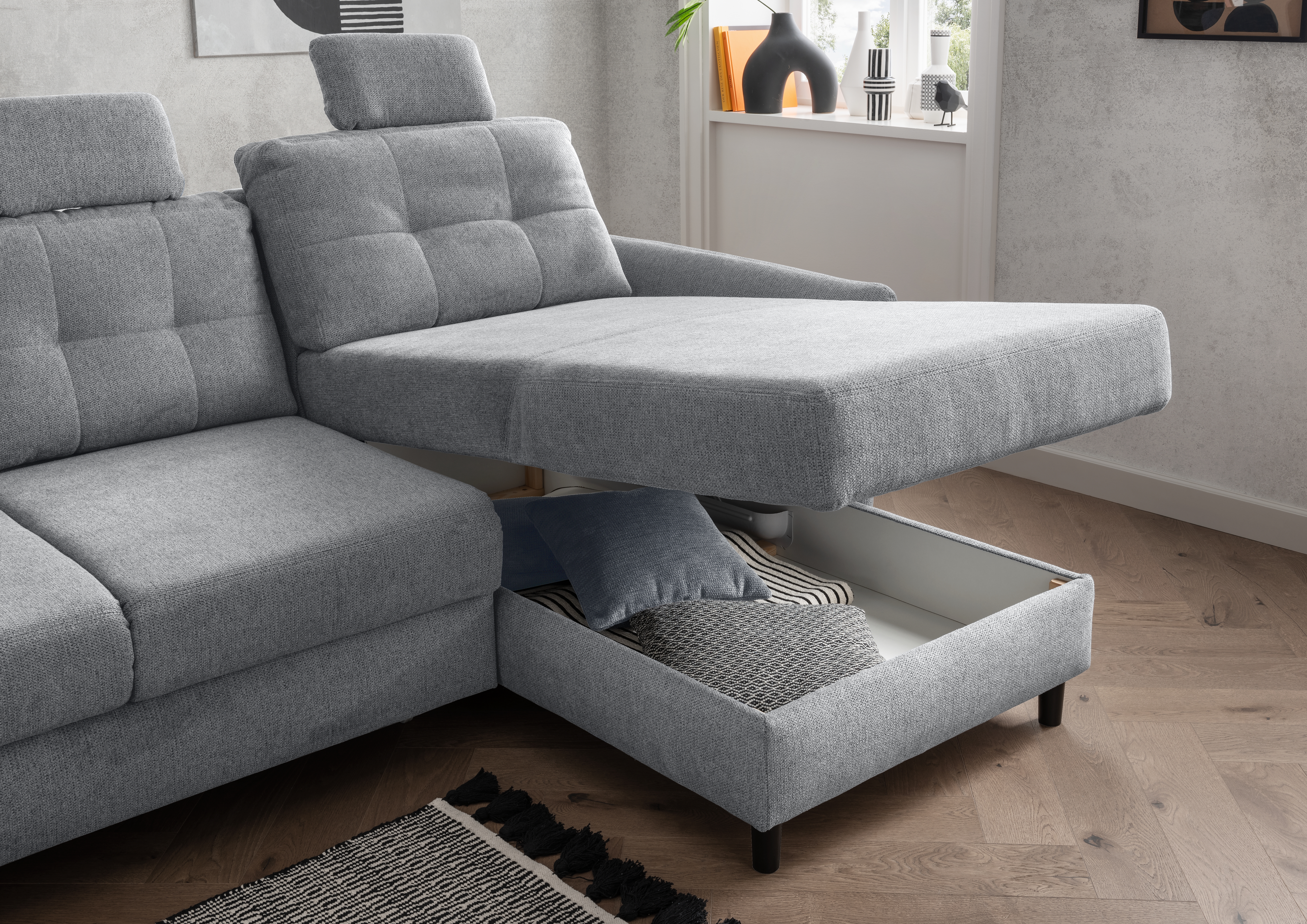 | Ausstattung Polster: | Ottomane rechts, Rücken echt, inkl. Bettkasten, inkl. Kissen | ||