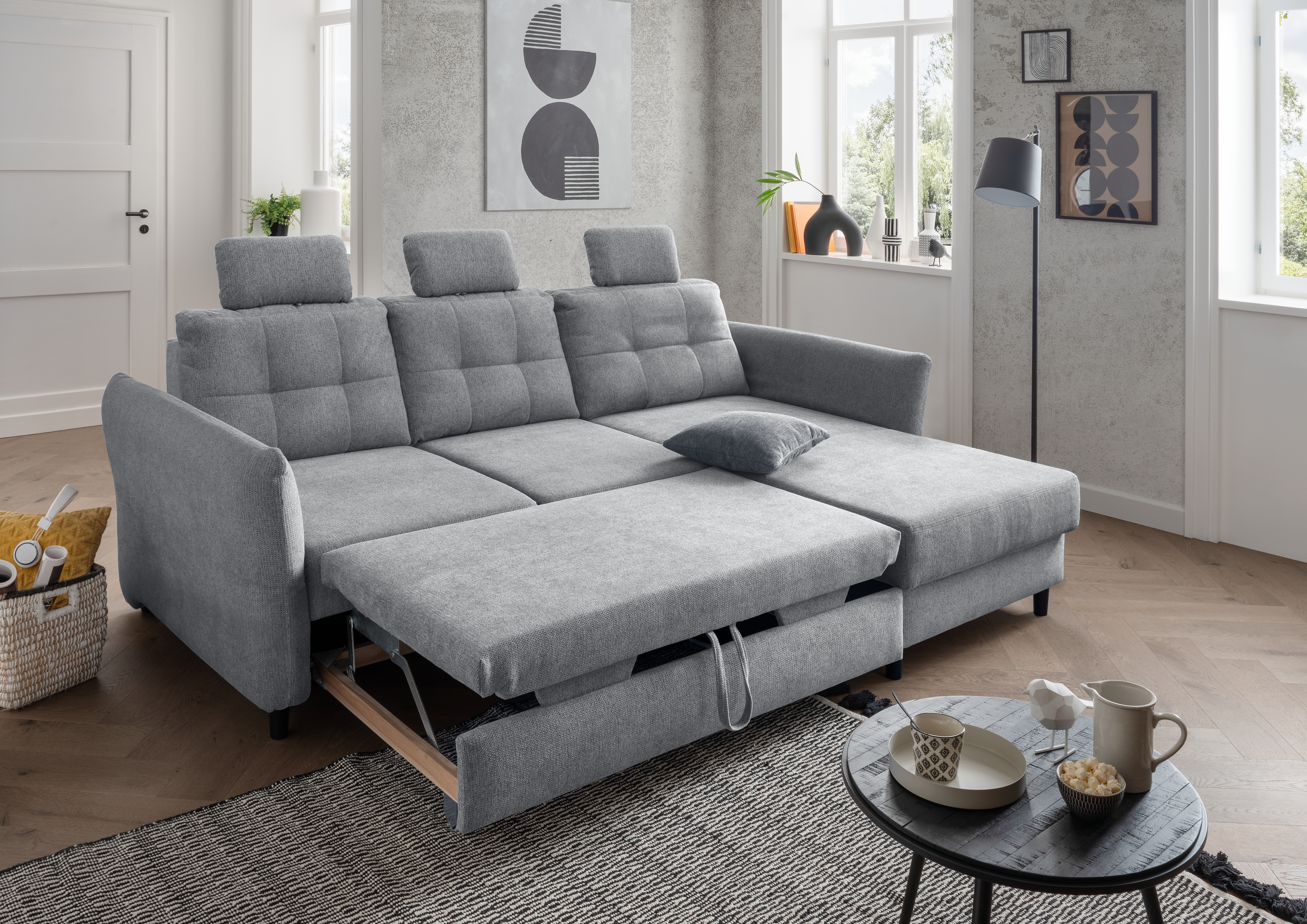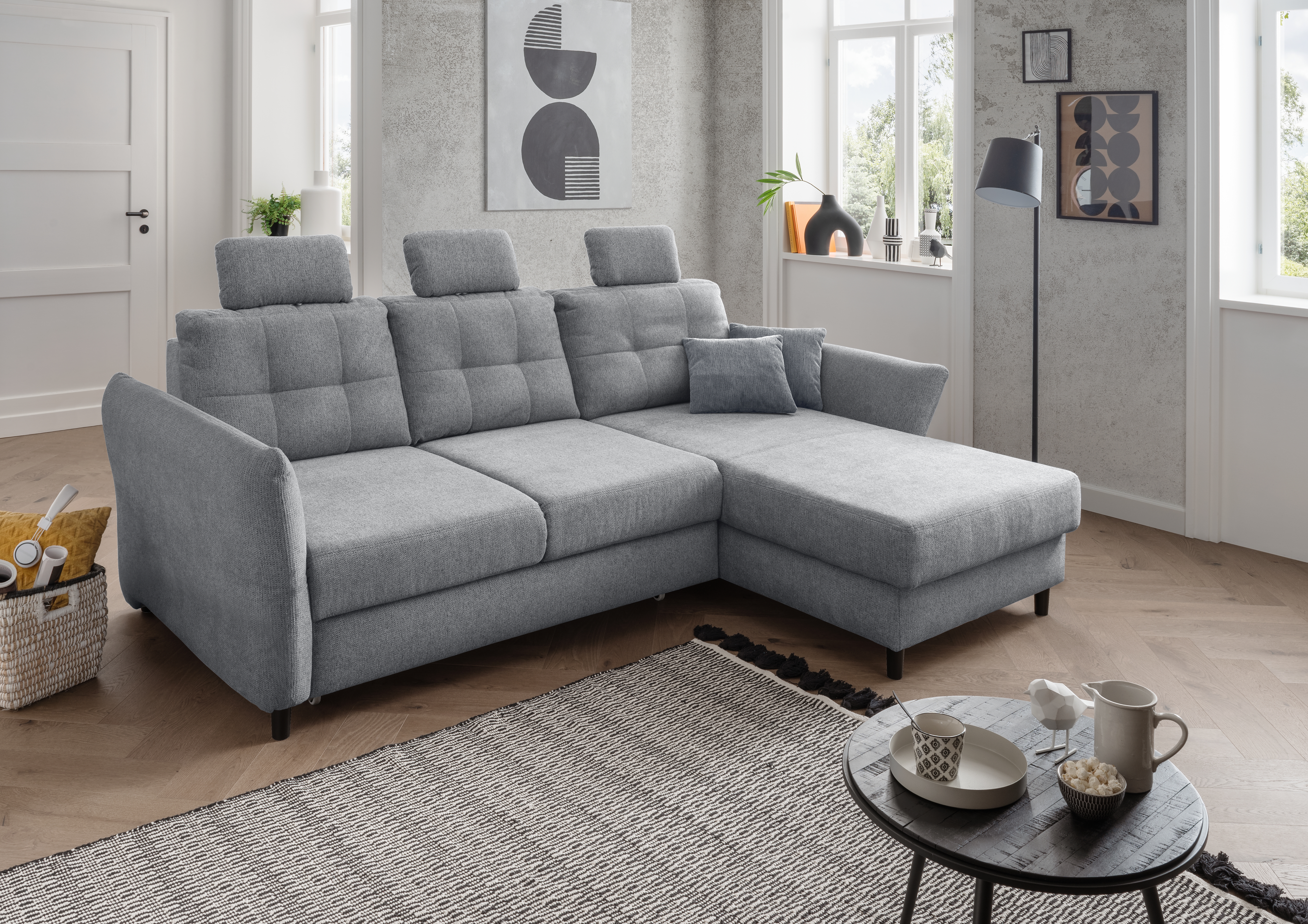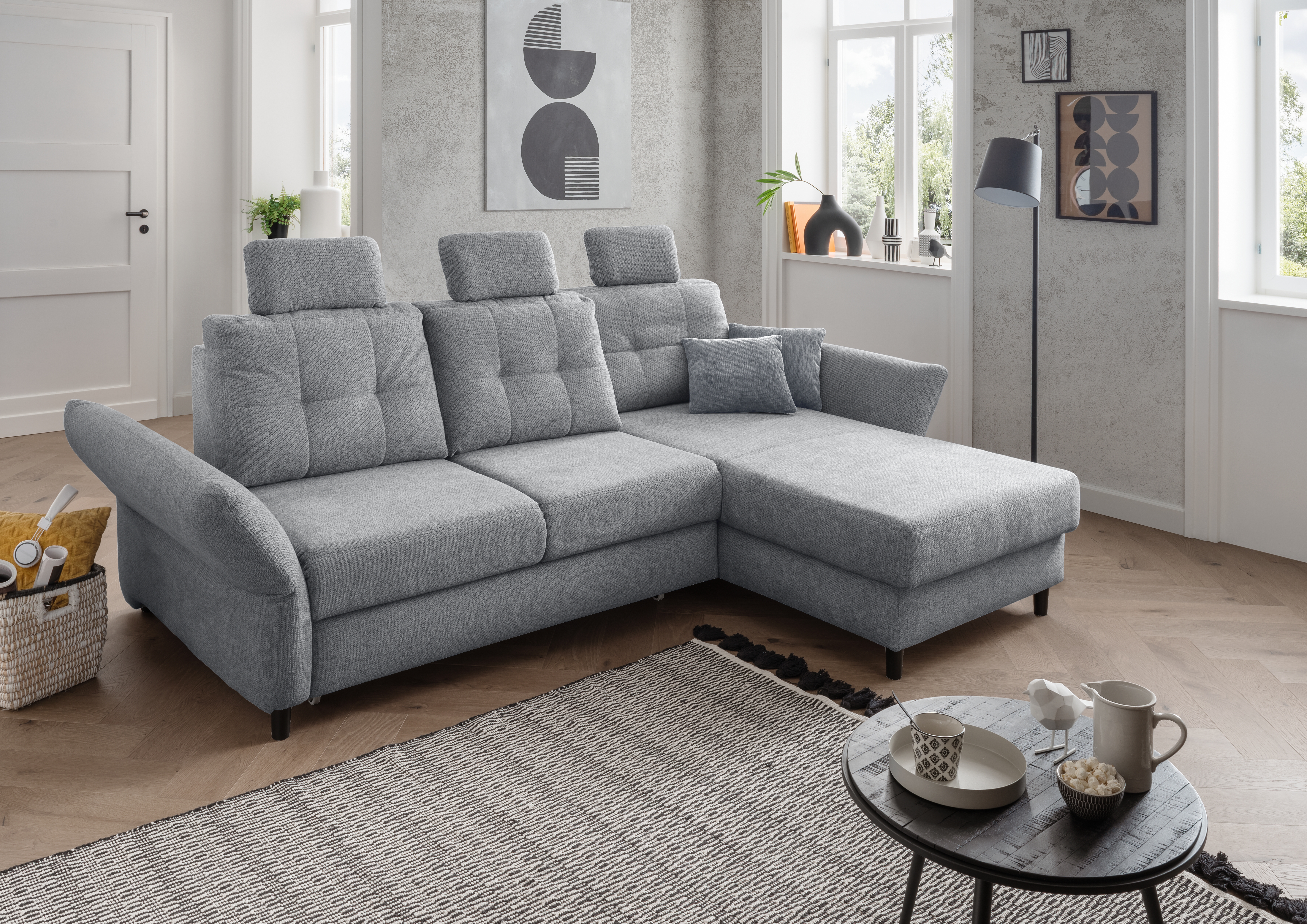 | Ausstattung Polster: | Ottomane rechts, Rücken echt, inkl. Bettkasten, inkl. Kissen | ||