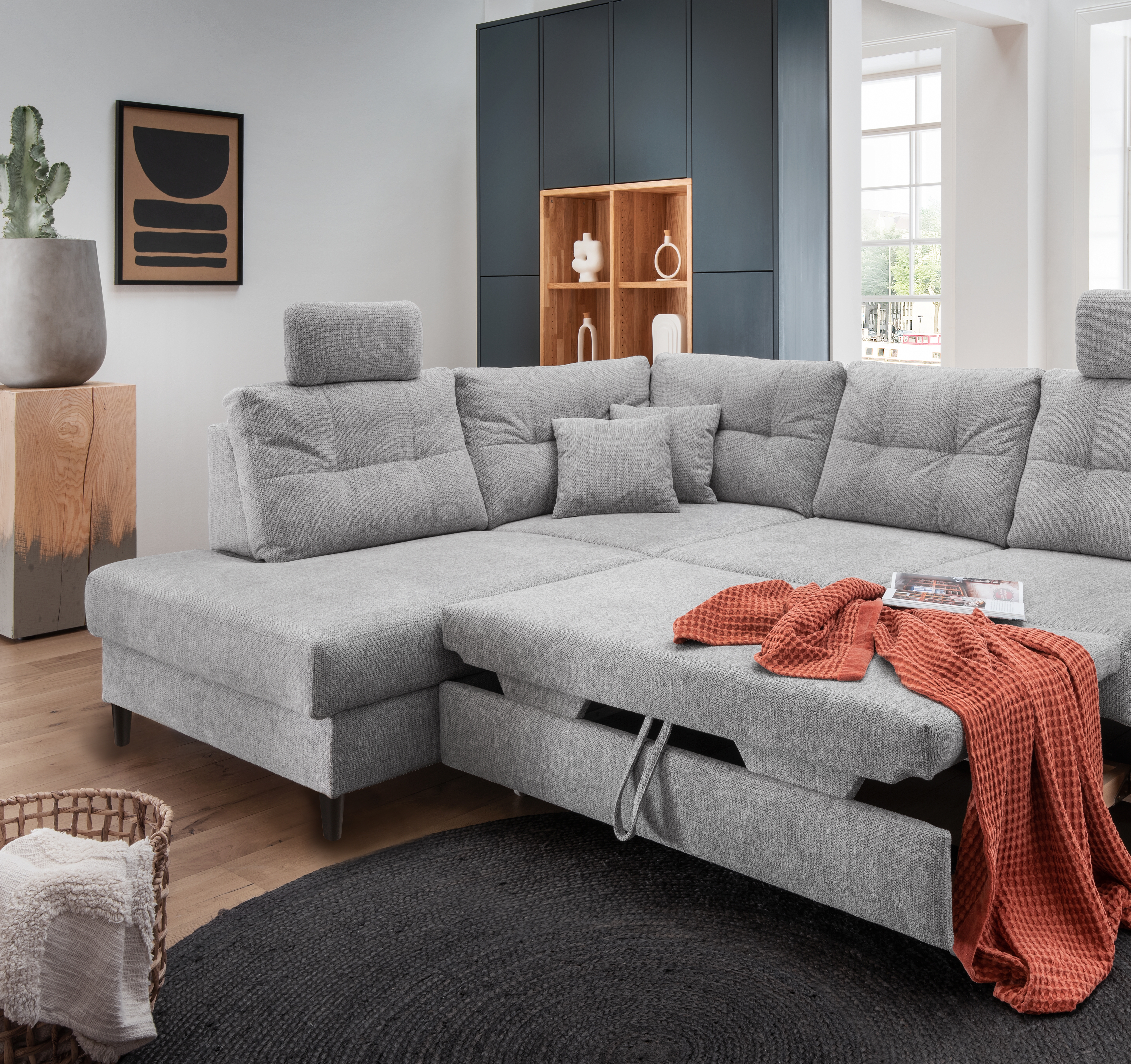 | Ausstattung Polster: | Kopfstützen, Ottomane links, Rücken echt, inkl. Bettkasten, inkl. Kissen | ||
