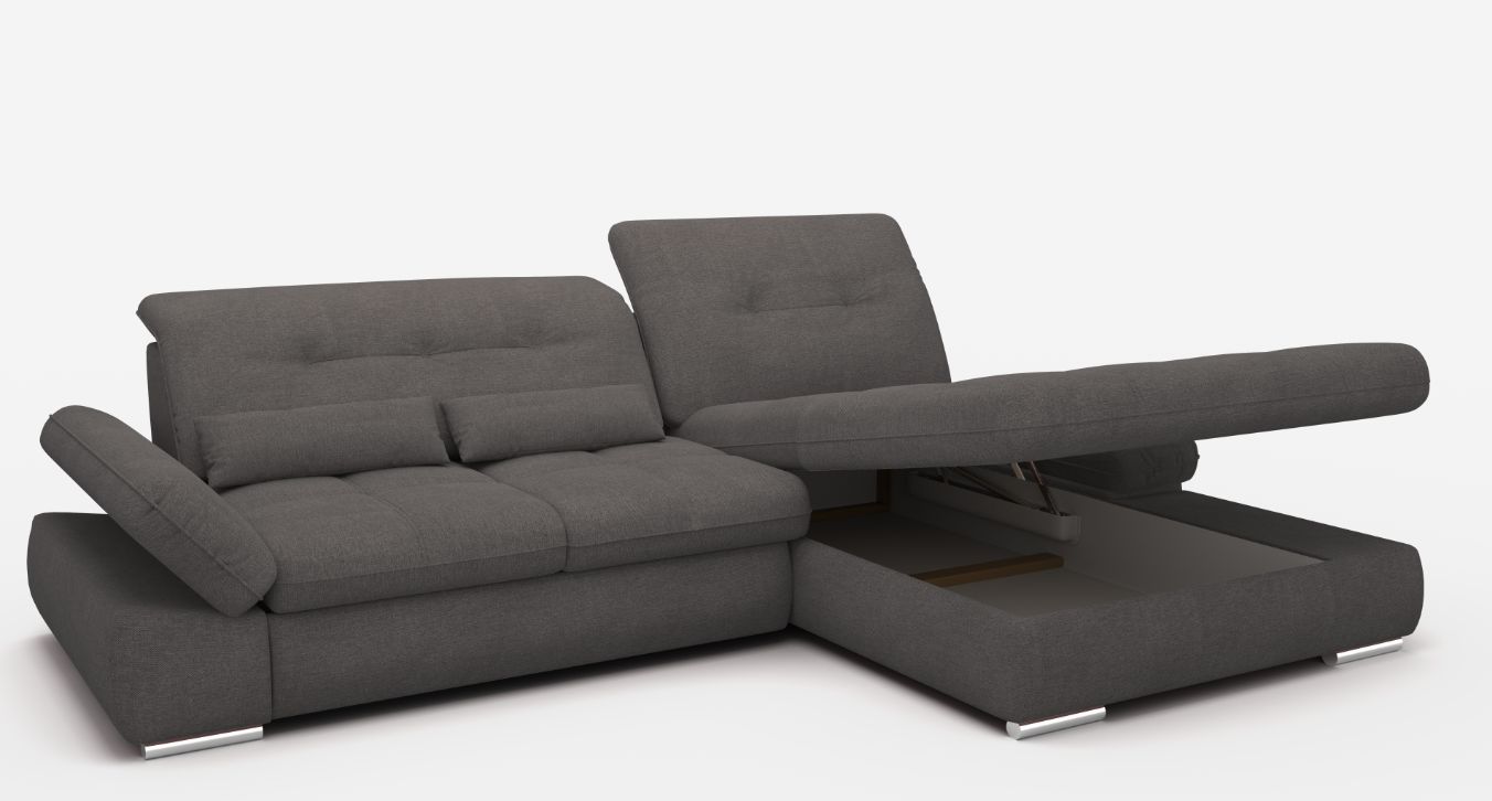| Ausstattung Polster: | Kopfstützen, Ottomane rechts, Sitzvorzug manuell, inkl. Bettkasten, inkl. Kissen | ||