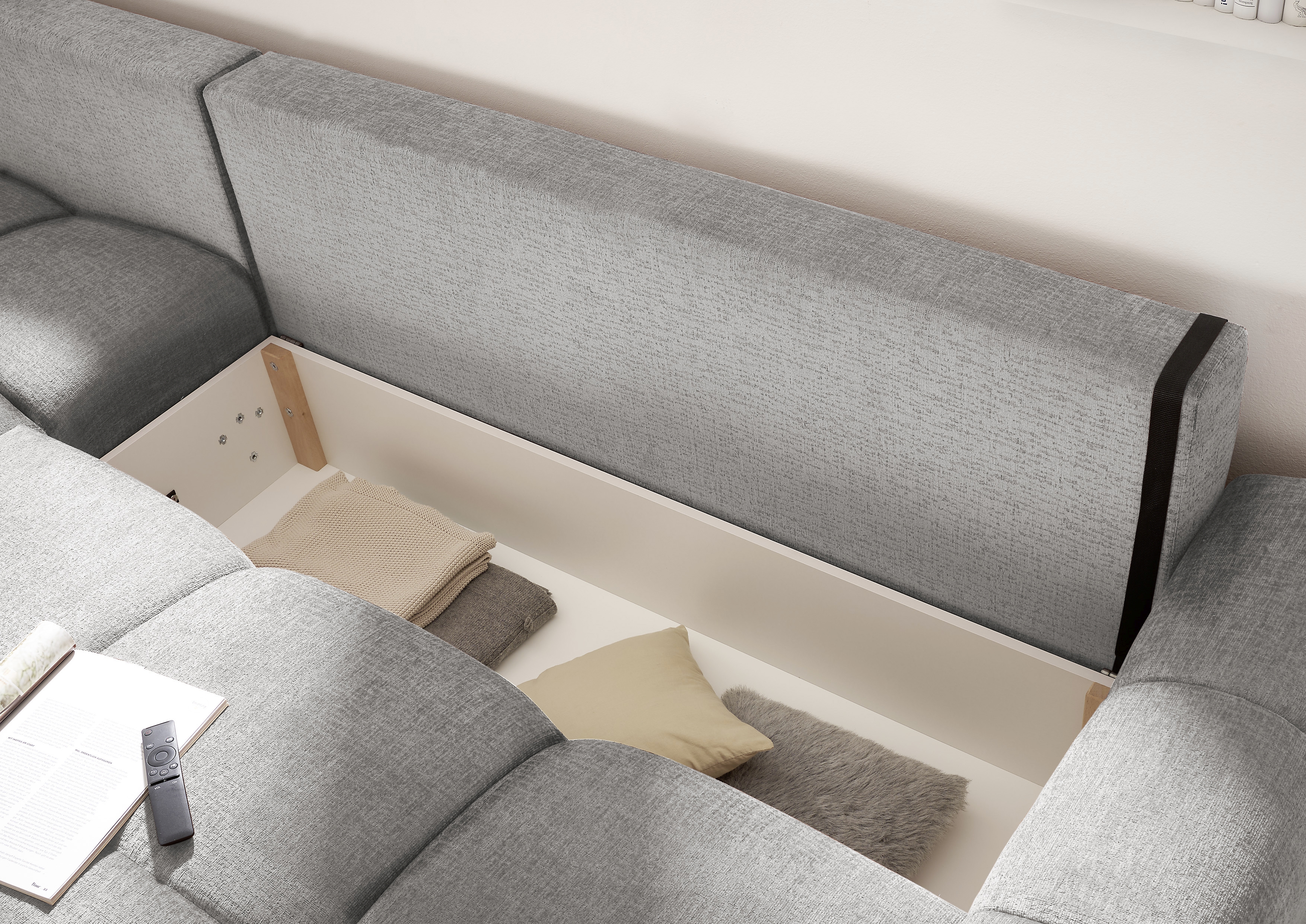 | Ausstattung Polster: | Ottomane links, Rücken echt, inkl. Bettkasten, inkl. Kissen | ||