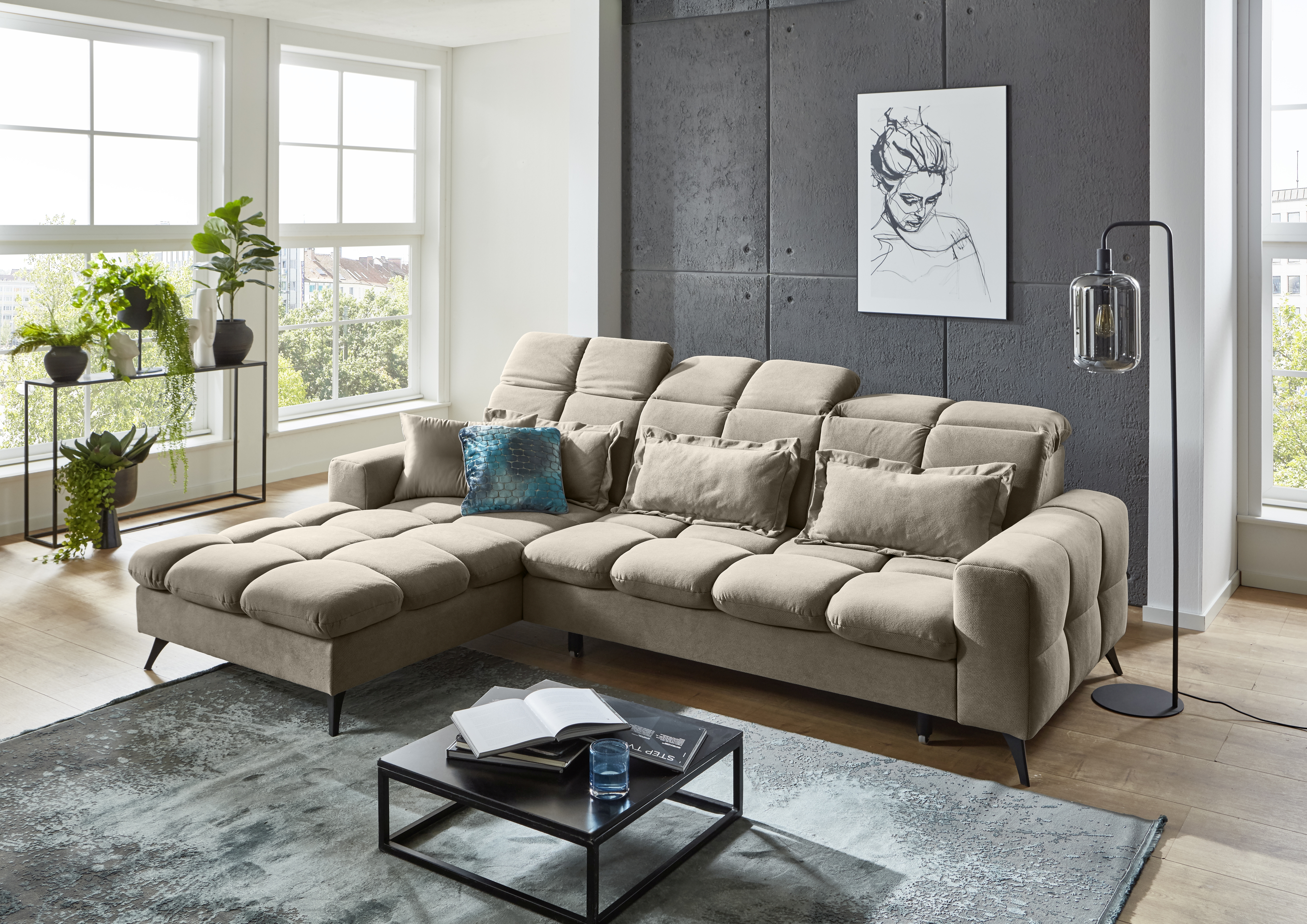 | Ausstattung Polster: | Kopfstützen, Ottomane links, Rücken echt, Sitzvorzug manuell, inkl. Kissen | ||